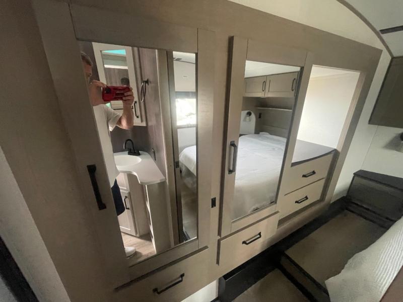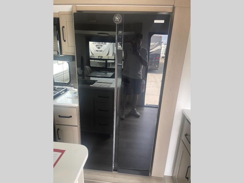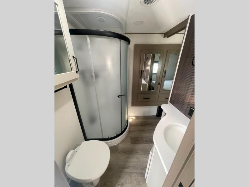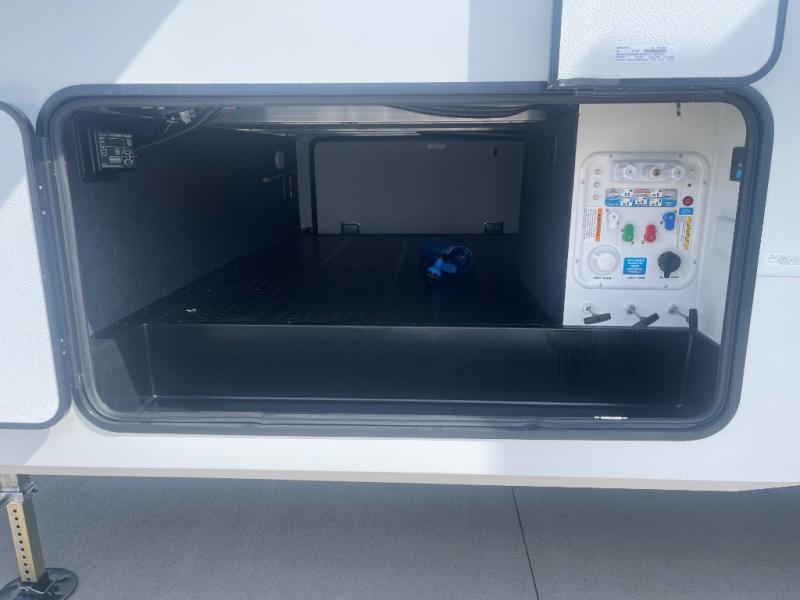 Whether you travel for pleasure or work, you will love the spacious main living and kitchen area with a rear tri-fold sofa that doubles as extra sleeping space, and the theater seating directly across from the entertainment center with a 40" LED HDTV and a fireplace below. The kitchen island will make meal prepping and drying the dishes easier and the hutch is the perfect place to place your picture frames, nice dishes, and extra cooking items. There is even a pantry that is big enough to store all of your favorite snacks, dry ingredients and such. Outside you can enjoy two electric awnings that provide protection from the elements as you relax and visit with other RVers, and your camping chairs can easily be stored in the pass-through compartment. The double entry bathroom is convenient especially at night when you can slide the door to enter from the front master bedroom. You will find plenty of storage for your clothing and gear, plus the bedroom slide out gives you drawers and linen storage that stretches into the full bathroom.