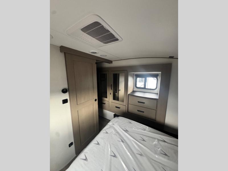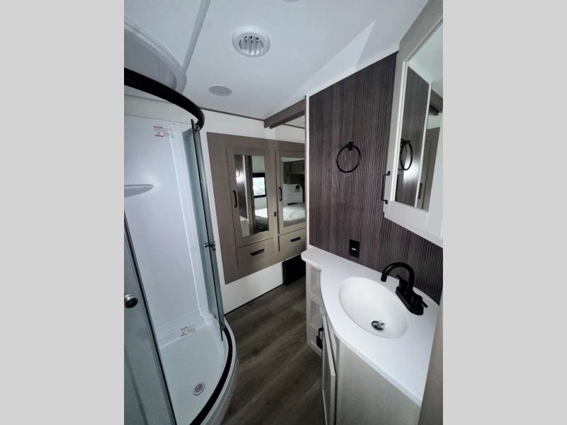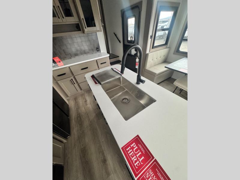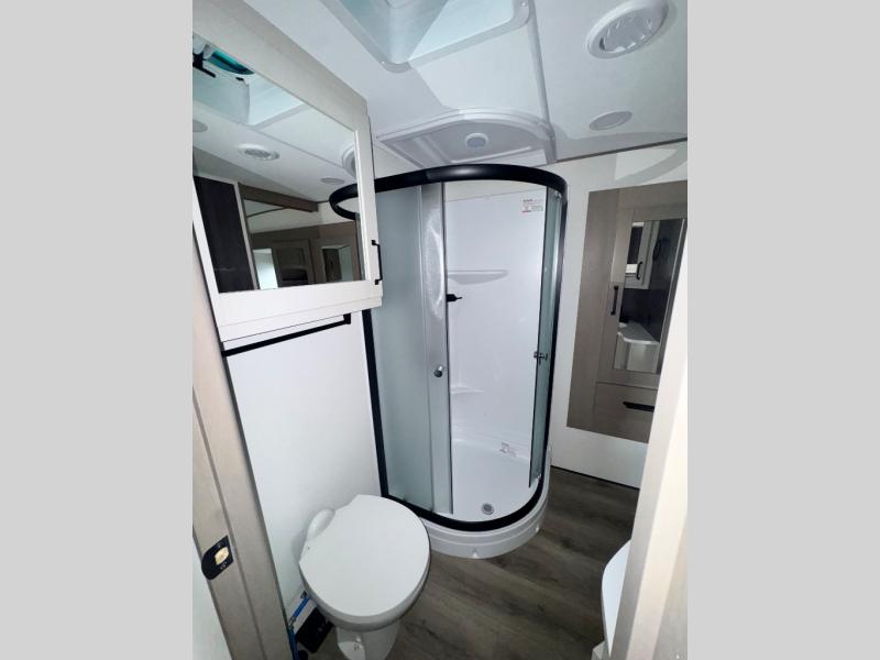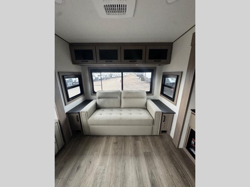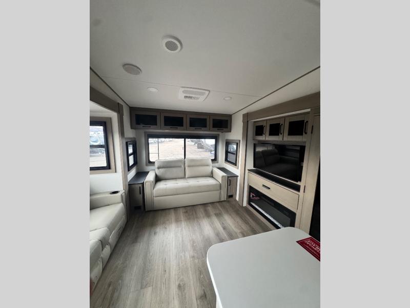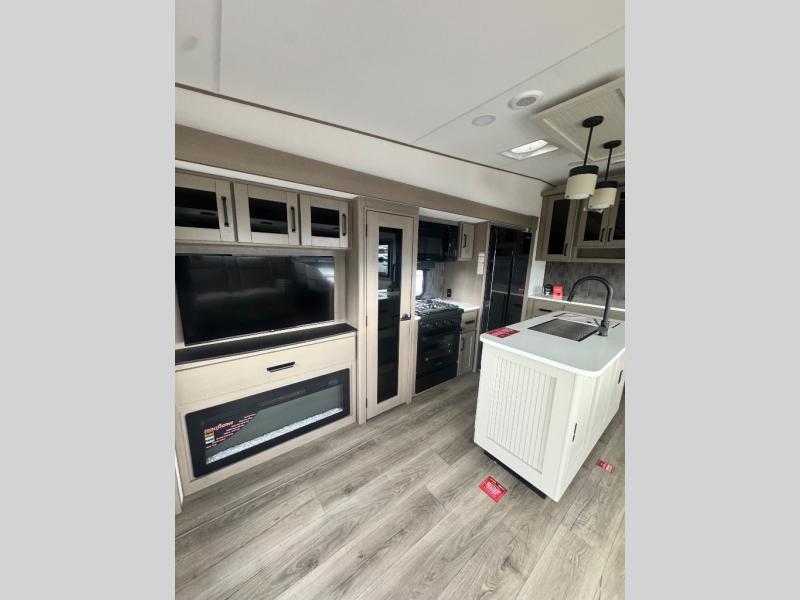 Whether you travel for pleasure or work, you will love the spacious main living and kitchen area with a rear tri-fold sofa that doubles as extra sleeping space, and the theater seating directly across from the entertainment center with a 40" LED HDTV and a fireplace below. The kitchen island will make meal prepping and drying the dishes easier and the hutch is the perfect place to place your picture frames, nice dishes, and extra cooking items. There is even a pantry that is big enough to store all of your favorite snacks, dry ingredients and such. Outside you can enjoy two electric awnings that provide protection from the elements as you relax and visit with other RVers, and your camping chairs can easily be stored in the pass-through compartment. The double entry bathroom is convenient especially at night when you can slide the door to enter from the front master bedroom. You will find plenty of storage for your clothing and gear, plus the bedroom slide out gives you drawers and linen storage that stretches into the full bathroom.