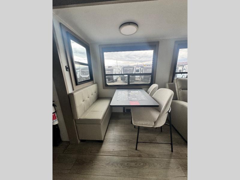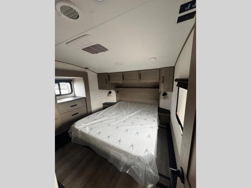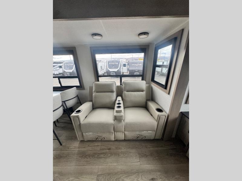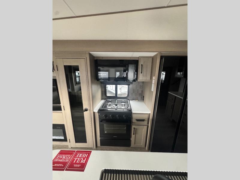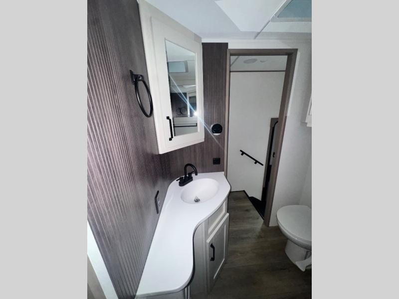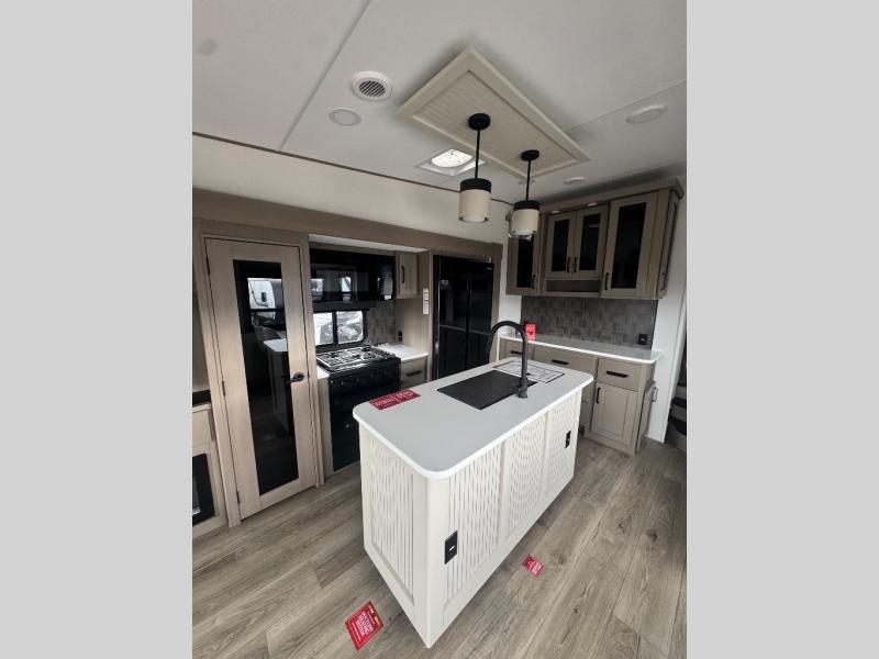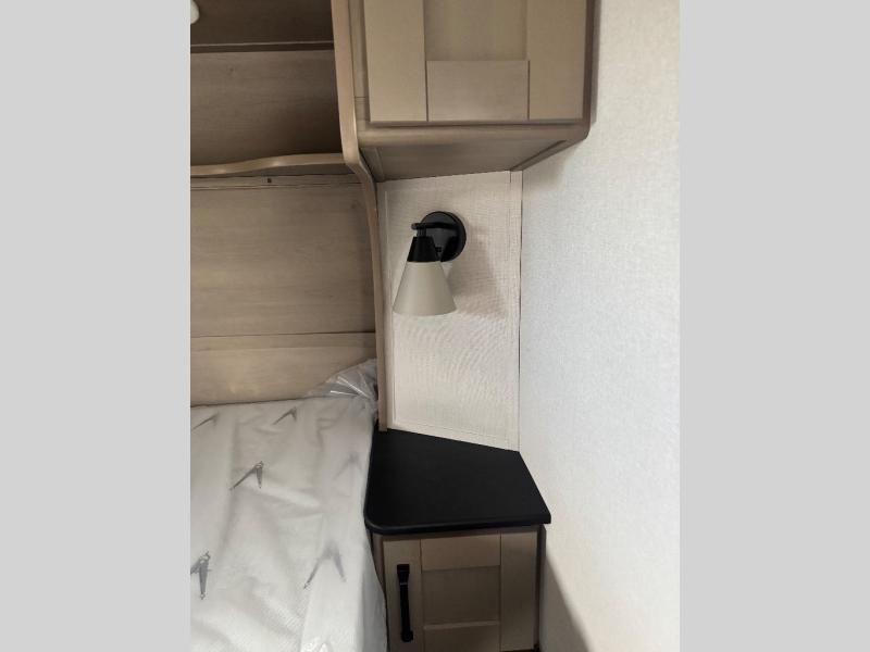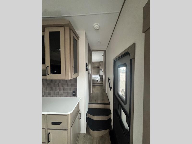Whether you travel for pleasure or work, you will love the spacious main living and kitchen area with a rear tri-fold sofa that doubles as extra sleeping space, and the theater seating directly across from the entertainment center with a 40" LED HDTV and a fireplace below. The kitchen island will make meal prepping and drying the dishes easier and the hutch is the perfect place to place your picture frames, nice dishes, and extra cooking items. There is even a pantry that is big enough to store all of your favorite snacks, dry ingredients and such. Outside you can enjoy two electric awnings that provide protection from the elements as you relax and visit with other RVers, and your camping chairs can easily be stored in the pass-through compartment. The double entry bathroom is convenient especially at night when you can slide the door to enter from the front master bedroom. You will find plenty of storage for your clothing and gear, plus the bedroom slide out gives you drawers and linen storage that stretches into the full bathroom.
