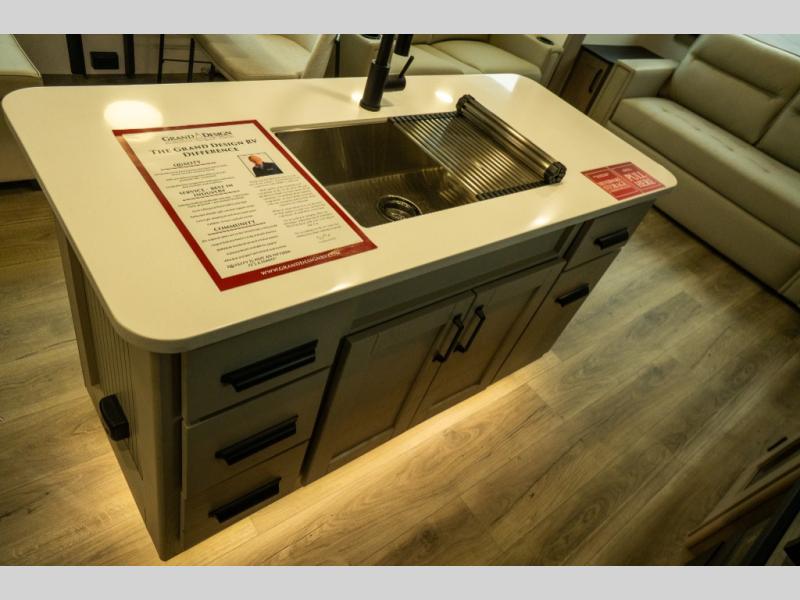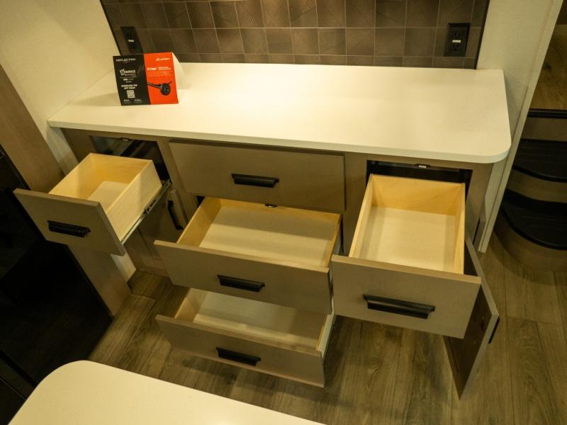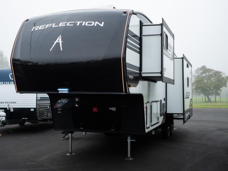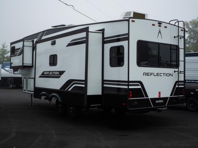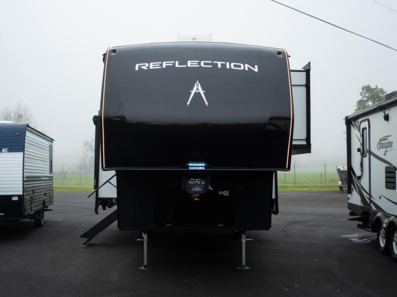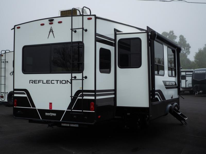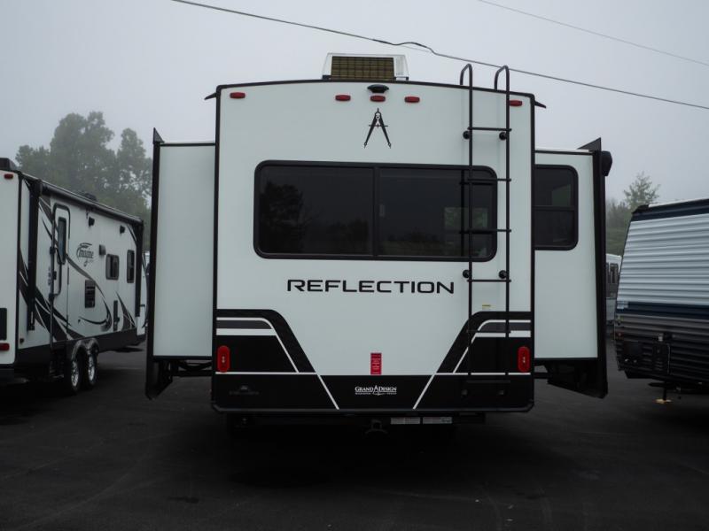 With any Reflection fifth wheel by Grand Design, you will have a solar panel for off-grid camping and a 60 amp charge controller and inverter prep, a Universal All-In-One docking station, unobstructed pass-through storage, and Goodyear Endurance tires. Each is constructed of gel coat exterior sidewalls, residential 5" truss rafters, walk-on roof decking, a fiberglass and radiant foil roof and front cap insulation plus laminated aluminum framed side walls, roof and end walls in slide rooms. Head inside to enjoy residential hardwood cabinet doors, premium Congoleum flooring, a spacious shower with a glass door, and many more comforts!