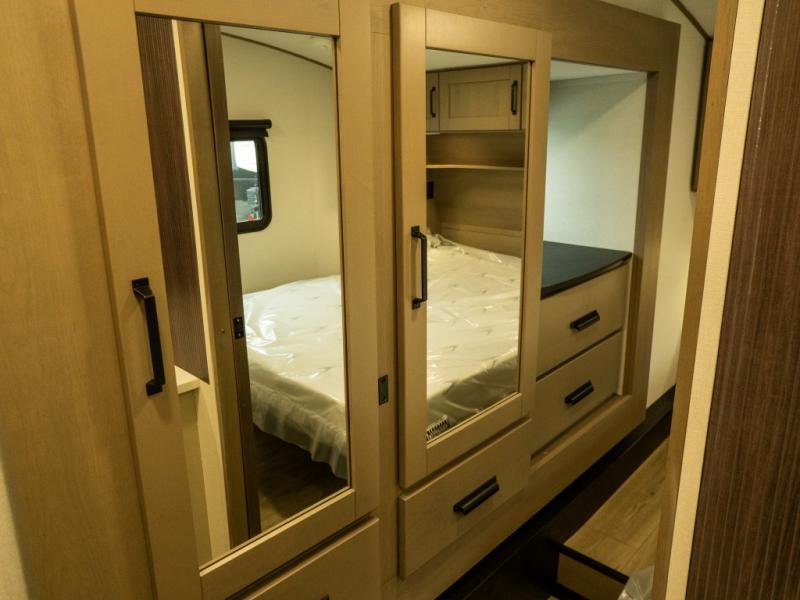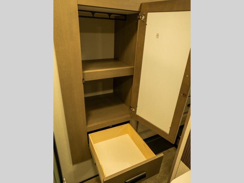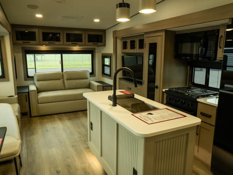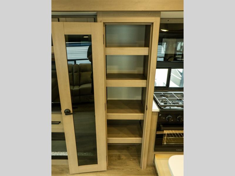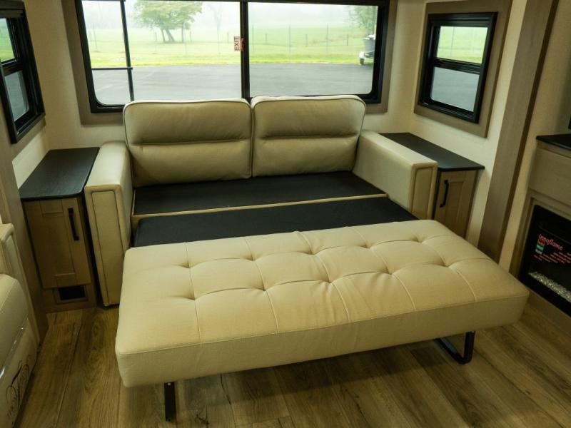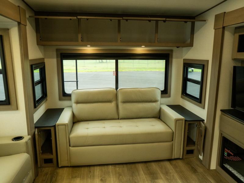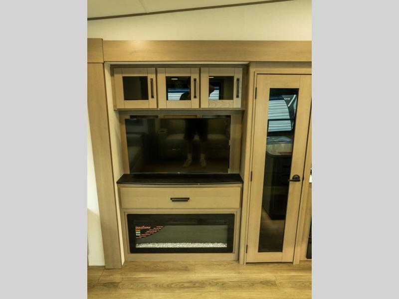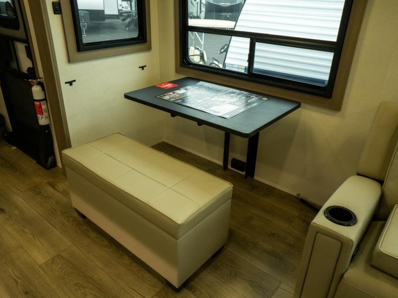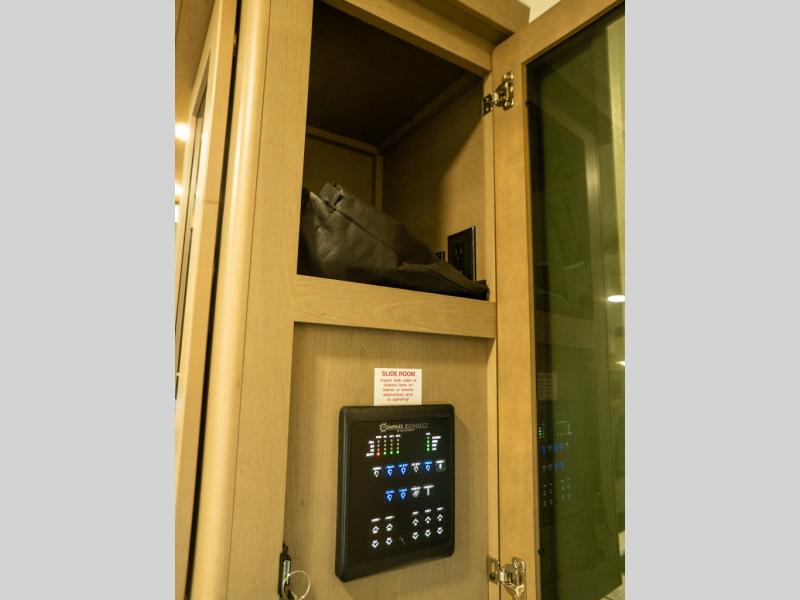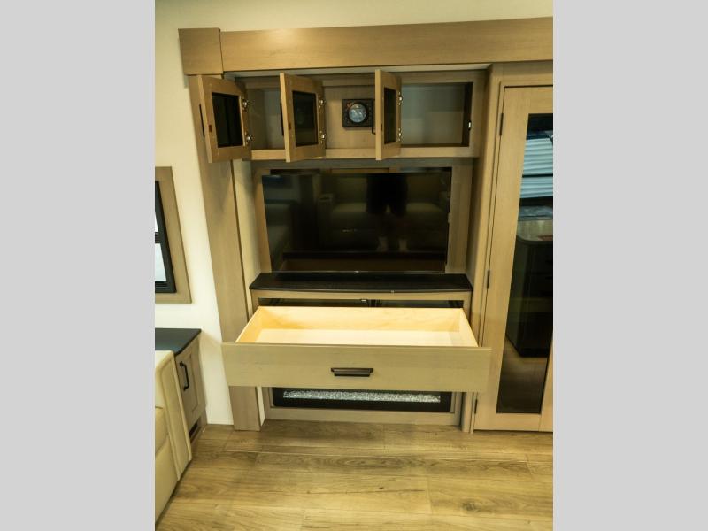 Whether you travel for pleasure or work, you will love the spacious main living and kitchen area with a rear tri-fold sofa that doubles as extra sleeping space, and the theater seating directly across from the entertainment center with a 40" LED HDTV and a fireplace below. The kitchen island will make meal prepping and drying the dishes easier and the hutch is the perfect place to place your picture frames, nice dishes, and extra cooking items. There is even a pantry that is big enough to store all of your favorite snacks, dry ingredients and such. Outside you can enjoy two electric awnings that provide protection from the elements as you relax and visit with other RVers, and your camping chairs can easily be stored in the pass-through compartment. The double entry bathroom is convenient especially at night when you can slide the door to enter from the front master bedroom. You will find plenty of storage for your clothing and gear, plus the bedroom slide out gives you drawers and linen storage that stretches into the full bathroom.