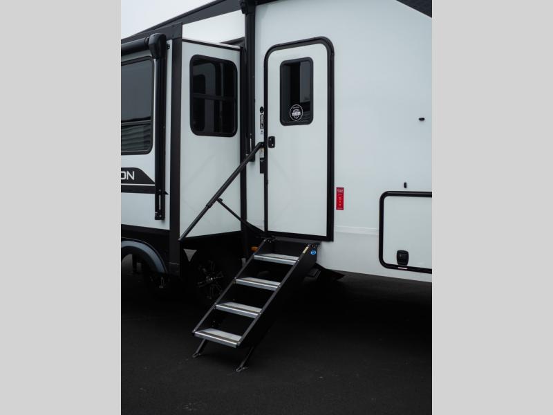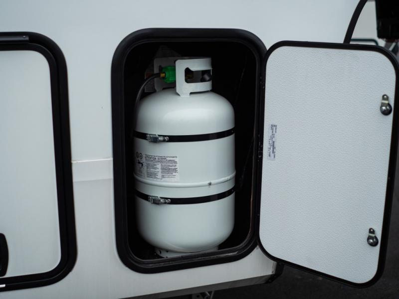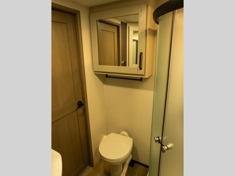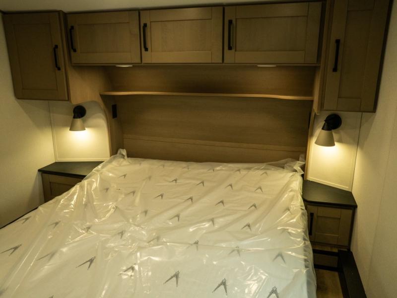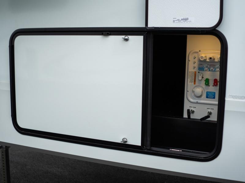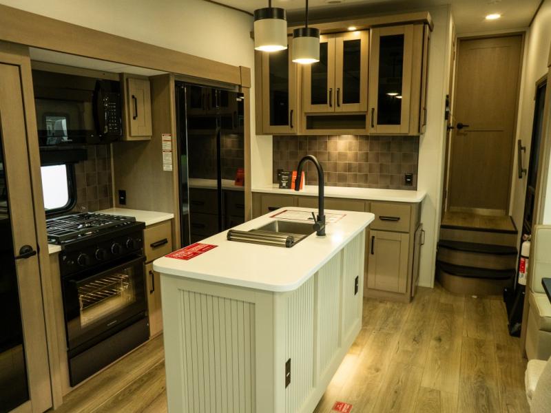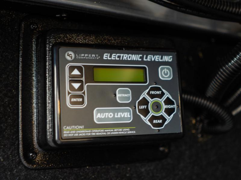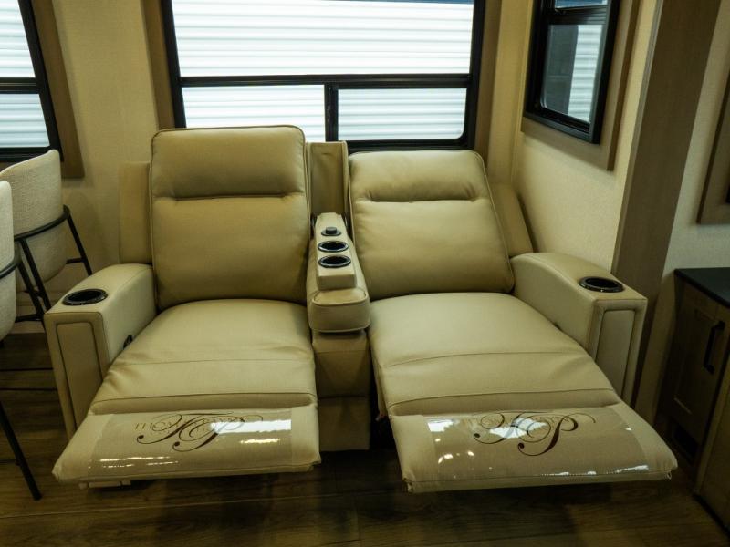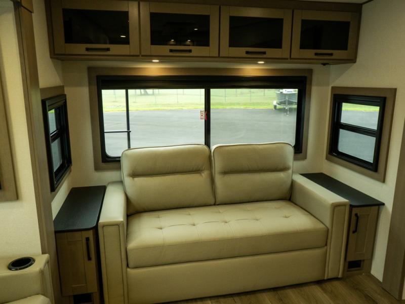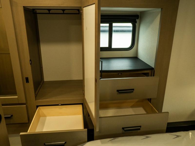 Whether you travel for pleasure or work, you will love the spacious main living and kitchen area with a rear tri-fold sofa that doubles as extra sleeping space, and the theater seating directly across from the entertainment center with a 40" LED HDTV and a fireplace below. The kitchen island will make meal prepping and drying the dishes easier and the hutch is the perfect place to place your picture frames, nice dishes, and extra cooking items. There is even a pantry that is big enough to store all of your favorite snacks, dry ingredients and such. Outside you can enjoy two electric awnings that provide protection from the elements as you relax and visit with other RVers, and your camping chairs can easily be stored in the pass-through compartment. The double entry bathroom is convenient especially at night when you can slide the door to enter from the front master bedroom. You will find plenty of storage for your clothing and gear, plus the bedroom slide out gives you drawers and linen storage that stretches into the full bathroom.