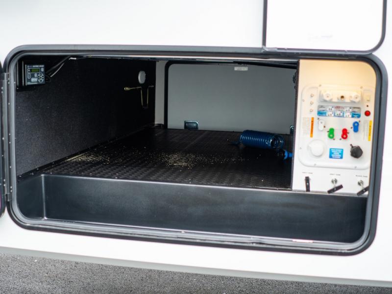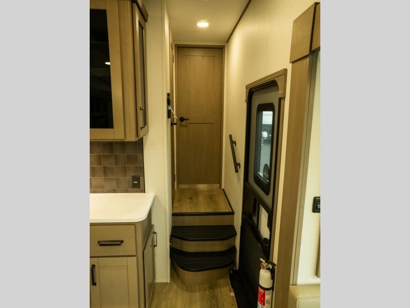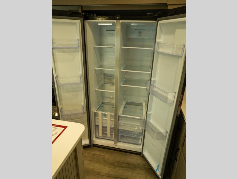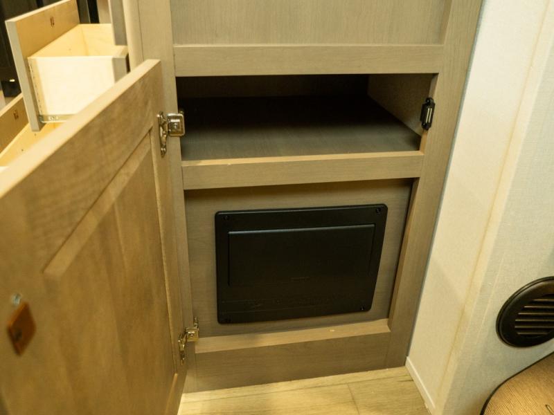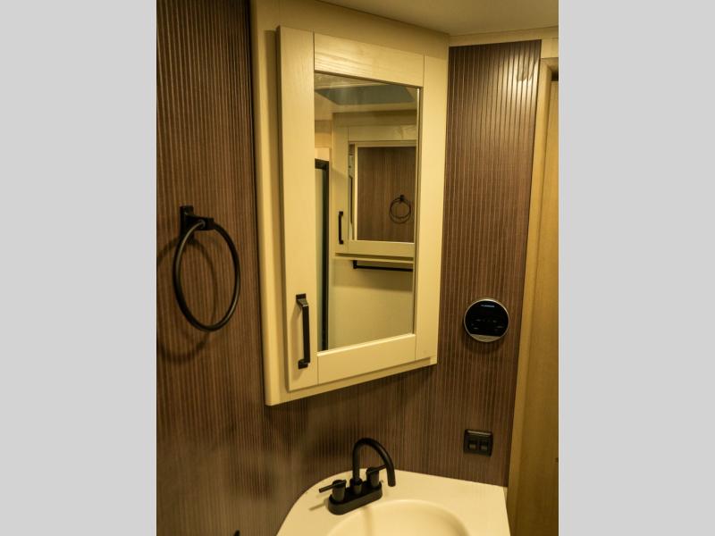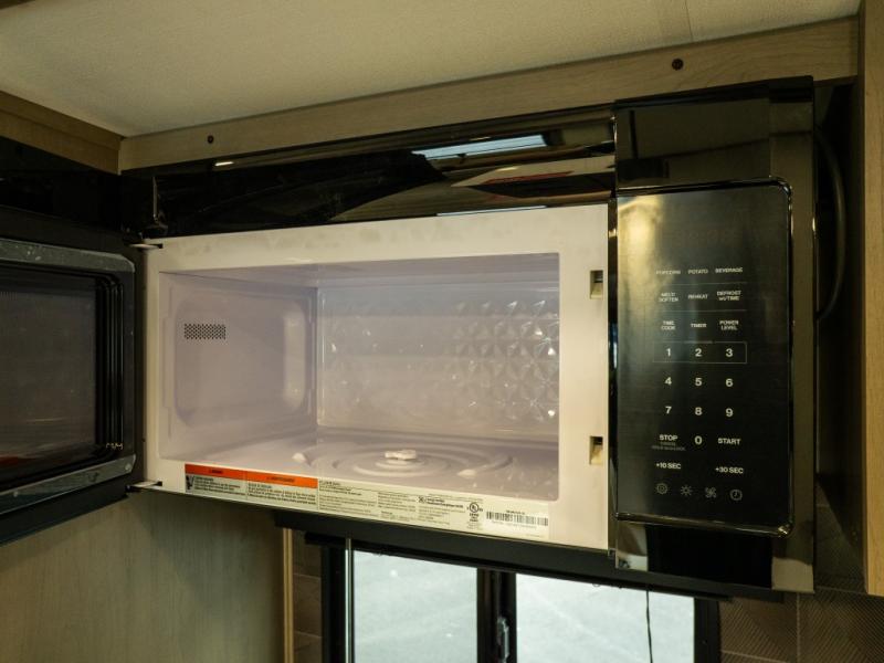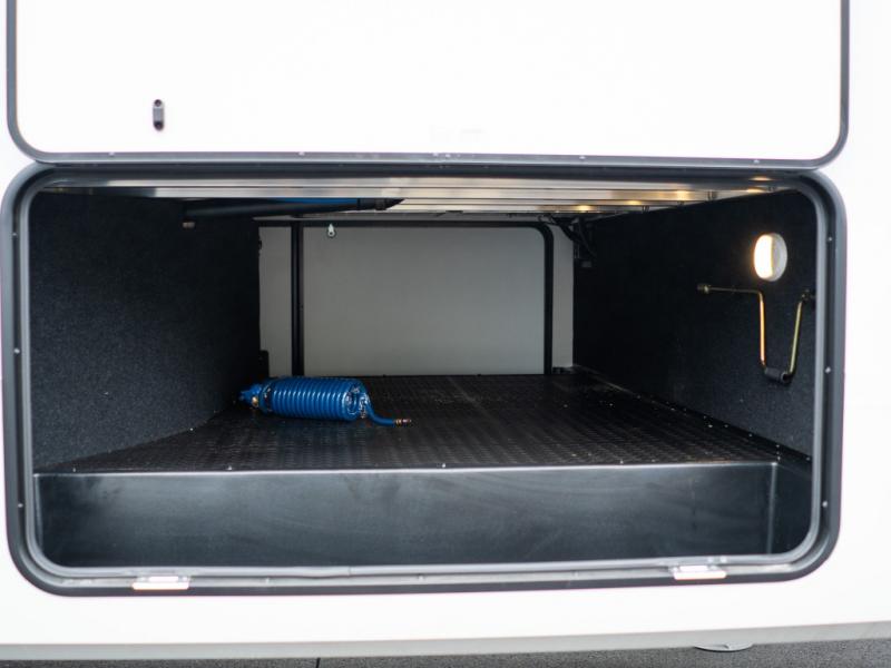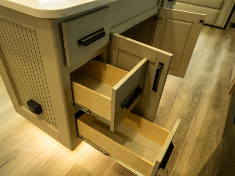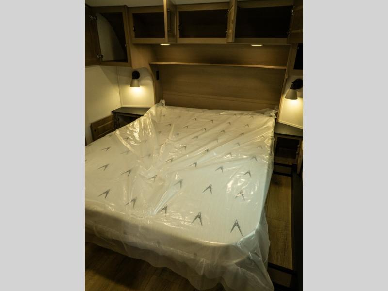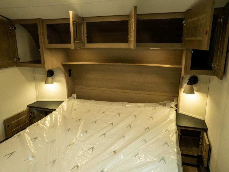 Whether you travel for pleasure or work, you will love the spacious main living and kitchen area with a rear tri-fold sofa that doubles as extra sleeping space, and the theater seating directly across from the entertainment center with a 40" LED HDTV and a fireplace below. The kitchen island will make meal prepping and drying the dishes easier and the hutch is the perfect place to place your picture frames, nice dishes, and extra cooking items. There is even a pantry that is big enough to store all of your favorite snacks, dry ingredients and such. Outside you can enjoy two electric awnings that provide protection from the elements as you relax and visit with other RVers, and your camping chairs can easily be stored in the pass-through compartment. The double entry bathroom is convenient especially at night when you can slide the door to enter from the front master bedroom. You will find plenty of storage for your clothing and gear, plus the bedroom slide out gives you drawers and linen storage that stretches into the full bathroom.