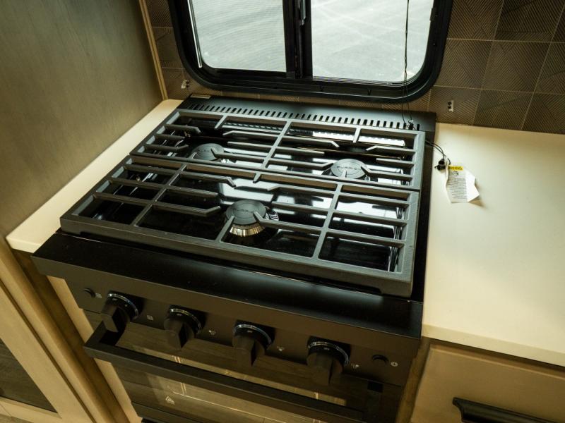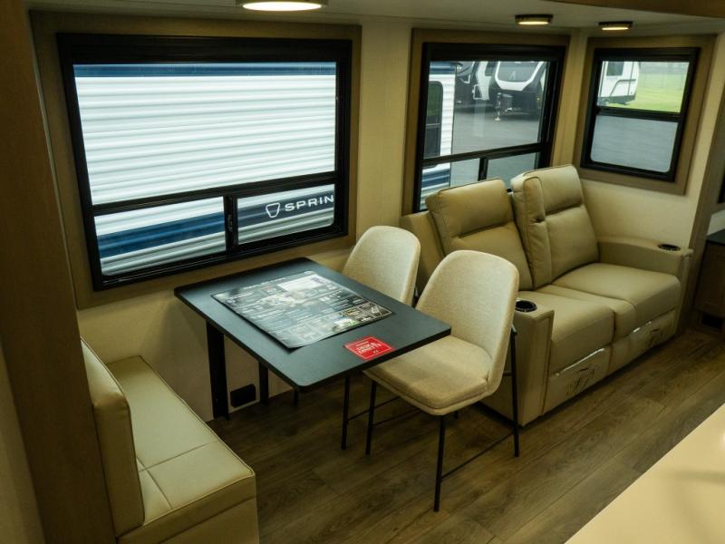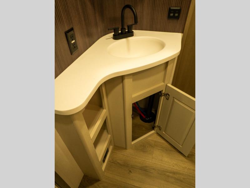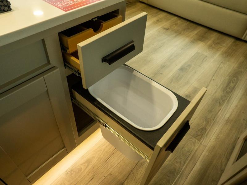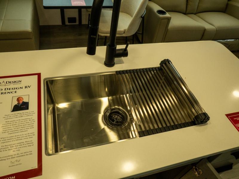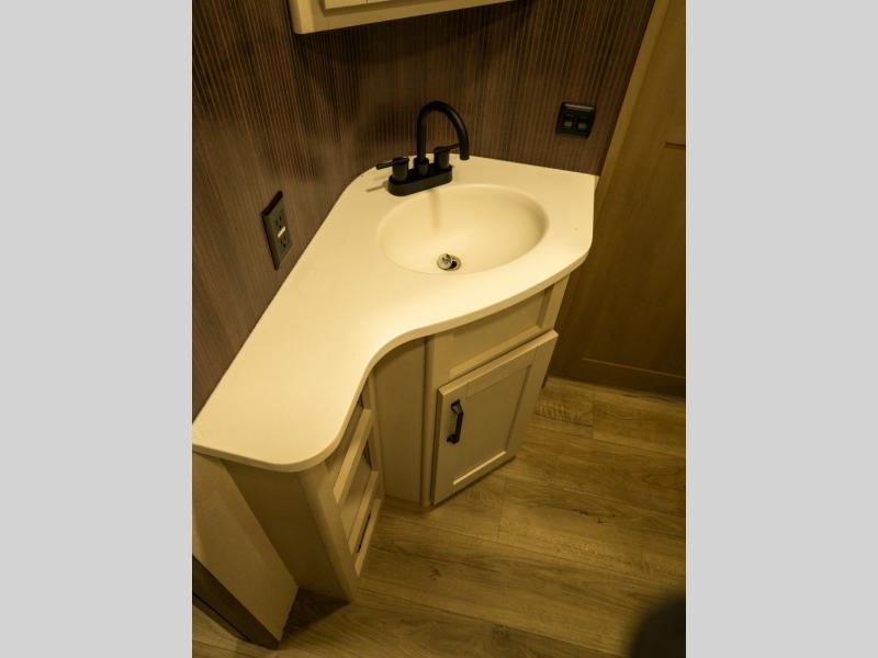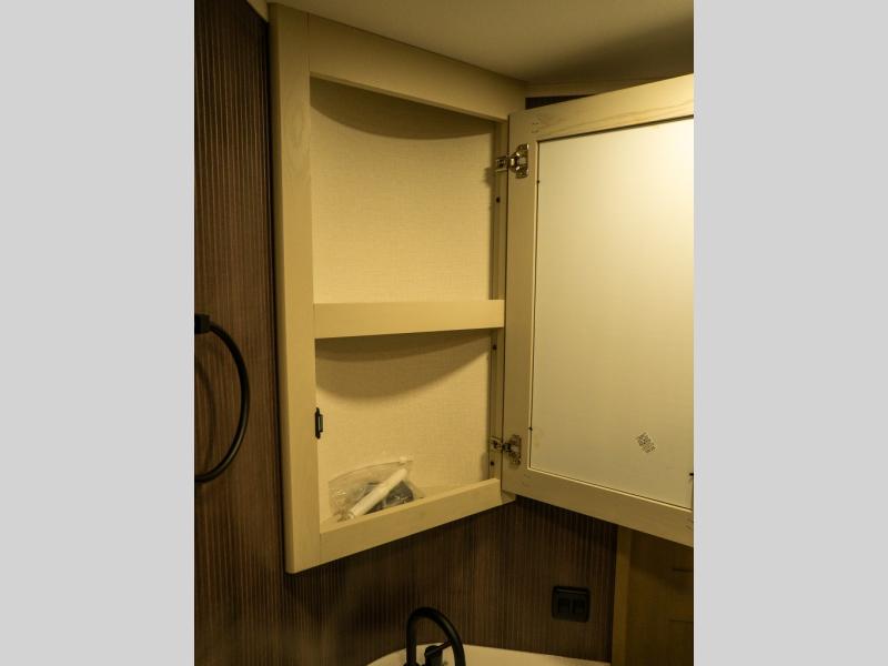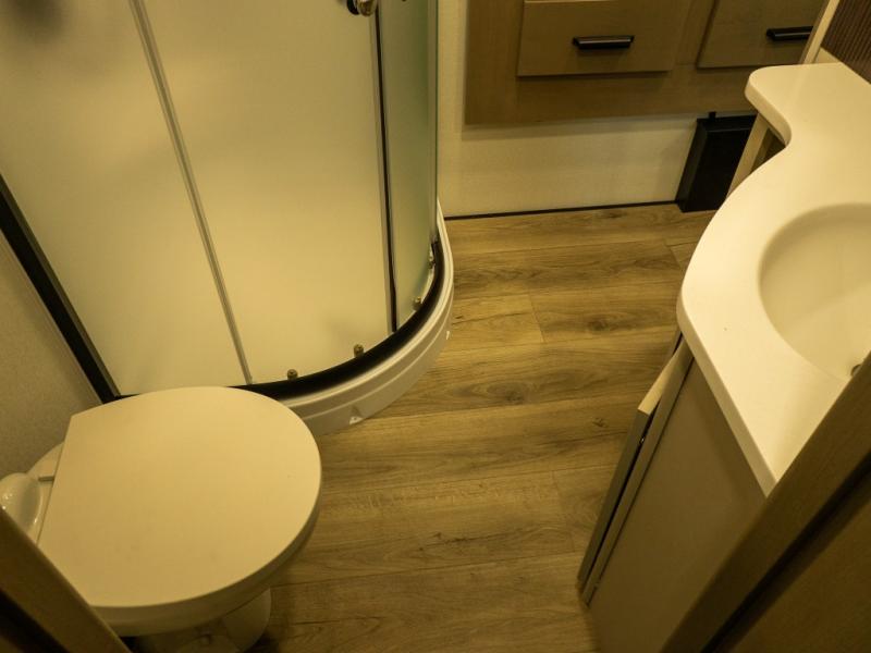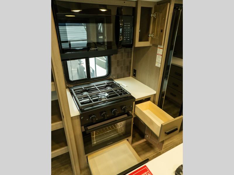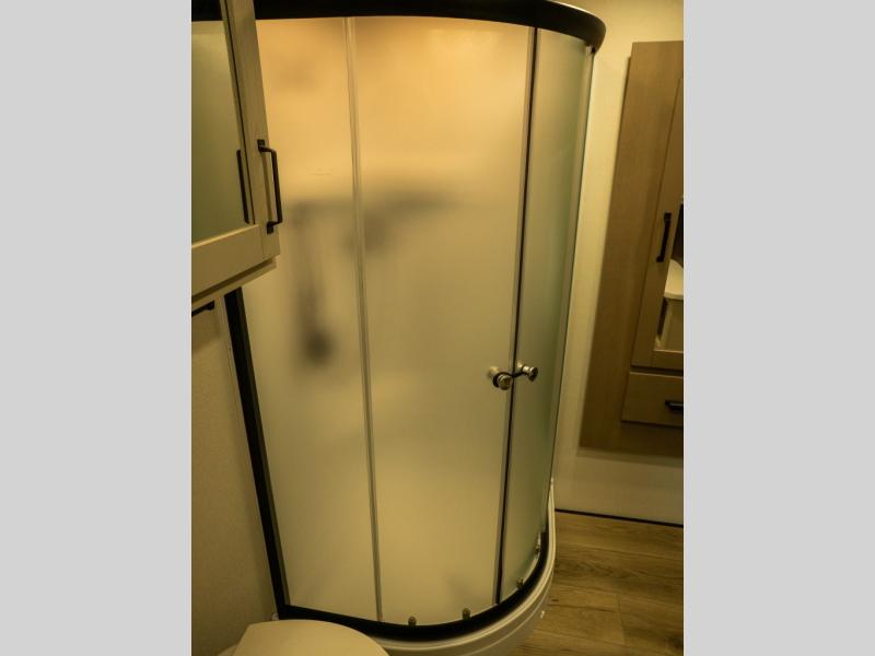 Whether you travel for pleasure or work, you will love the spacious main living and kitchen area with a rear tri-fold sofa that doubles as extra sleeping space, and the theater seating directly across from the entertainment center with a 40" LED HDTV and a fireplace below. The kitchen island will make meal prepping and drying the dishes easier and the hutch is the perfect place to place your picture frames, nice dishes, and extra cooking items. There is even a pantry that is big enough to store all of your favorite snacks, dry ingredients and such. Outside you can enjoy two electric awnings that provide protection from the elements as you relax and visit with other RVers, and your camping chairs can easily be stored in the pass-through compartment. The double entry bathroom is convenient especially at night when you can slide the door to enter from the front master bedroom. You will find plenty of storage for your clothing and gear, plus the bedroom slide out gives you drawers and linen storage that stretches into the full bathroom.