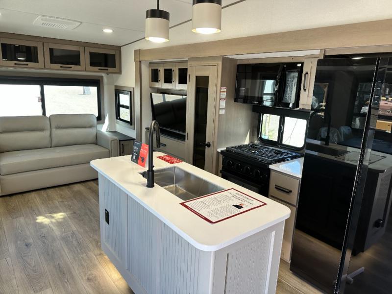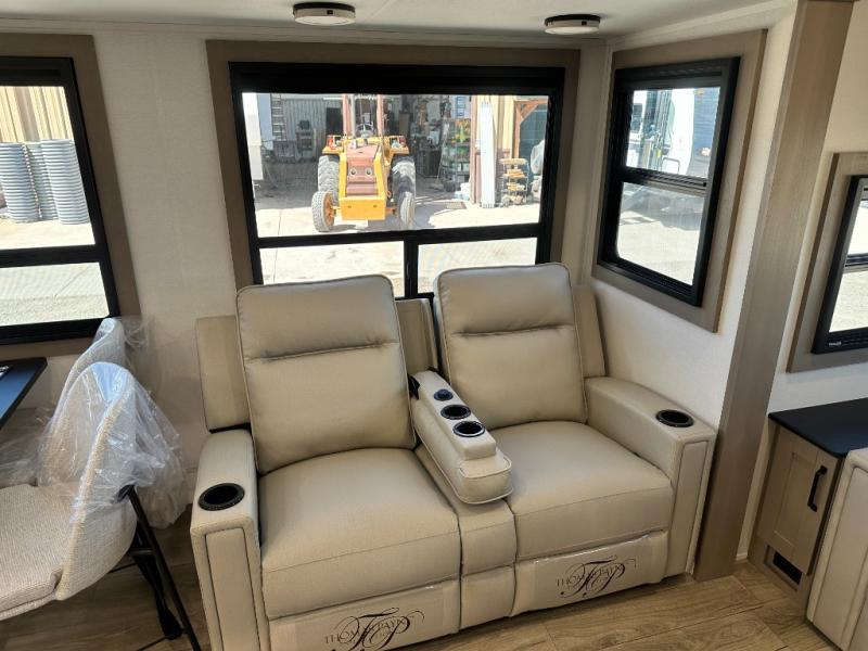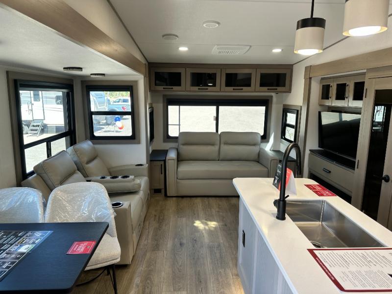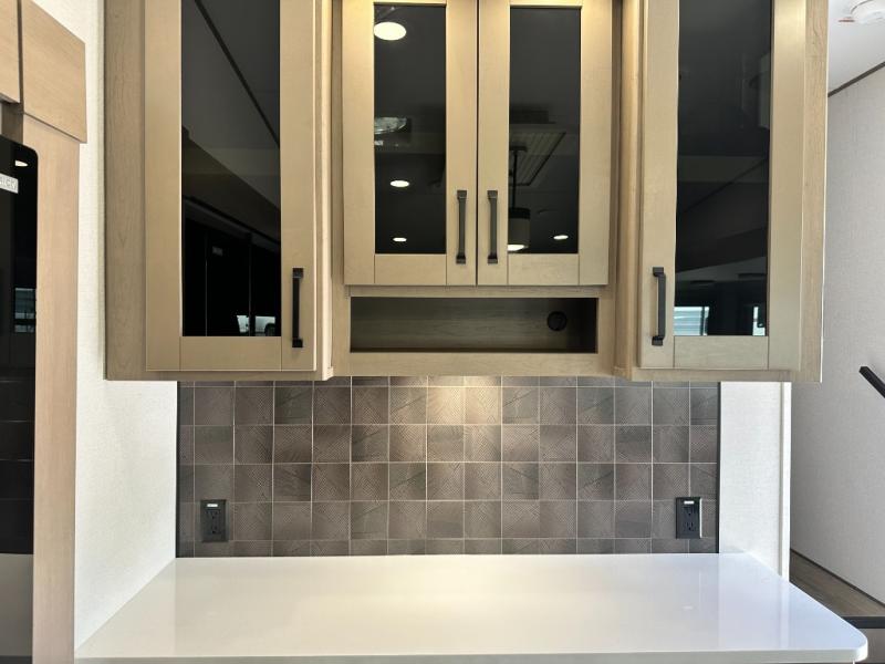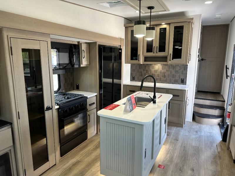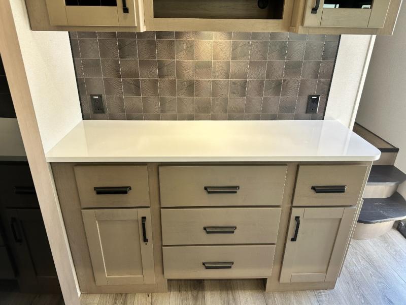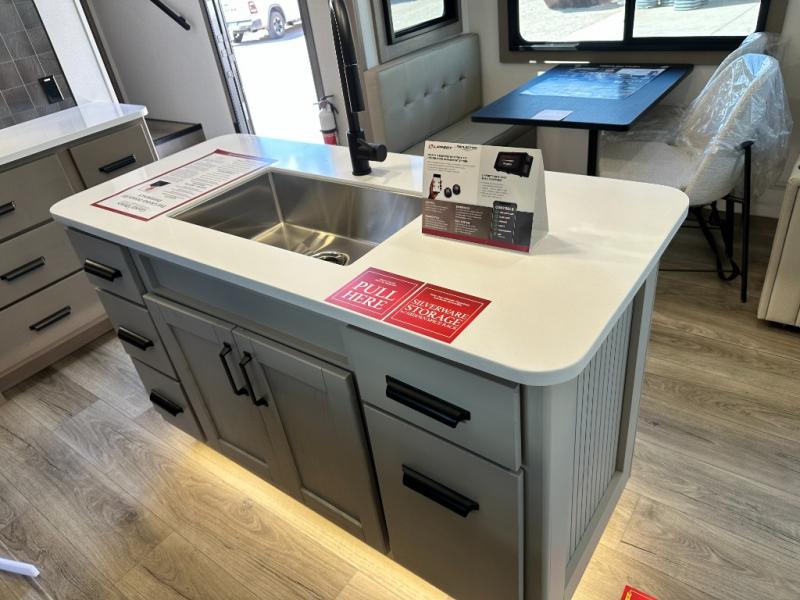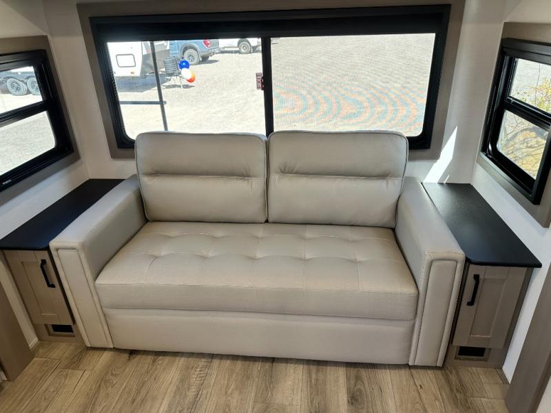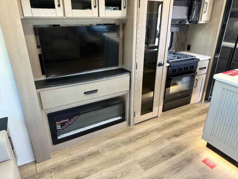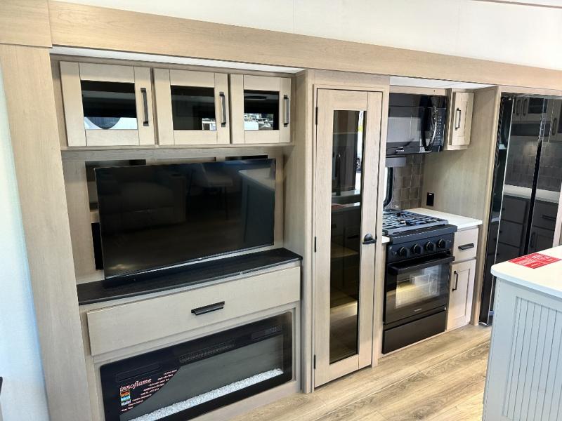 Whether you travel for pleasure or work, you will love the spacious main living and kitchen area with a rear tri-fold sofa that doubles as extra sleeping space, and the theater seating directly across from the entertainment center with a 40" LED HDTV and a fireplace below. The kitchen island will make meal prepping and drying the dishes easier and the hutch is the perfect place to place your picture frames, nice dishes, and extra cooking items. There is even a pantry that is big enough to store all of your favorite snacks, dry ingredients and such. Outside you can enjoy two electric awnings that provide protection from the elements as you relax and visit with other RVers, and your camping chairs can easily be stored in the pass-through compartment. The double entry bathroom is convenient especially at night when you can slide the door to enter from the front master bedroom. You will find plenty of storage for your clothing and gear, plus the bedroom slide out gives you drawers and linen storage that stretches into the full bathroom.
