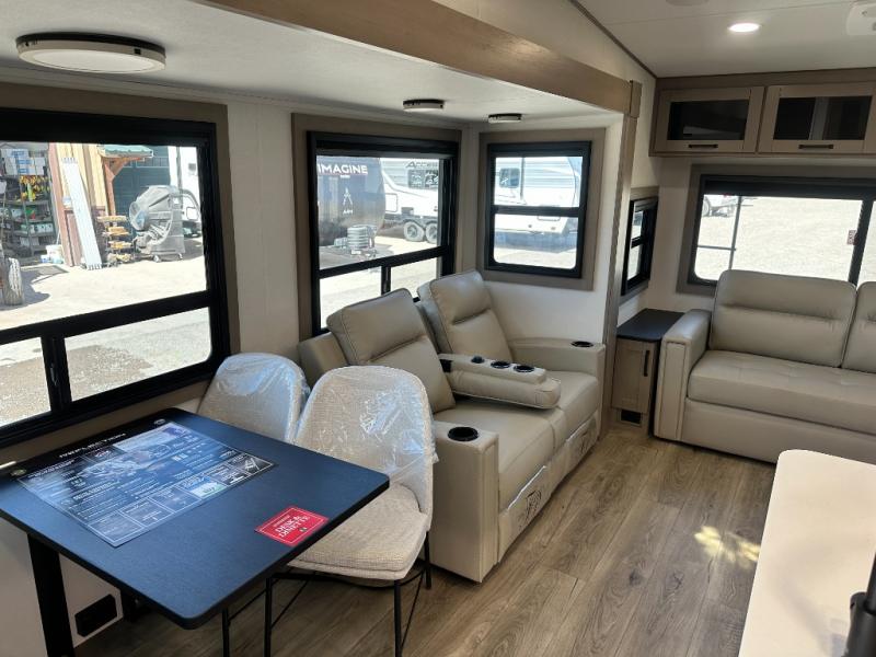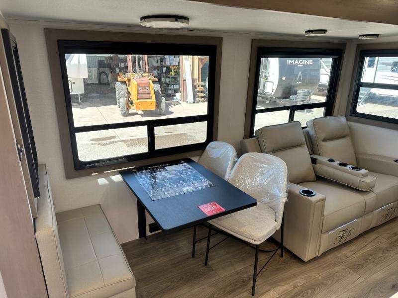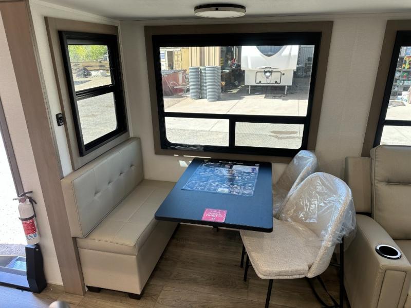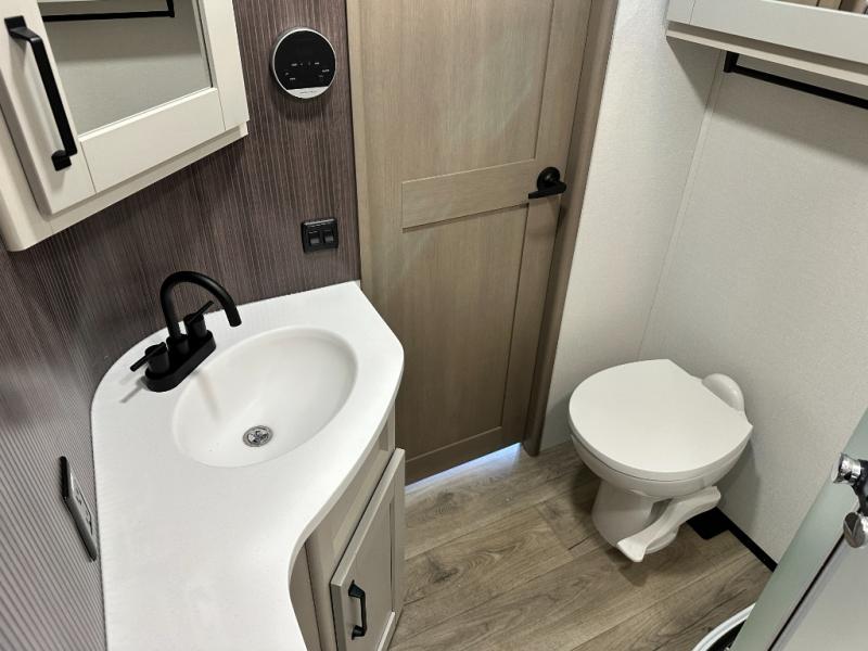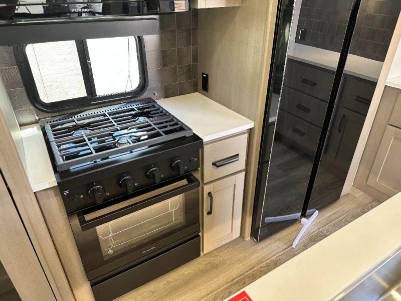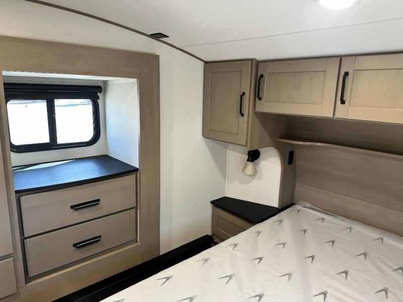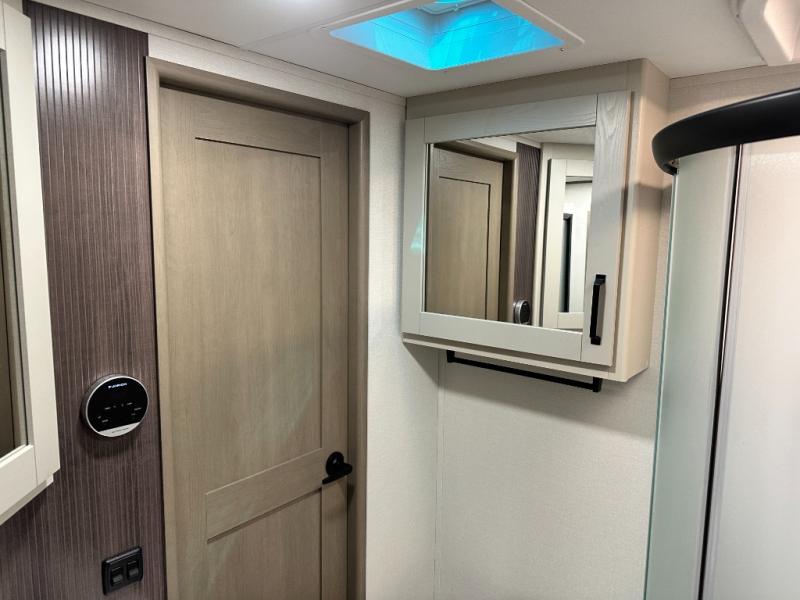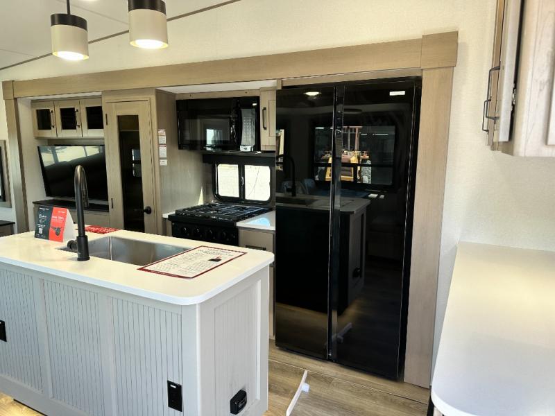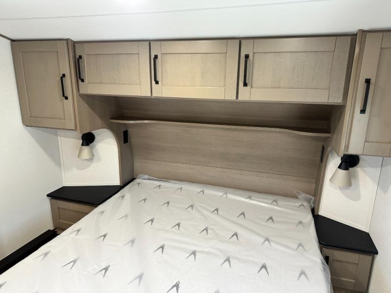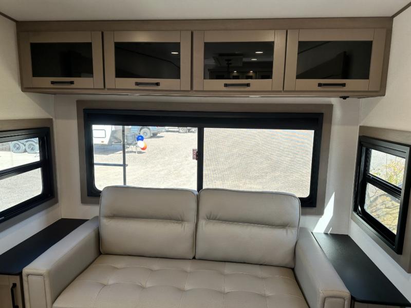 Whether you travel for pleasure or work, you will love the spacious main living and kitchen area with a rear tri-fold sofa that doubles as extra sleeping space, and the theater seating directly across from the entertainment center with a 40" LED HDTV and a fireplace below. The kitchen island will make meal prepping and drying the dishes easier and the hutch is the perfect place to place your picture frames, nice dishes, and extra cooking items. There is even a pantry that is big enough to store all of your favorite snacks, dry ingredients and such. Outside you can enjoy two electric awnings that provide protection from the elements as you relax and visit with other RVers, and your camping chairs can easily be stored in the pass-through compartment. The double entry bathroom is convenient especially at night when you can slide the door to enter from the front master bedroom. You will find plenty of storage for your clothing and gear, plus the bedroom slide out gives you drawers and linen storage that stretches into the full bathroom.