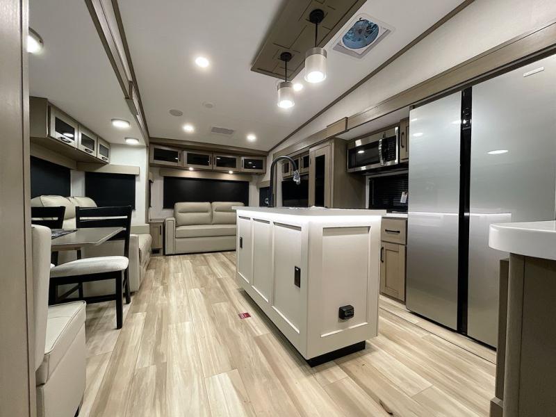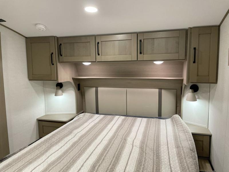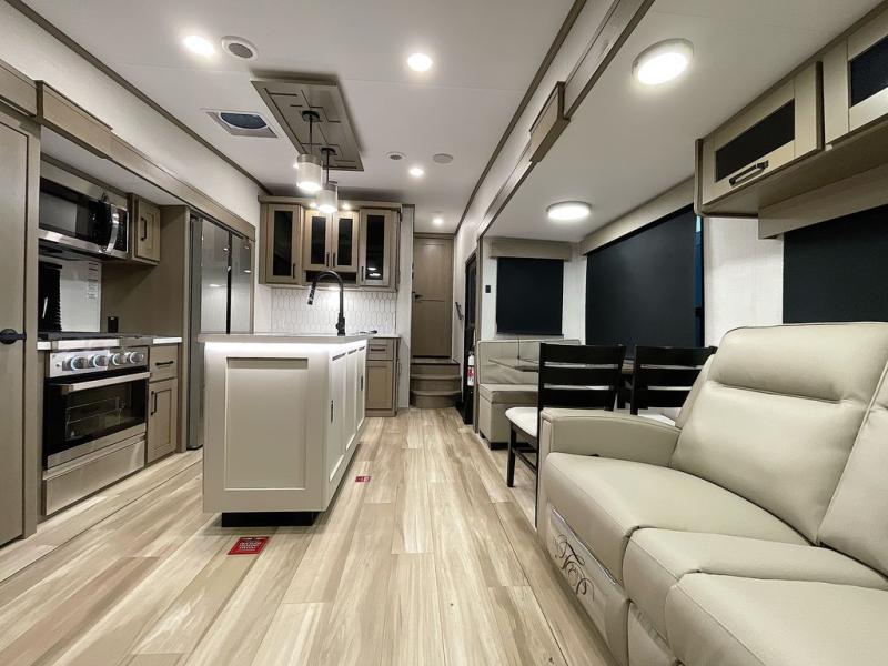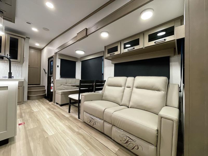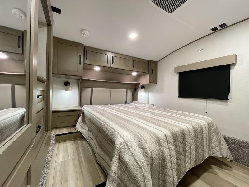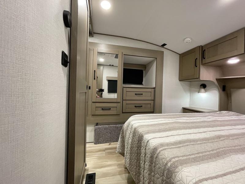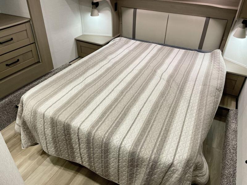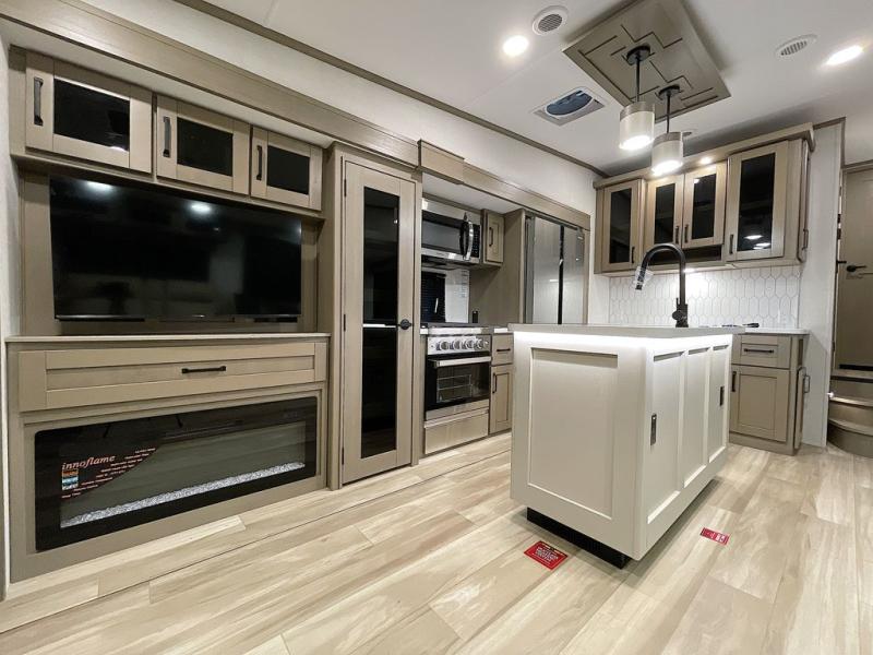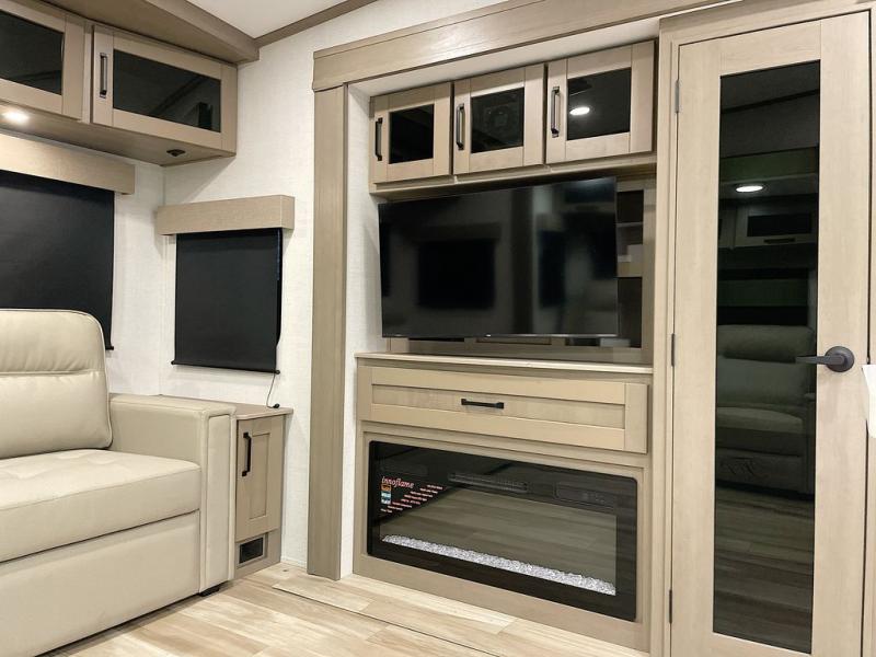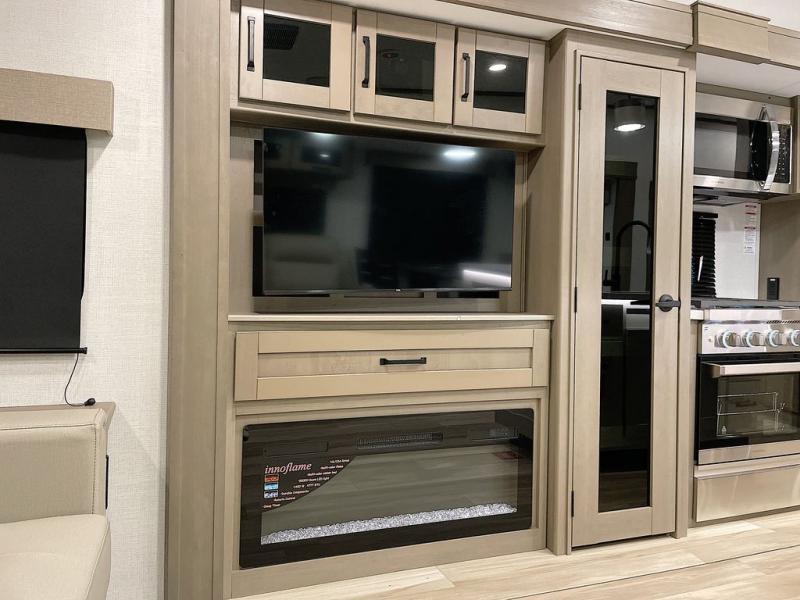 Whether you travel for pleasure or work, you will love the spacious main living and kitchen area with a rear tri-fold sofa that doubles as extra sleeping space, and the theater seating directly across from the entertainment center with a 40" LED HDTV and a fireplace below. The kitchen island will make meal prepping and drying the dishes easier and the hutch is the perfect place to place your picture frames, nice dishes, and extra cooking items. There is even a pantry that is big enough to store all of your favorite snacks, dry ingredients and such. Outside you can enjoy two electric awnings that provide protection from the elements as you relax and visit with other RVers, and your camping chairs can easily be stored in the pass-through compartment. The double entry bathroom is convenient especially at night when you can slide the door to enter from the front master bedroom. You will find plenty of storage for your clothing and gear, plus the bedroom slide out gives you drawers and linen storage that stretches into the full bathroom.