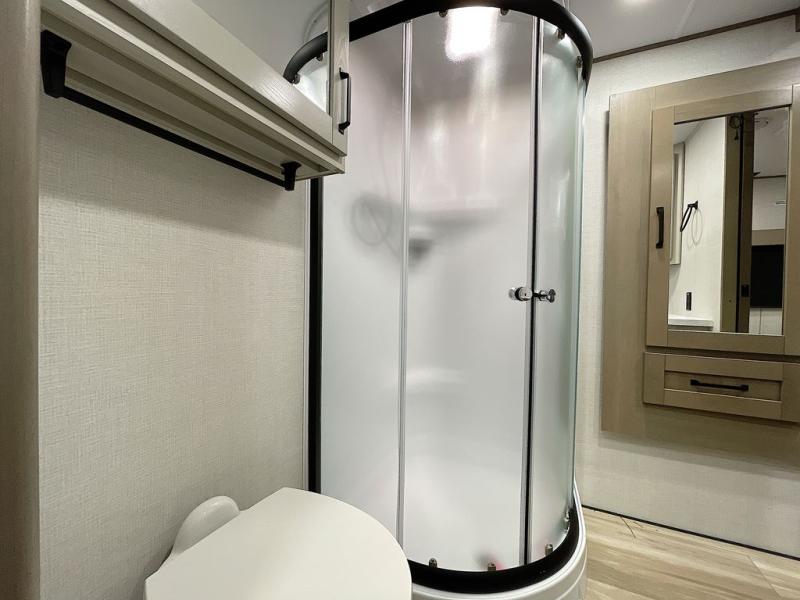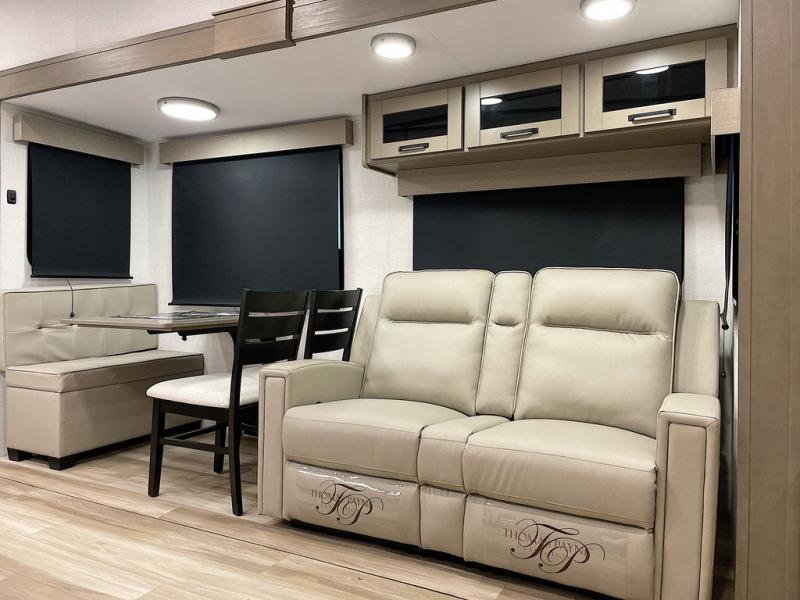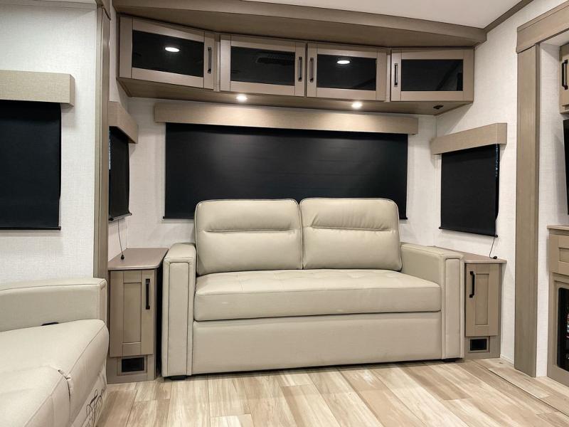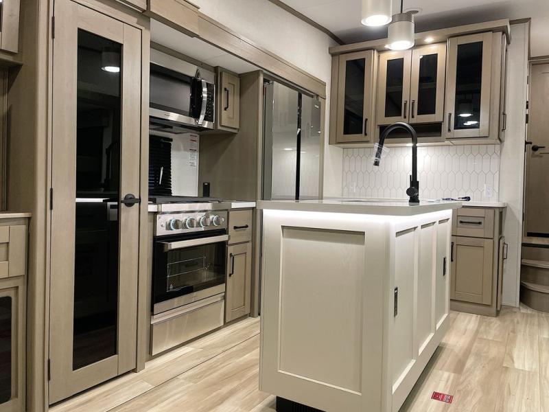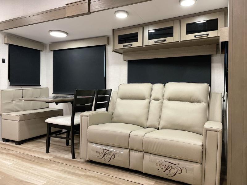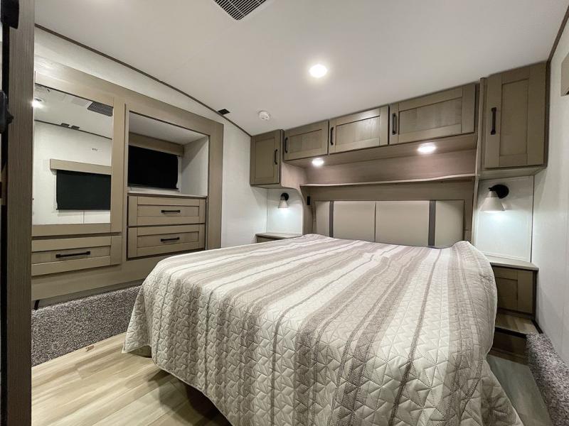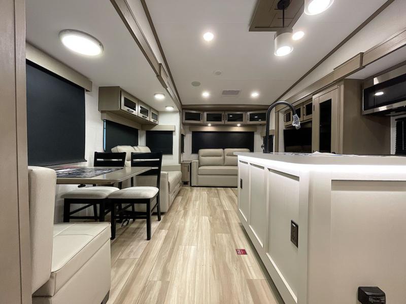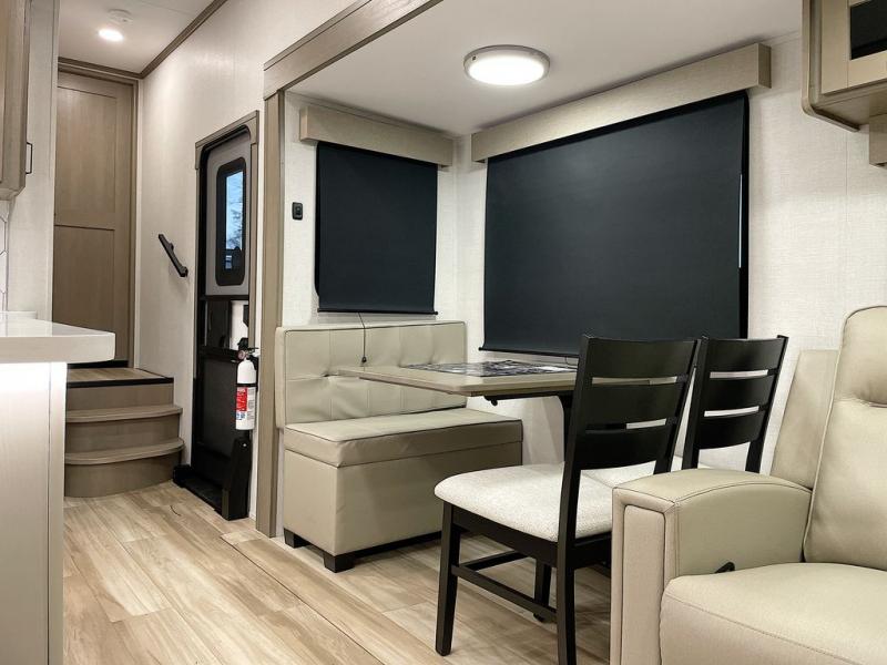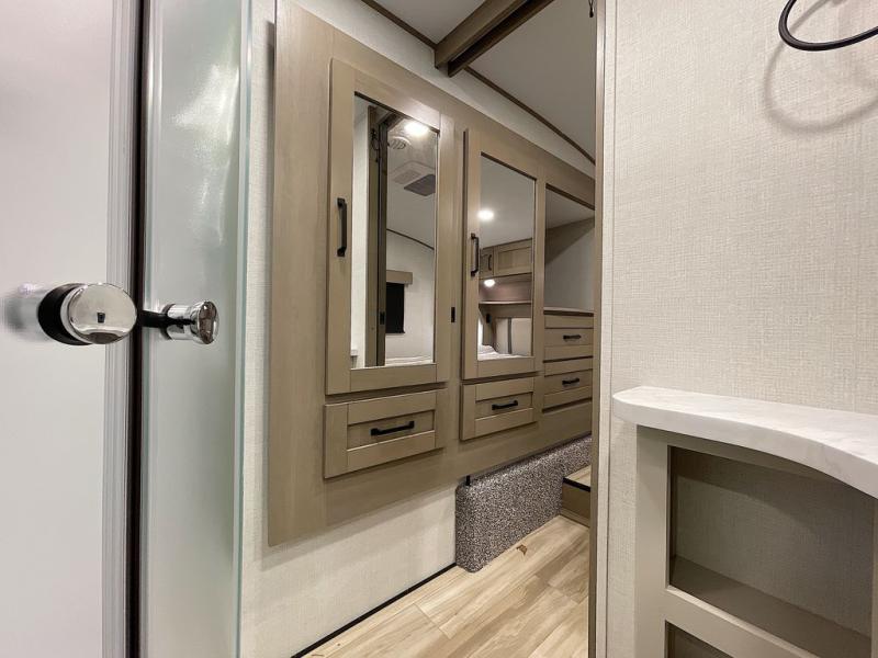 Whether you travel for pleasure or work, you will love the spacious main living and kitchen area with a rear tri-fold sofa that doubles as extra sleeping space, and the theater seating directly across from the entertainment center with a 40" LED HDTV and a fireplace below. The kitchen island will make meal prepping and drying the dishes easier and the hutch is the perfect place to place your picture frames, nice dishes, and extra cooking items. There is even a pantry that is big enough to store all of your favorite snacks, dry ingredients and such. Outside you can enjoy two electric awnings that provide protection from the elements as you relax and visit with other RVers, and your camping chairs can easily be stored in the pass-through compartment. The double entry bathroom is convenient especially at night when you can slide the door to enter from the front master bedroom. You will find plenty of storage for your clothing and gear, plus the bedroom slide out gives you drawers and linen storage that stretches into the full bathroom.