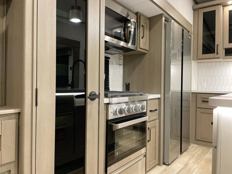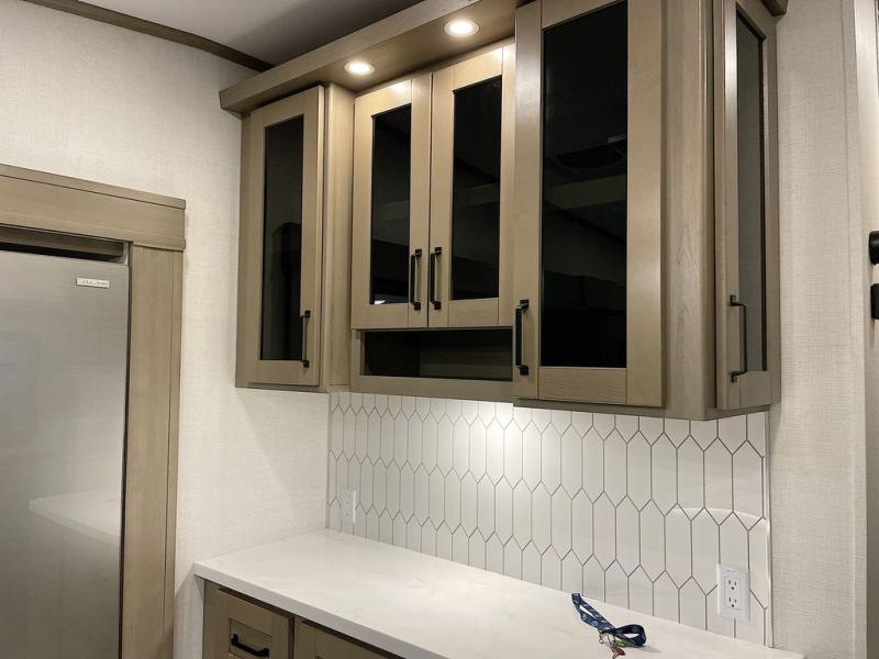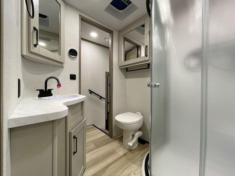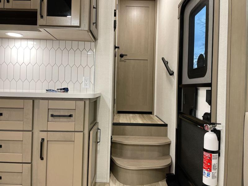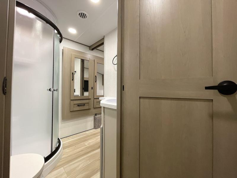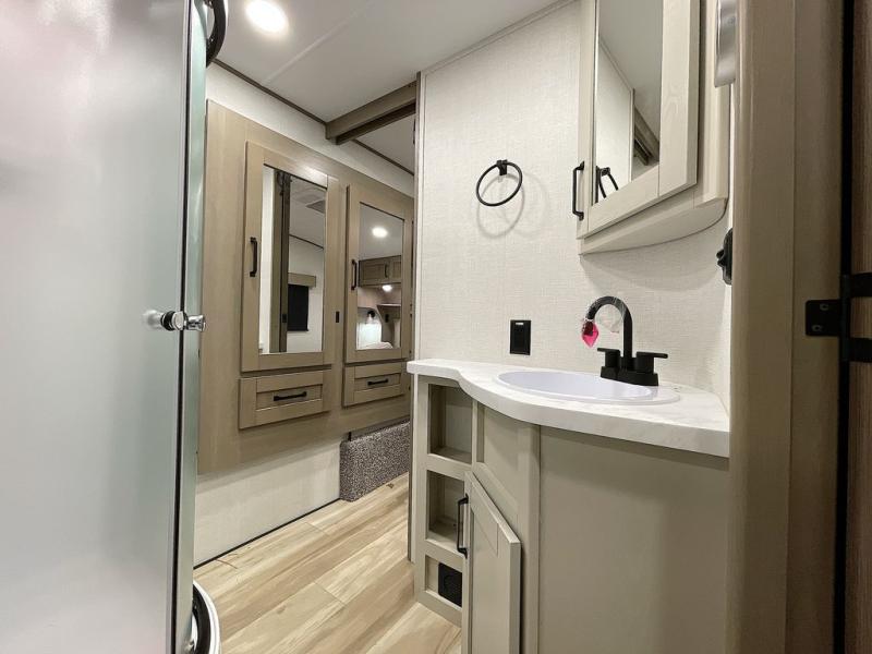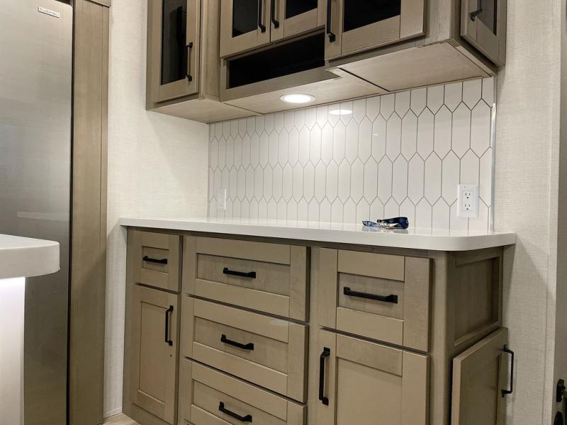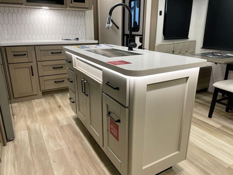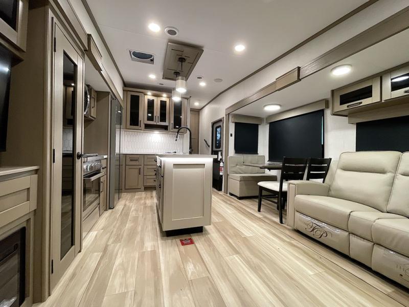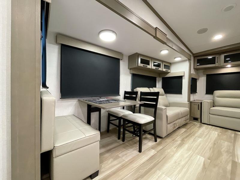 Whether you travel for pleasure or work, you will love the spacious main living and kitchen area with a rear tri-fold sofa that doubles as extra sleeping space, and the theater seating directly across from the entertainment center with a 40" LED HDTV and a fireplace below. The kitchen island will make meal prepping and drying the dishes easier and the hutch is the perfect place to place your picture frames, nice dishes, and extra cooking items. There is even a pantry that is big enough to store all of your favorite snacks, dry ingredients and such. Outside you can enjoy two electric awnings that provide protection from the elements as you relax and visit with other RVers, and your camping chairs can easily be stored in the pass-through compartment. The double entry bathroom is convenient especially at night when you can slide the door to enter from the front master bedroom. You will find plenty of storage for your clothing and gear, plus the bedroom slide out gives you drawers and linen storage that stretches into the full bathroom.