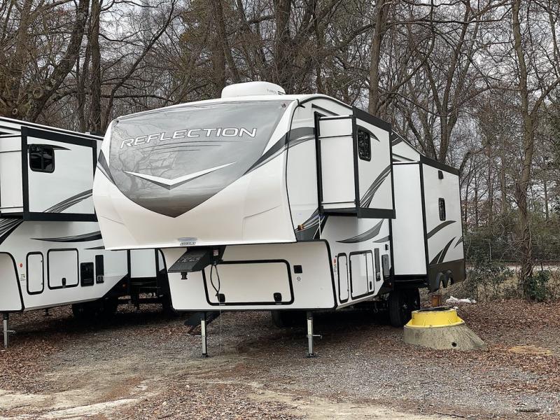 With any Reflection fifth wheel by Grand Design, you will have a solar panel for off-grid camping and a 60 amp charge controller and inverter prep, a Universal All-In-One docking station, unobstructed pass-through storage, and Goodyear Endurance tires. Each is constructed of gel coat exterior sidewalls, residential 5" truss rafters, walk-on roof decking, a fiberglass and radiant foil roof and front cap insulation plus laminated aluminum framed side walls, roof and end walls in slide rooms. Head inside to enjoy residential hardwood cabinet doors, premium Congoleum flooring, a spacious shower with a glass door, and many more comforts!