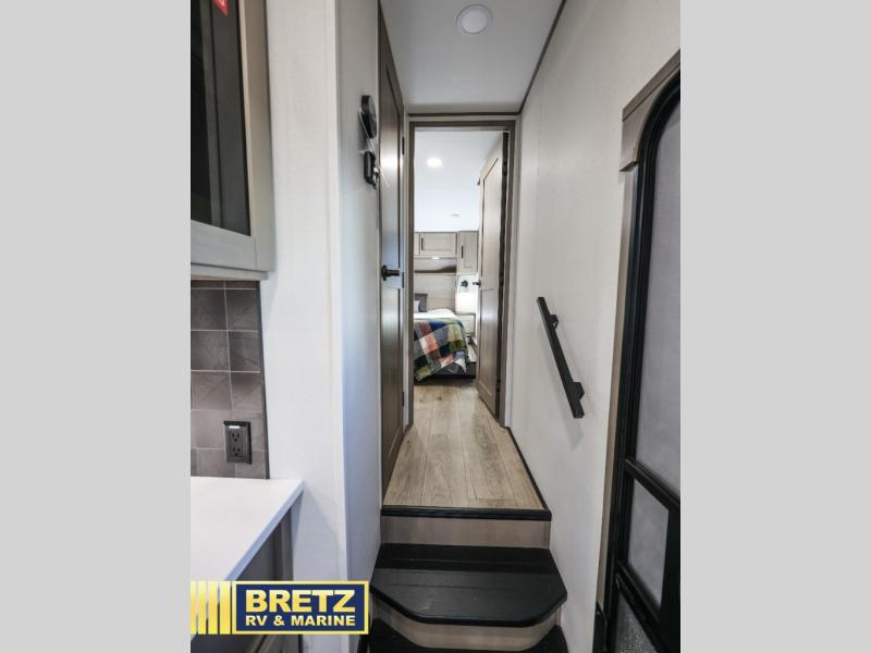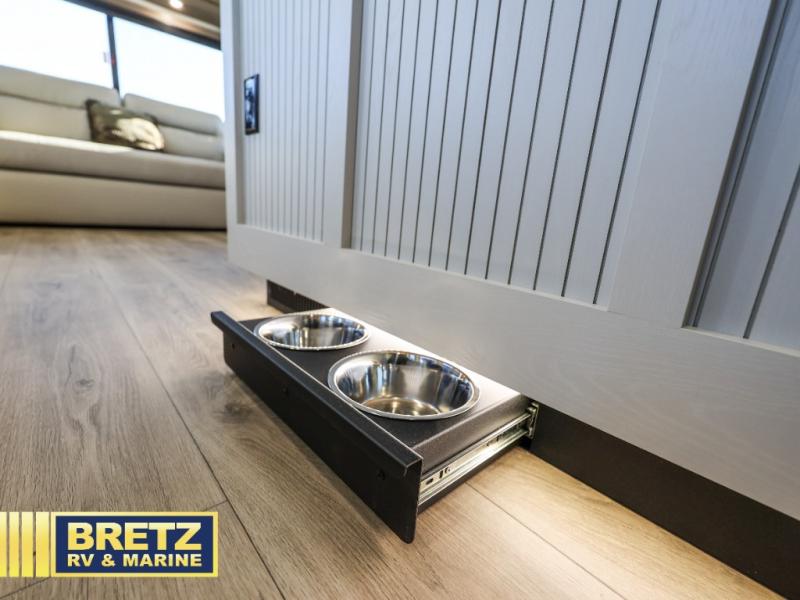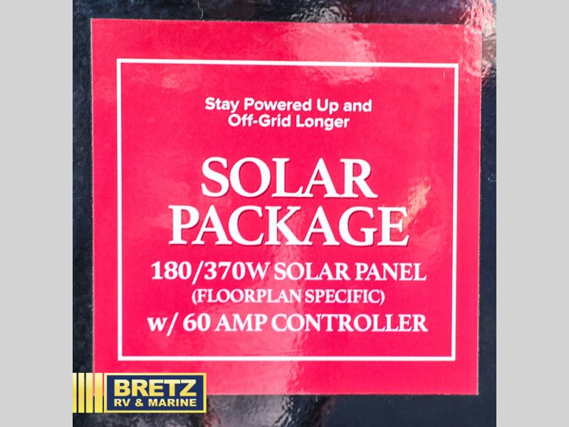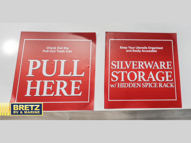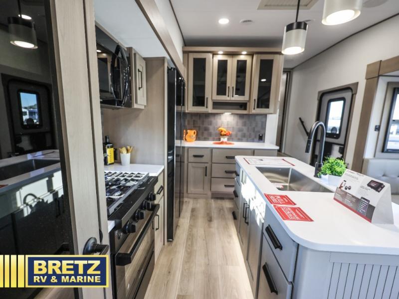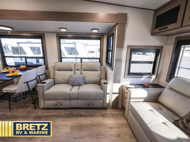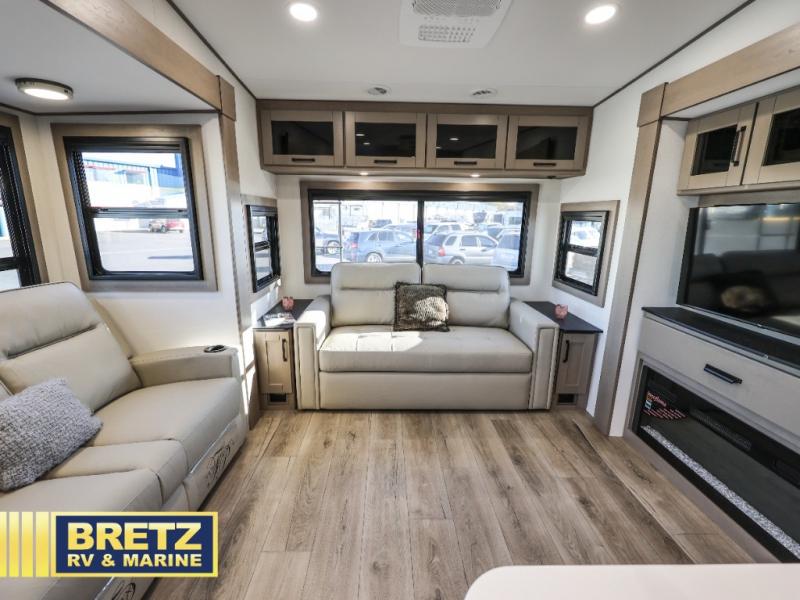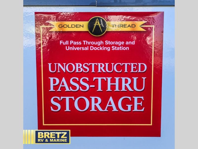 Whether you travel for pleasure or work, you will love the spacious main living and kitchen area with a rear tri-fold sofa that doubles as extra sleeping space, and the theater seating directly across from the entertainment center with a 40" LED HDTV and a fireplace below. The kitchen island will make meal prepping and drying the dishes easier and the hutch is the perfect place to place your picture frames, nice dishes, and extra cooking items. There is even a pantry that is big enough to store all of your favorite snacks, dry ingredients and such. Outside you can enjoy two electric awnings that provide protection from the elements as you relax and visit with other RVers, and your camping chairs can easily be stored in the pass-through compartment. The double entry bathroom is convenient especially at night when you can slide the door to enter from the front master bedroom. You will find plenty of storage for your clothing and gear, plus the bedroom slide out gives you drawers and linen storage that stretches into the full bathroom.