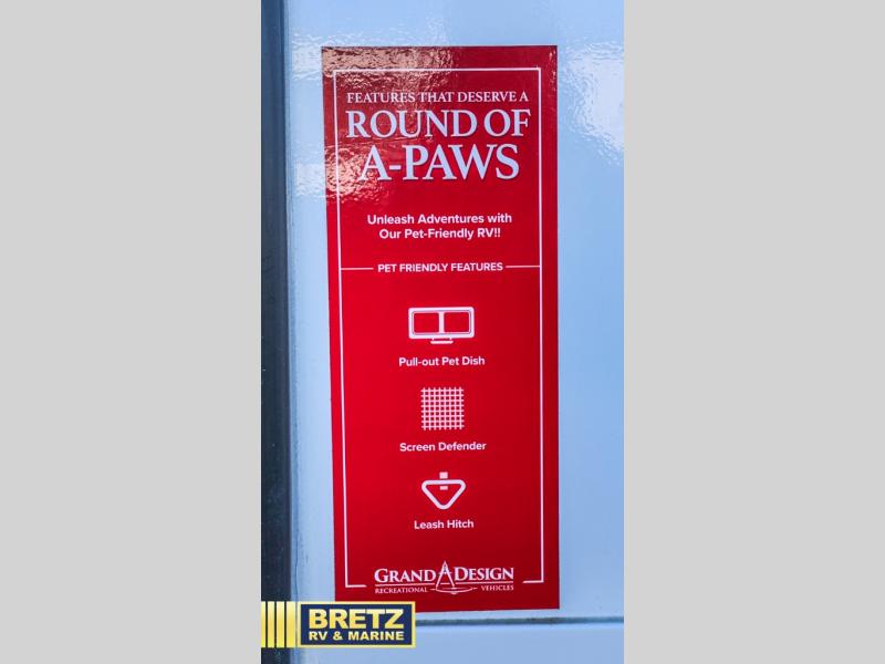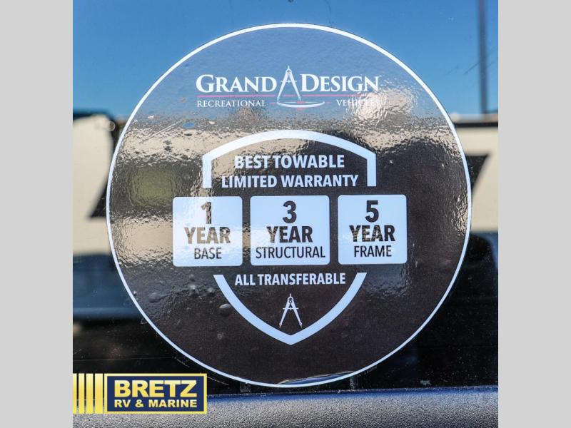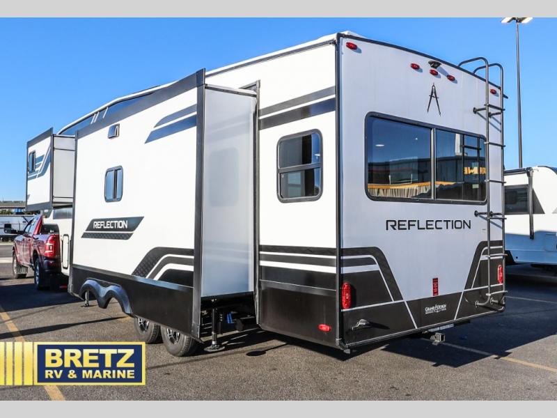 With any Reflection fifth wheel by Grand Design, you will have a solar panel for off-grid camping and a 60 amp charge controller and inverter prep, a Universal All-In-One docking station, unobstructed pass-through storage, and Goodyear Endurance tires. Each is constructed of gel coat exterior sidewalls, residential 5" truss rafters, walk-on roof decking, a fiberglass and radiant foil roof and front cap insulation plus laminated aluminum framed side walls, roof and end walls in slide rooms. Head inside to enjoy residential hardwood cabinet doors, premium Congoleum flooring, a spacious shower with a glass door, and many more comforts!