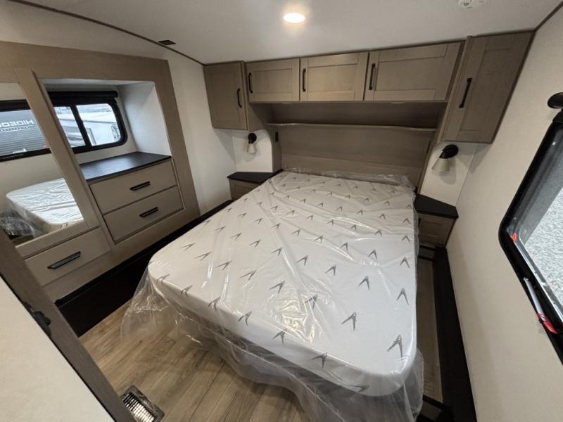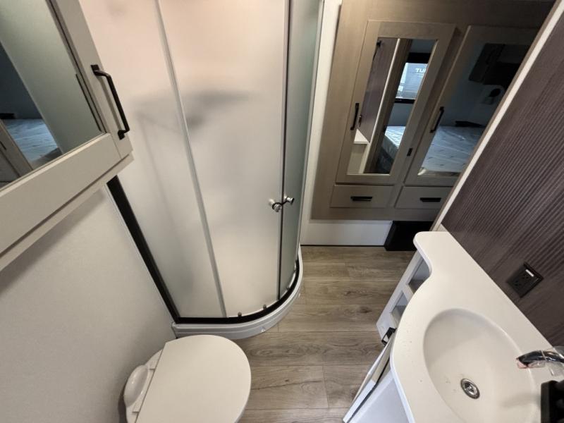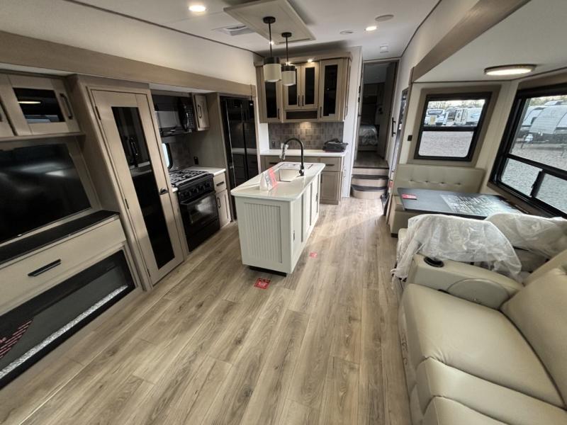 Whether you travel for pleasure or work, you will love the spacious main living and kitchen area with a rear tri-fold sofa that doubles as extra sleeping space, and the theater seating directly across from the entertainment center with a 40" LED HDTV and a fireplace below. The kitchen island will make meal prepping and drying the dishes easier and the hutch is the perfect place to place your picture frames, nice dishes, and extra cooking items. There is even a pantry that is big enough to store all of your favorite snacks, dry ingredients and such. Outside you can enjoy two electric awnings that provide protection from the elements as you relax and visit with other RVers, and your camping chairs can easily be stored in the pass-through compartment. The double entry bathroom is convenient especially at night when you can slide the door to enter from the front master bedroom. You will find plenty of storage for your clothing and gear, plus the bedroom slide out gives you drawers and linen storage that stretches into the full bathroom.