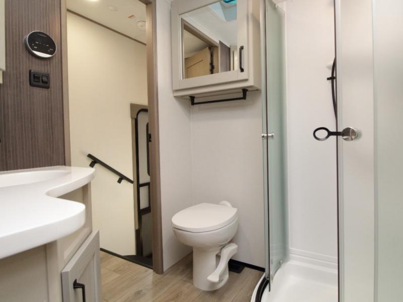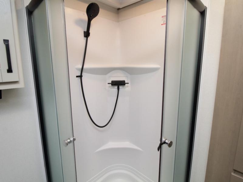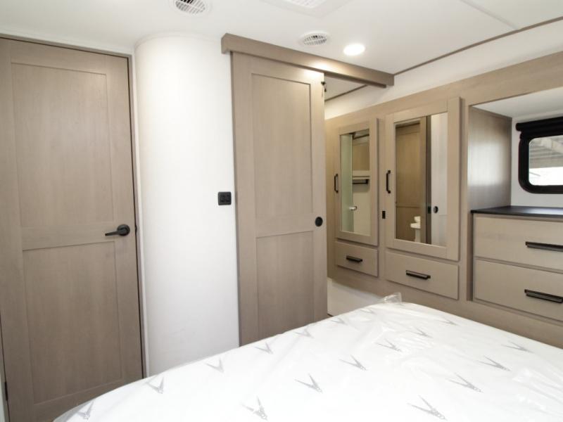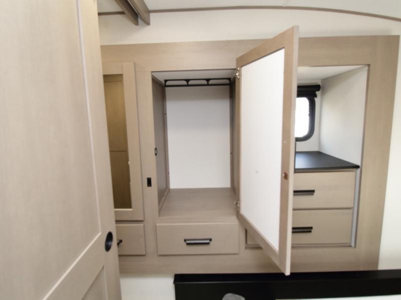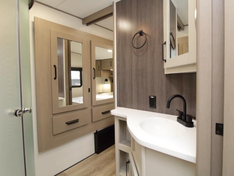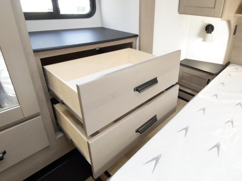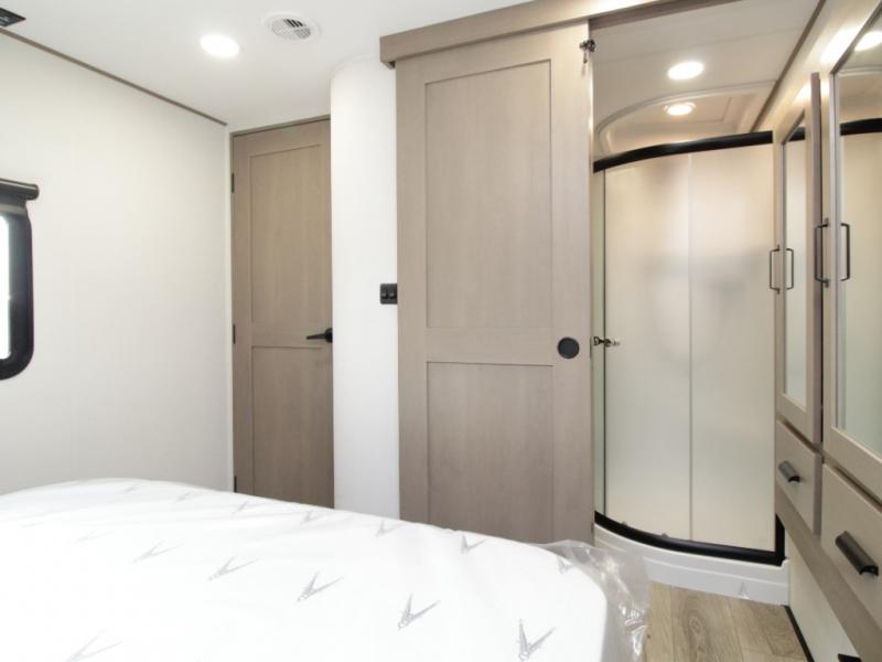 The well-designed double-entry bathroom enhances convenience, especially for nighttime use, with direct access from both the hallway and the front private bedroom. The bedroom slide-out adds generous drawer space and linen storage that extends into the bathroom, ensuring plenty of room for clothing, toiletries, and personal items.