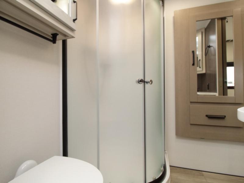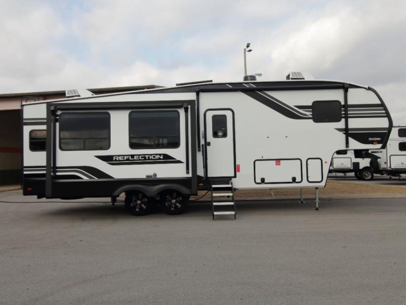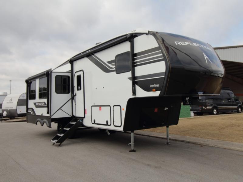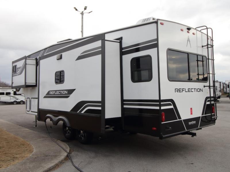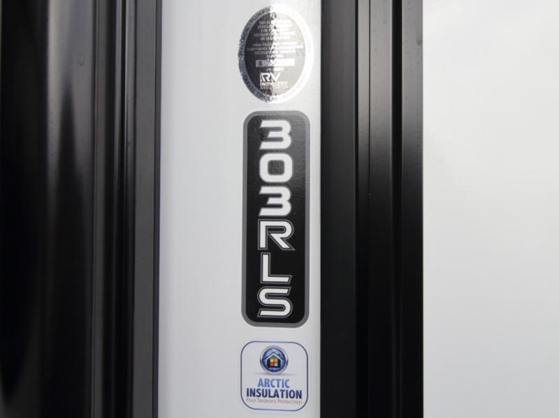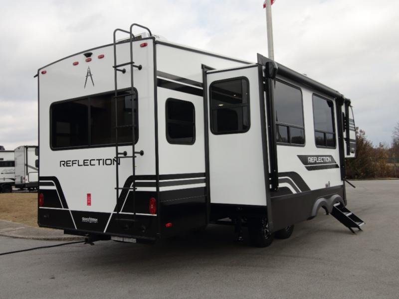 The Reflection 303RLS is constructed with high-gloss gel coat sidewalls, residential 5" truss rafters, walk-on roof decking, fiberglass and radiant foil insulation, and laminated aluminum-framed slide rooms. Inside, you’ll find residential hardwood cabinet doors, premium Congoleum flooring, and a spacious glass-enclosed shower, creating a refined and comfortable living experience that truly feels like home.