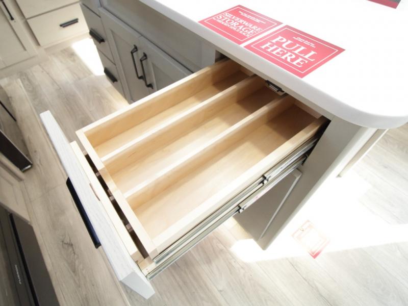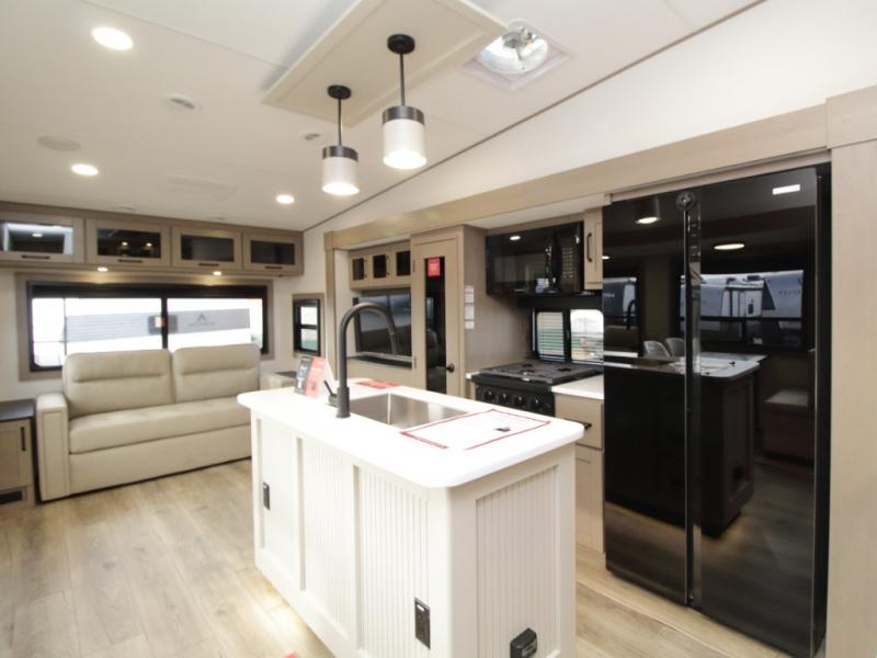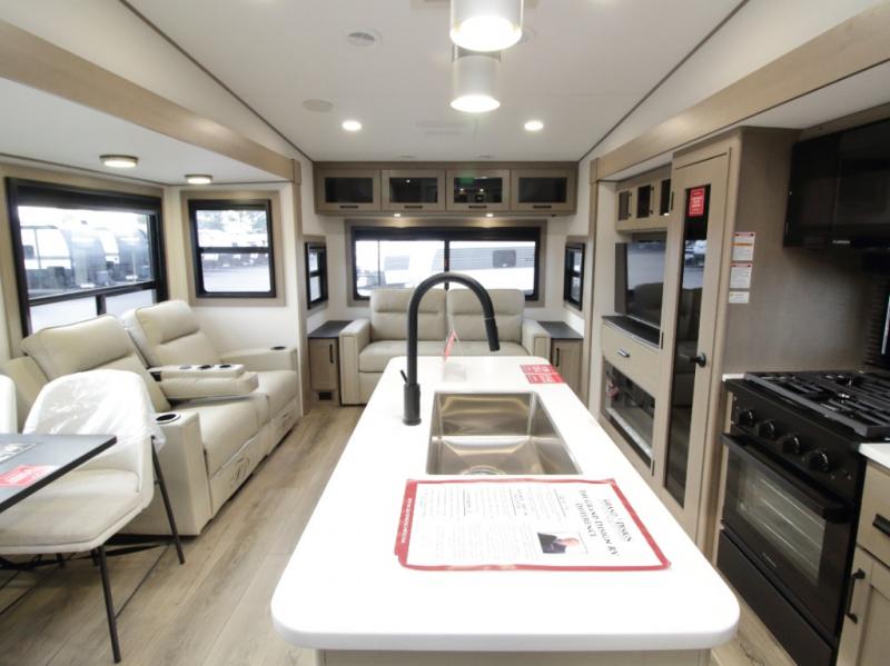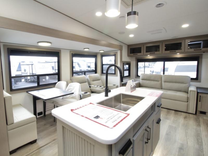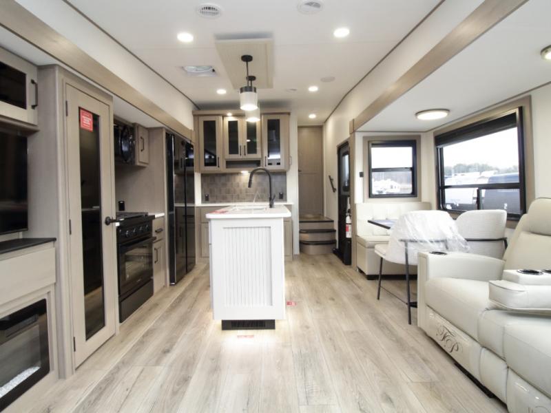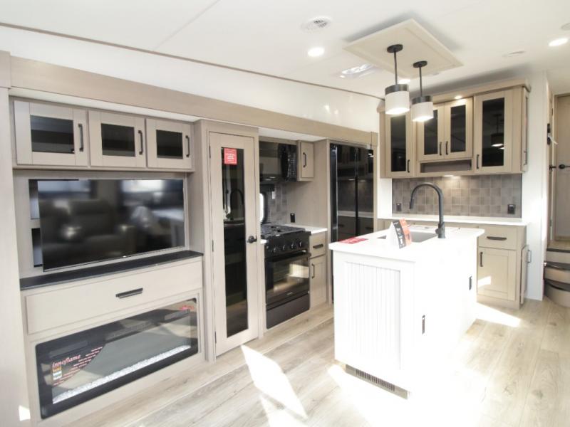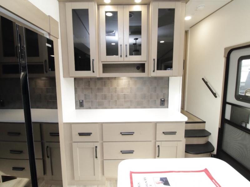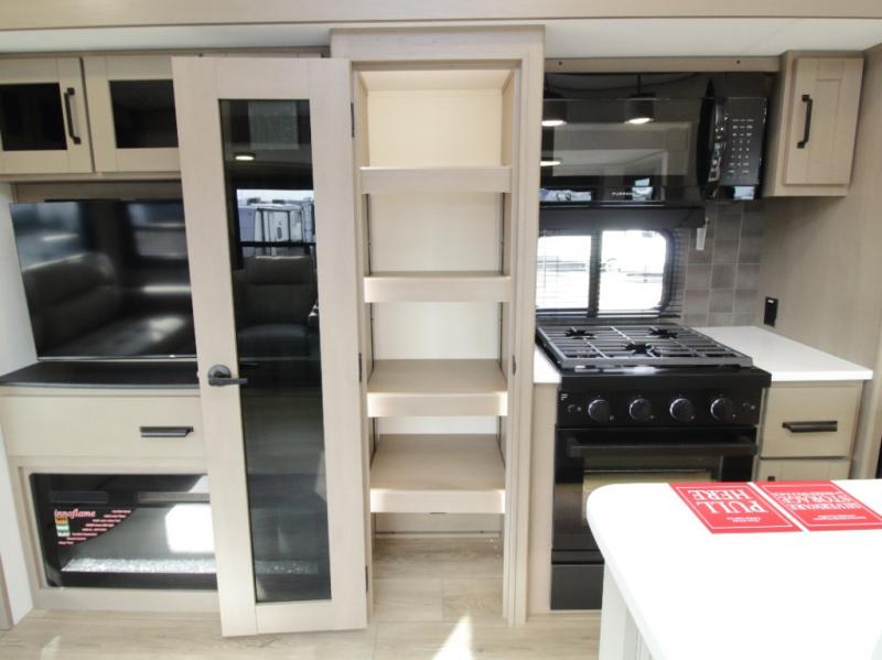 The centrally located kitchen island offers added workspace for meal prep and cleanup, while the hutch provides the perfect spot for décor, cookware, or serving pieces. A spacious pantry ensures all your snacks, dry goods, and cooking essentials stay organized and within reach. The large 16 cu. ft. 12V refrigerator offers ample storage for extended trips away from home.