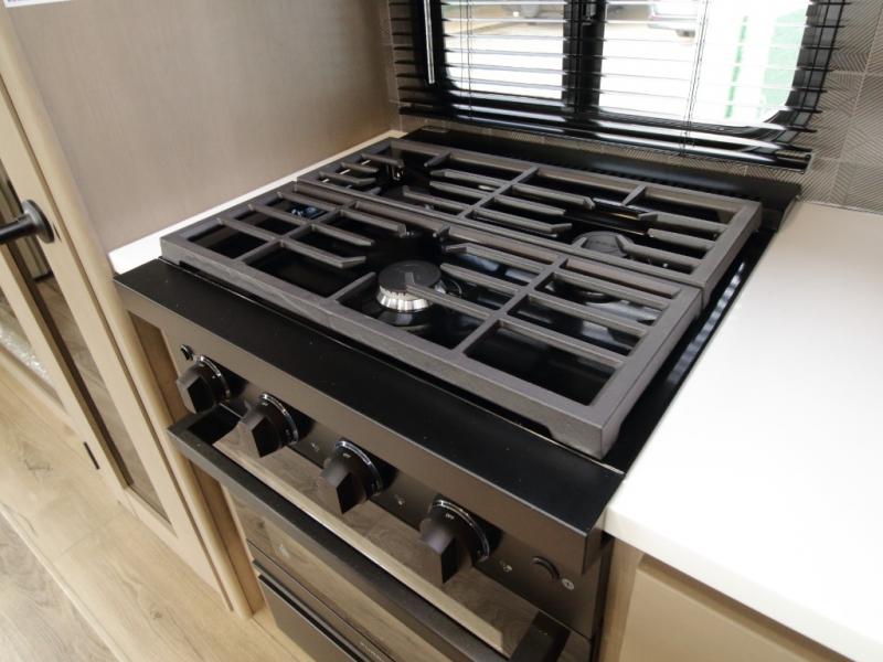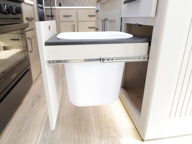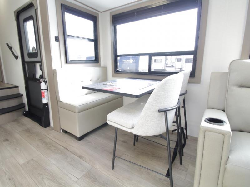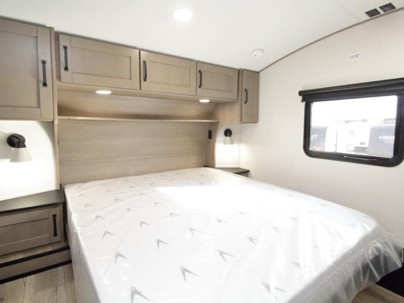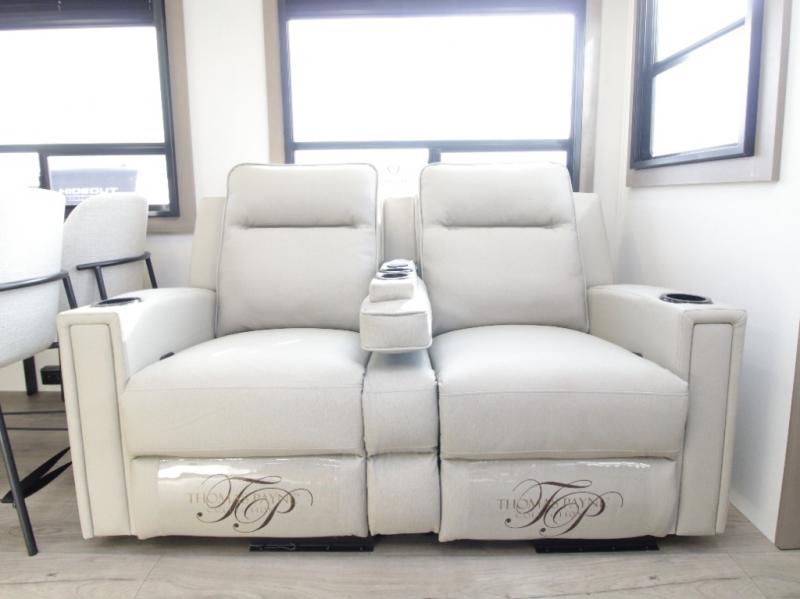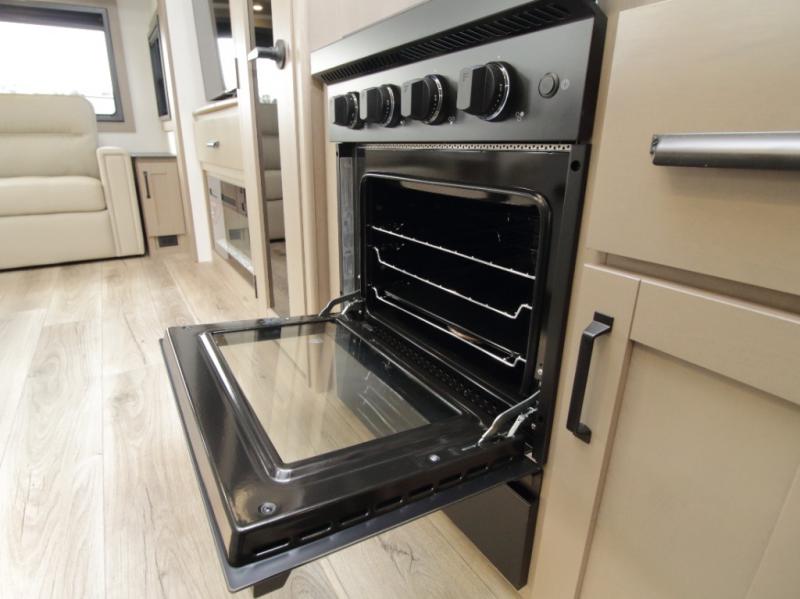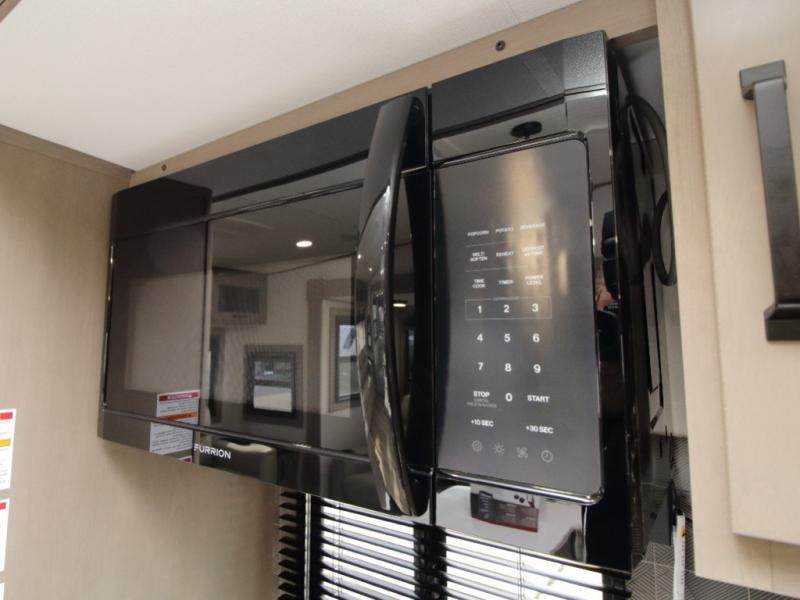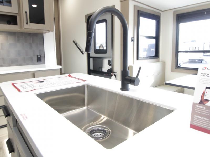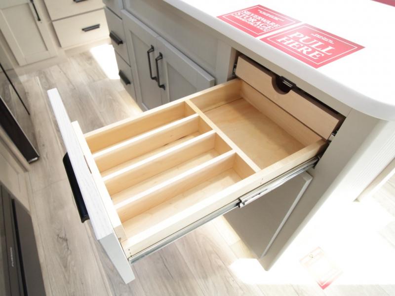 The centrally located kitchen island offers added workspace for meal prep and cleanup, while the hutch provides the perfect spot for décor, cookware, or serving pieces. A spacious pantry ensures all your snacks, dry goods, and cooking essentials stay organized and within reach. The large 16 cu. ft. 12V refrigerator offers ample storage for extended trips away from home.
