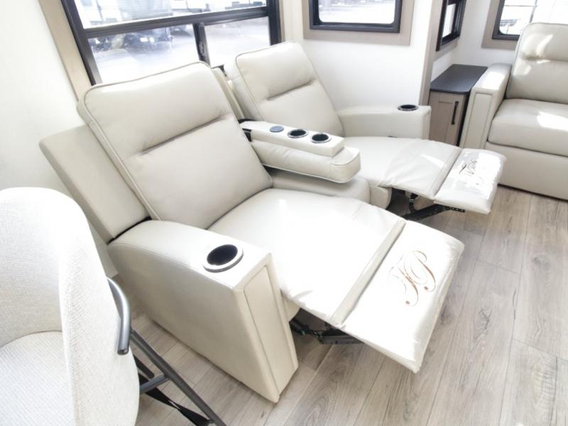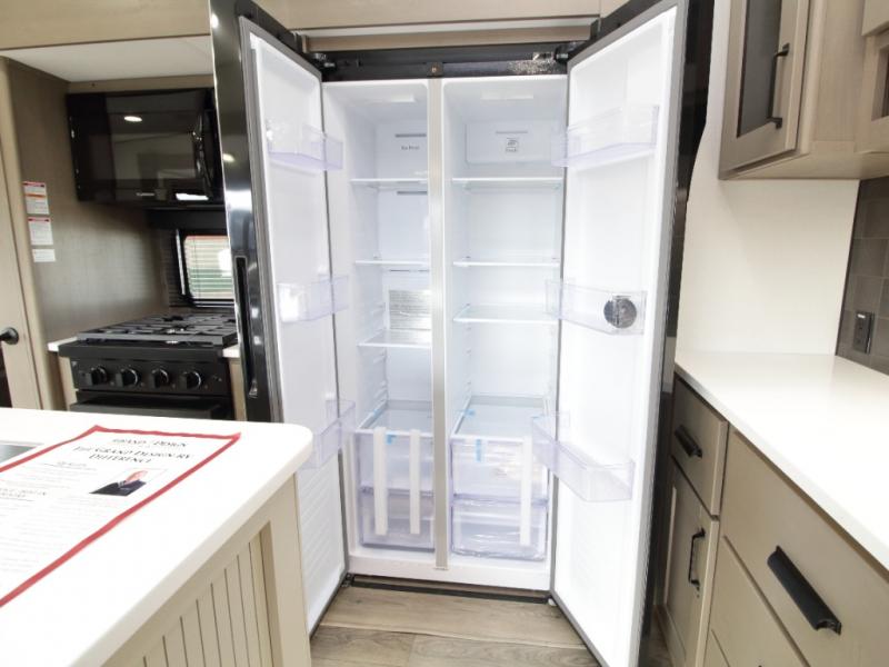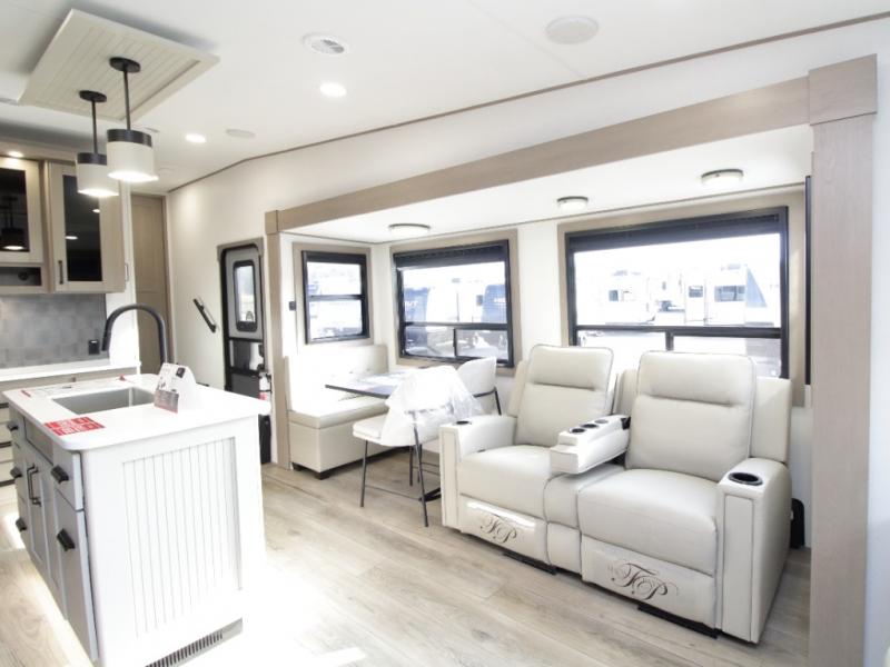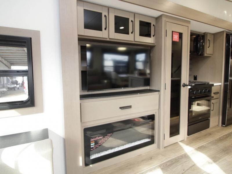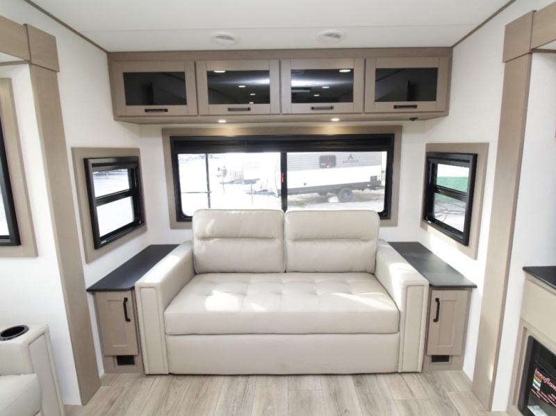 Whether you’re traveling for weekend getaways, extended vacations, or working remotely on the road, the Grand Design Reflection 303RLS fifth wheel delivers an open-concept design with residential comfort throughout. The expansive living and kitchen area creates a relaxing environment with a rear tri-fold sofa that easily converts into additional sleeping space and theater seating positioned directly across from the entertainment center featuring a 40" LED HDTV and a cozy fireplace.