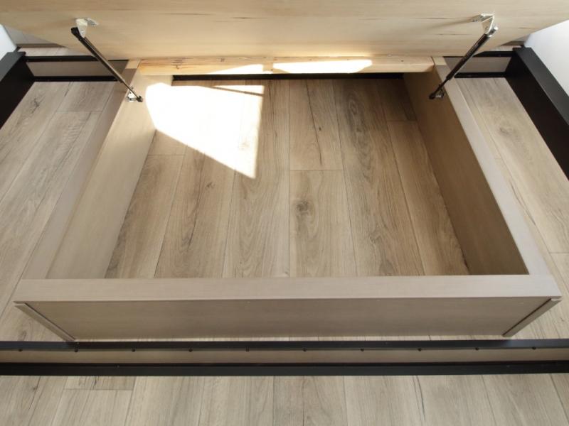 What I liked most: Sturdy aluminum steps feel reassuring and safe. The wood cabinets look great and provide lots of storage. The fireplace looks great right below the entertainment center. I really like the cabinet and nightstand on each side of the bed and the overhead shelf. Also, the leather rectangular piece on the headboard of the bed is a nice touch and makes this a more unique bedroom.