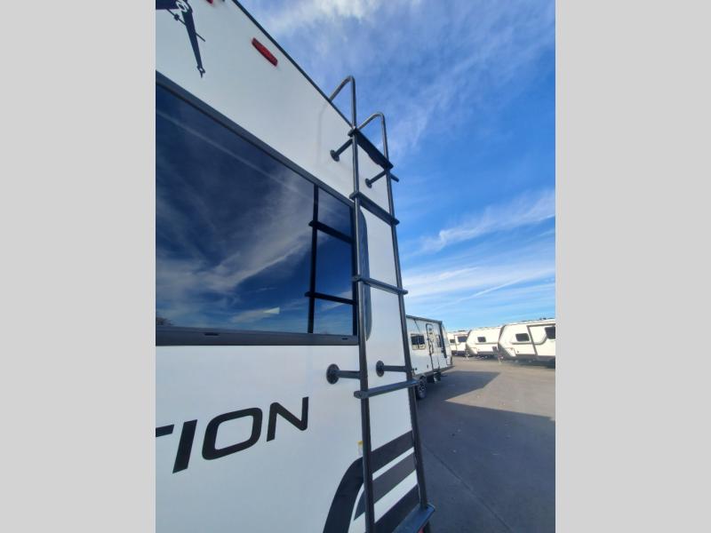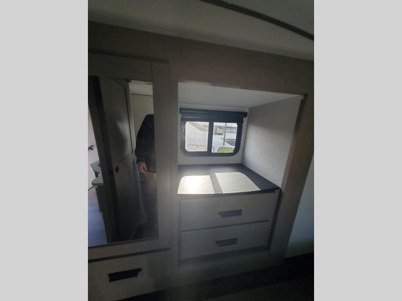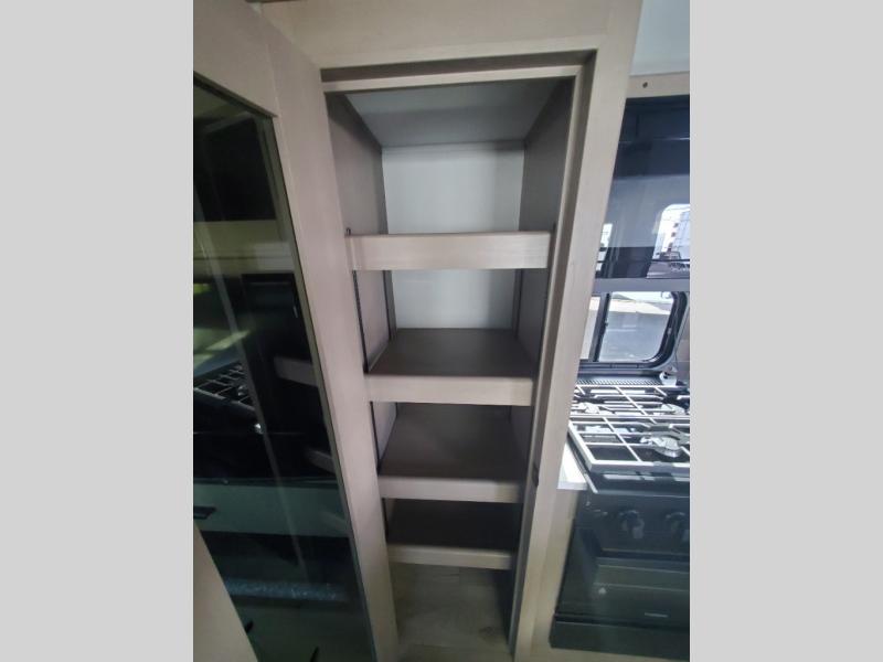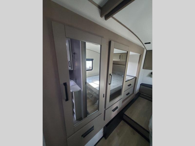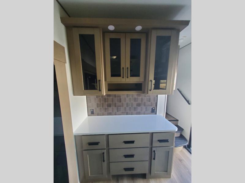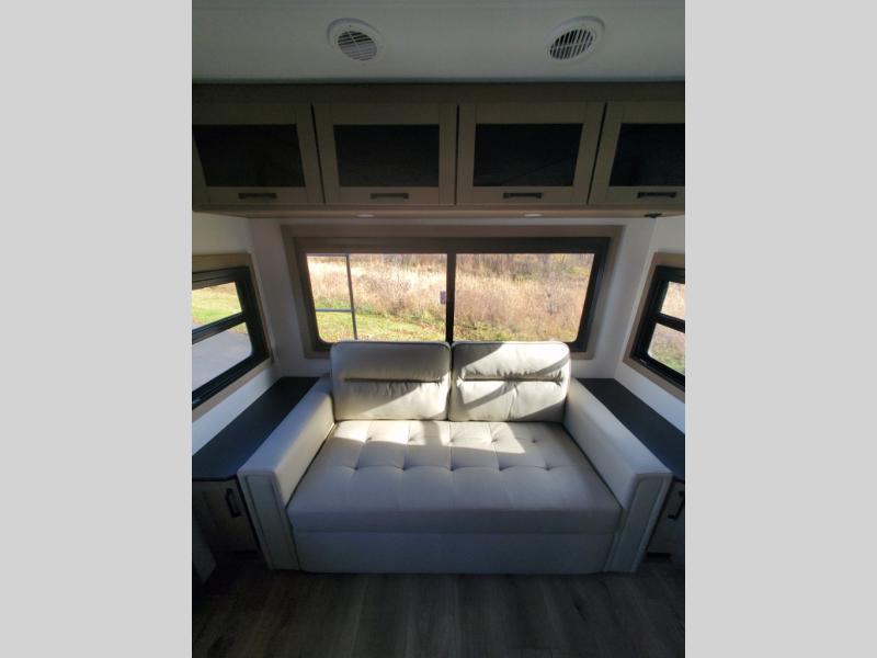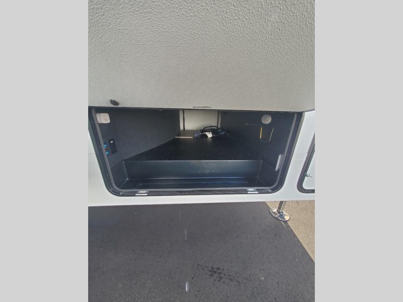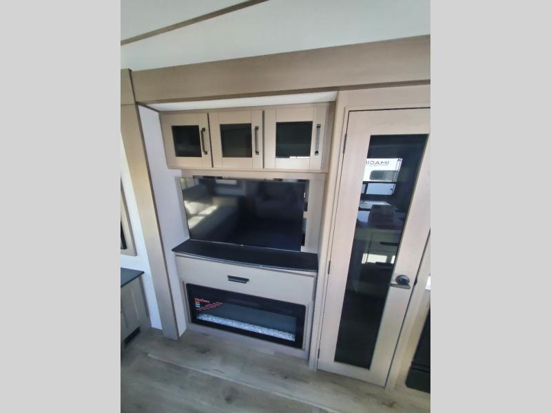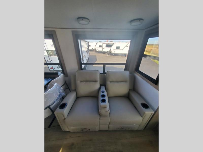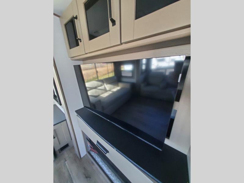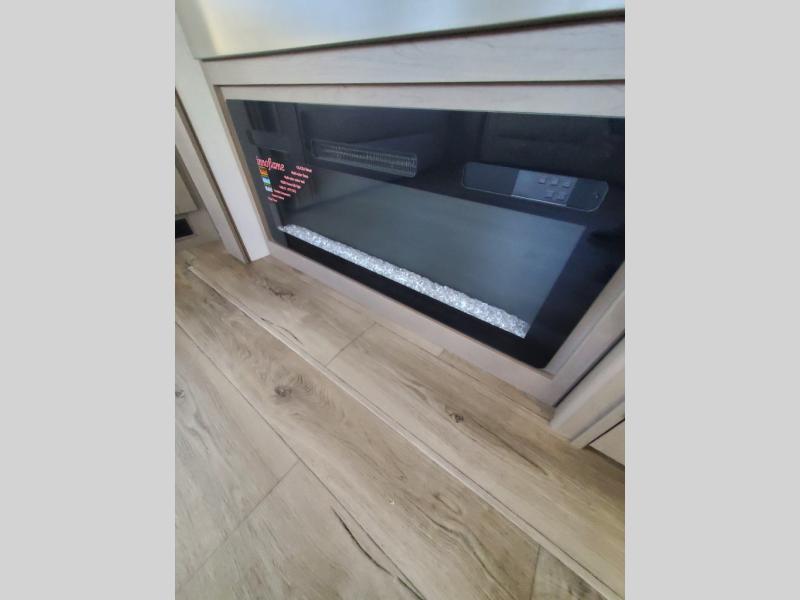 Whether you travel for pleasure or work, you will love the spacious main living and kitchen area with a rear tri-fold sofa that doubles as extra sleeping space, and the theater seating directly across from the entertainment center with a 40" LED HDTV and a fireplace below. The kitchen island will make meal prepping and drying the dishes easier and the hutch is the perfect place to place your picture frames, nice dishes, and extra cooking items. There is even a pantry that is big enough to store all of your favorite snacks, dry ingredients and such. Outside you can enjoy two electric awnings that provide protection from the elements as you relax and visit with other RVers, and your camping chairs can easily be stored in the pass-through compartment. The double entry bathroom is convenient especially at night when you can slide the door to enter from the front master bedroom. You will find plenty of storage for your clothing and gear, plus the bedroom slide out gives you drawers and linen storage that stretches into the full bathroom.