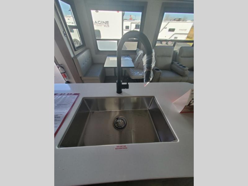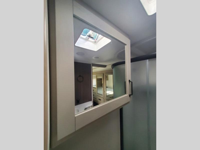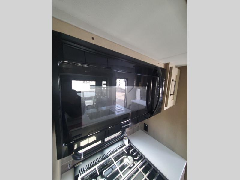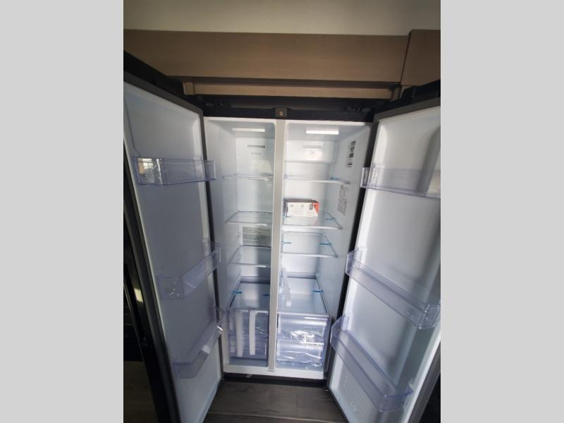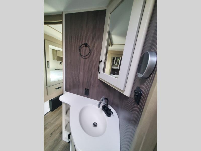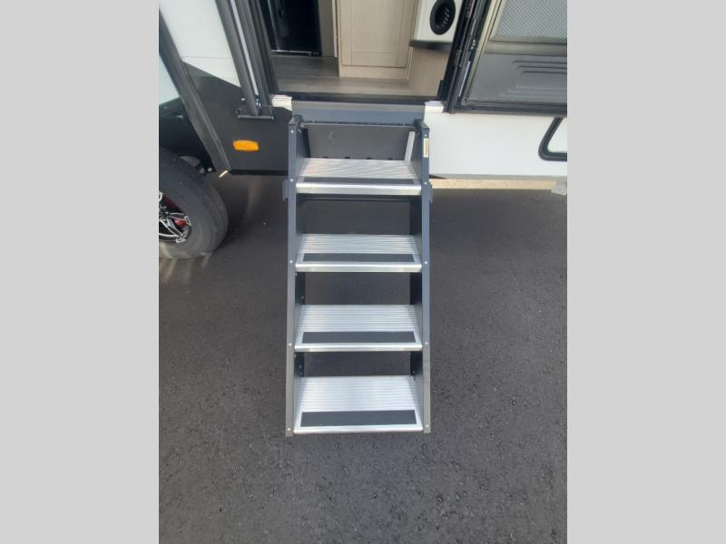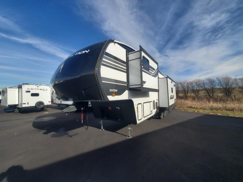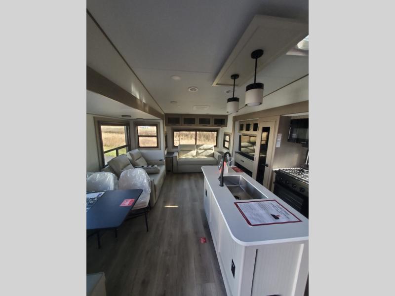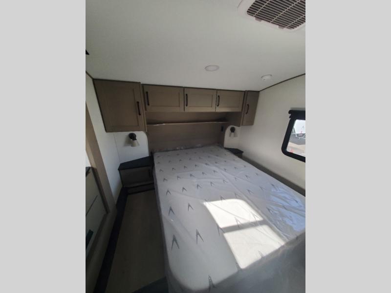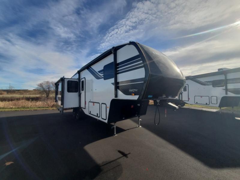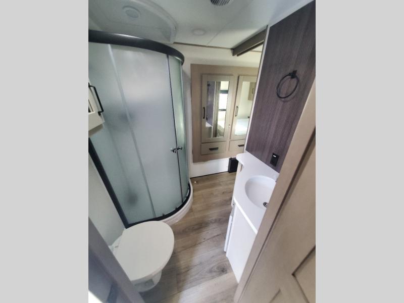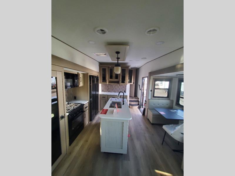 Whether you travel for pleasure or work, you will love the spacious main living and kitchen area with a rear tri-fold sofa that doubles as extra sleeping space, and the theater seating directly across from the entertainment center with a 40" LED HDTV and a fireplace below. The kitchen island will make meal prepping and drying the dishes easier and the hutch is the perfect place to place your picture frames, nice dishes, and extra cooking items. There is even a pantry that is big enough to store all of your favorite snacks, dry ingredients and such. Outside you can enjoy two electric awnings that provide protection from the elements as you relax and visit with other RVers, and your camping chairs can easily be stored in the pass-through compartment. The double entry bathroom is convenient especially at night when you can slide the door to enter from the front master bedroom. You will find plenty of storage for your clothing and gear, plus the bedroom slide out gives you drawers and linen storage that stretches into the full bathroom.