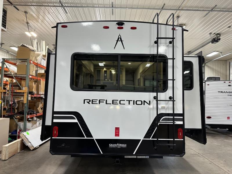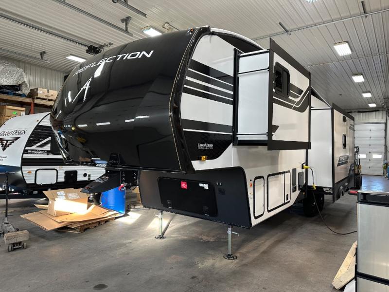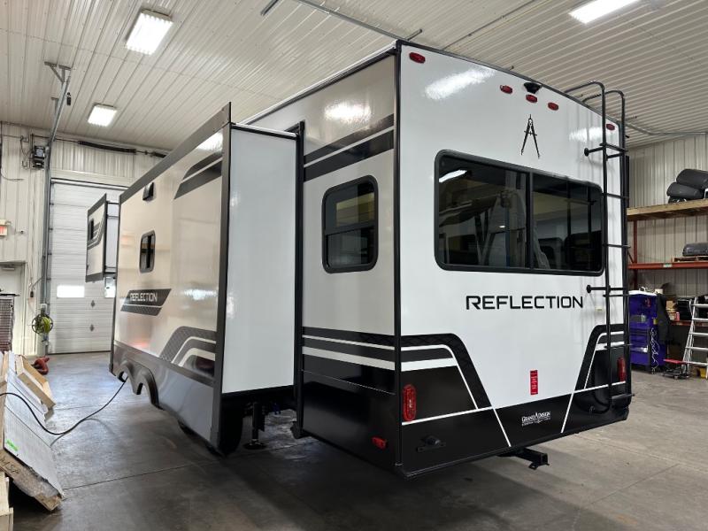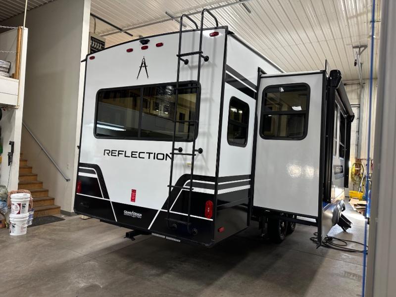 With any Reflection fifth wheel by Grand Design, you will have a solar panel for off-grid camping and a 60 amp charge controller and inverter prep, a Universal All-In-One docking station, unobstructed pass-through storage, and Goodyear Endurance tires. Each is constructed of gel coat exterior sidewalls, residential 5" truss rafters, walk-on roof decking, a fiberglass and radiant foil roof and front cap insulation plus laminated aluminum framed side walls, roof and end walls in slide rooms. Head inside to enjoy residential hardwood cabinet doors, premium Congoleum flooring, a spacious shower with a glass door, and many more comforts!
