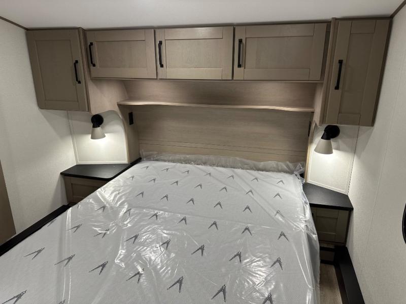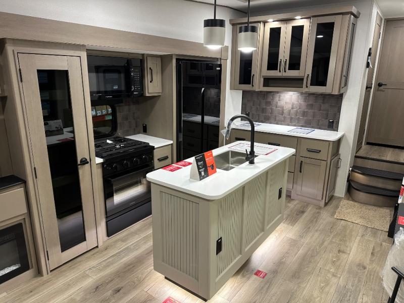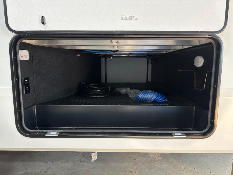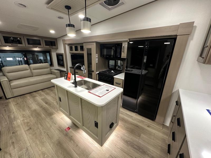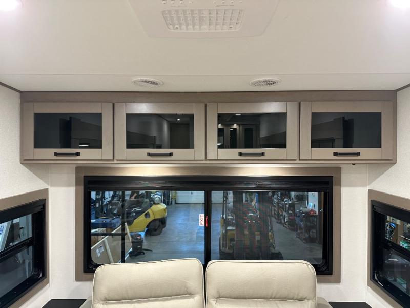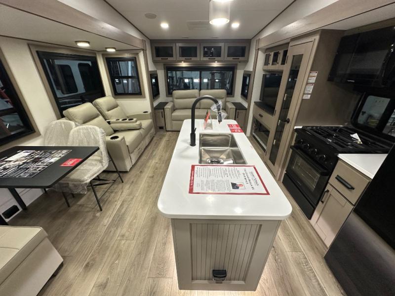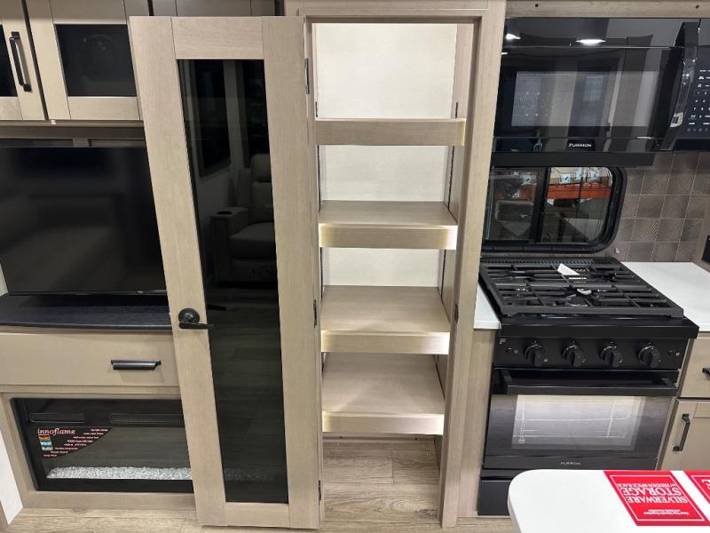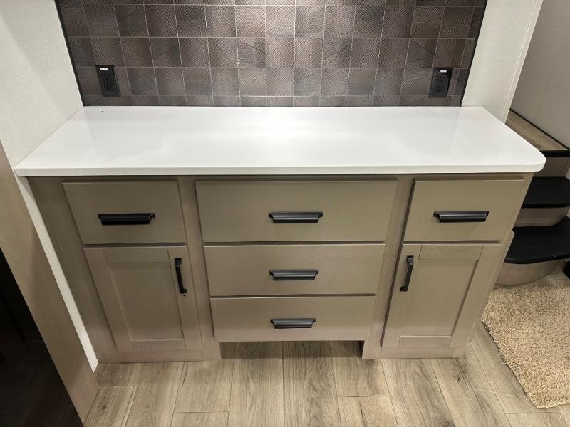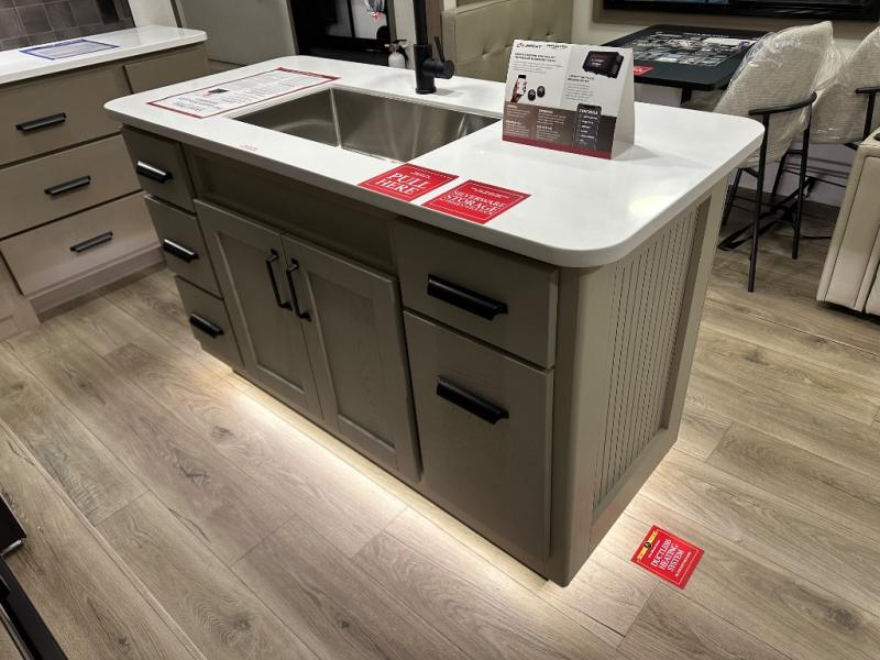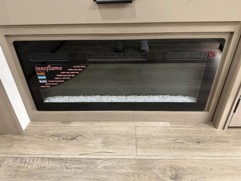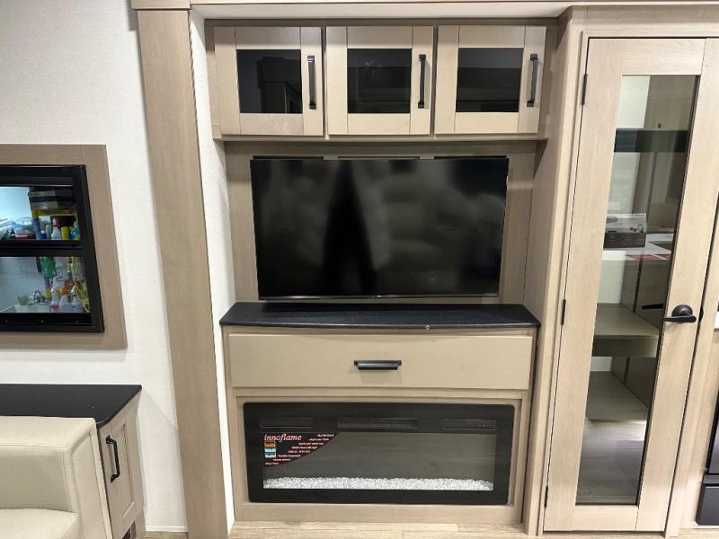 Whether you travel for pleasure or work, you will love the spacious main living and kitchen area with a rear tri-fold sofa that doubles as extra sleeping space, and the theater seating directly across from the entertainment center with a 40" LED HDTV and a fireplace below. The kitchen island will make meal prepping and drying the dishes easier and the hutch is the perfect place to place your picture frames, nice dishes, and extra cooking items. There is even a pantry that is big enough to store all of your favorite snacks, dry ingredients and such. Outside you can enjoy two electric awnings that provide protection from the elements as you relax and visit with other RVers, and your camping chairs can easily be stored in the pass-through compartment. The double entry bathroom is convenient especially at night when you can slide the door to enter from the front master bedroom. You will find plenty of storage for your clothing and gear, plus the bedroom slide out gives you drawers and linen storage that stretches into the full bathroom.