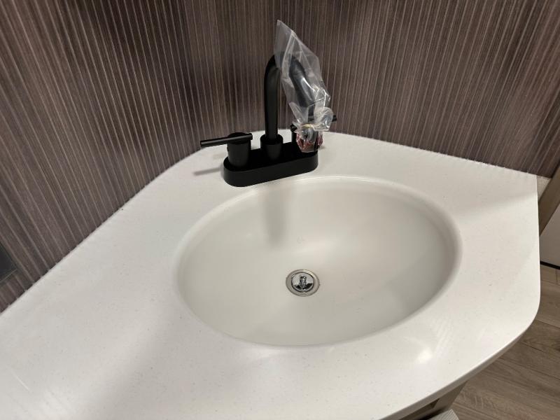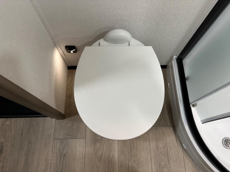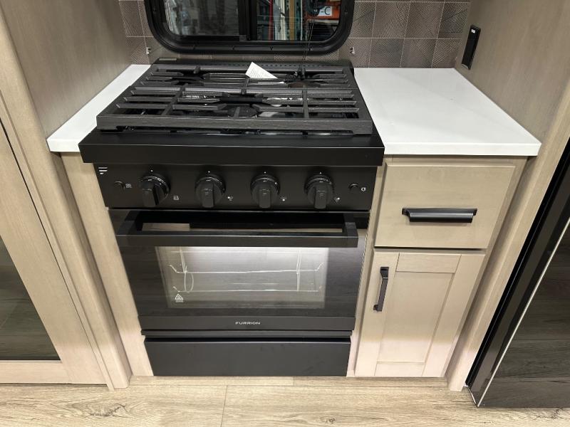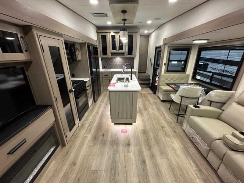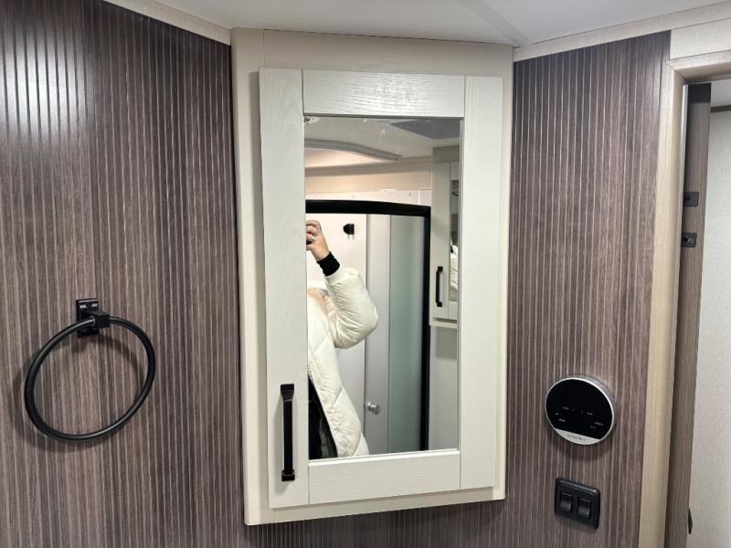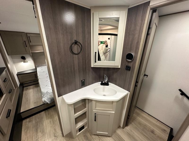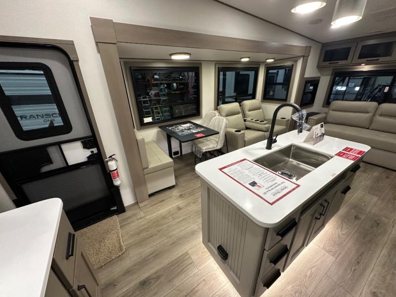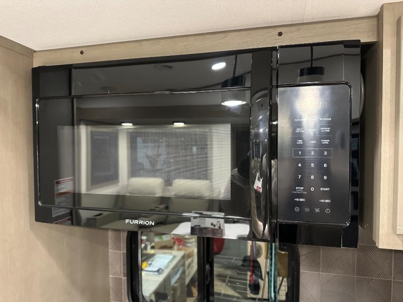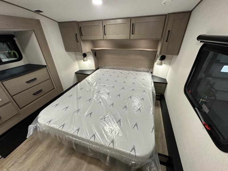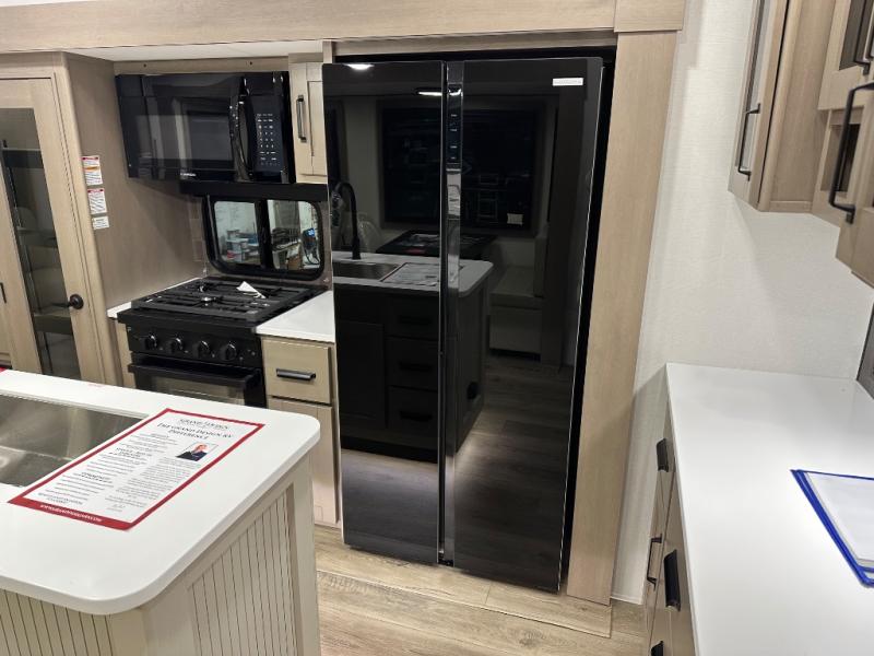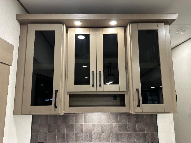 Whether you travel for pleasure or work, you will love the spacious main living and kitchen area with a rear tri-fold sofa that doubles as extra sleeping space, and the theater seating directly across from the entertainment center with a 40" LED HDTV and a fireplace below. The kitchen island will make meal prepping and drying the dishes easier and the hutch is the perfect place to place your picture frames, nice dishes, and extra cooking items. There is even a pantry that is big enough to store all of your favorite snacks, dry ingredients and such. Outside you can enjoy two electric awnings that provide protection from the elements as you relax and visit with other RVers, and your camping chairs can easily be stored in the pass-through compartment. The double entry bathroom is convenient especially at night when you can slide the door to enter from the front master bedroom. You will find plenty of storage for your clothing and gear, plus the bedroom slide out gives you drawers and linen storage that stretches into the full bathroom.