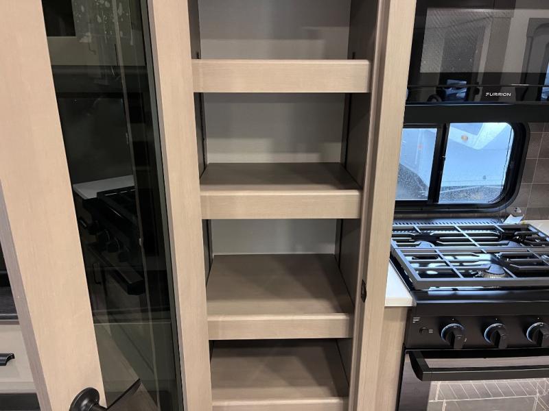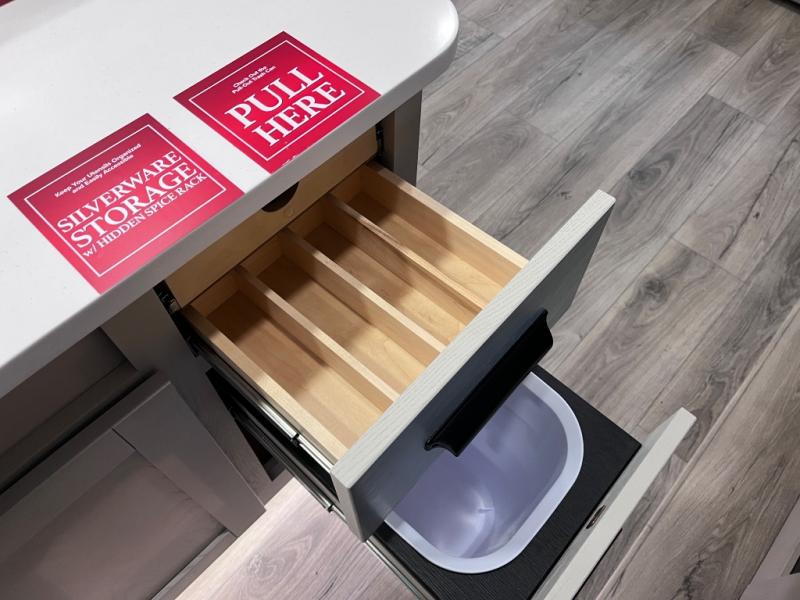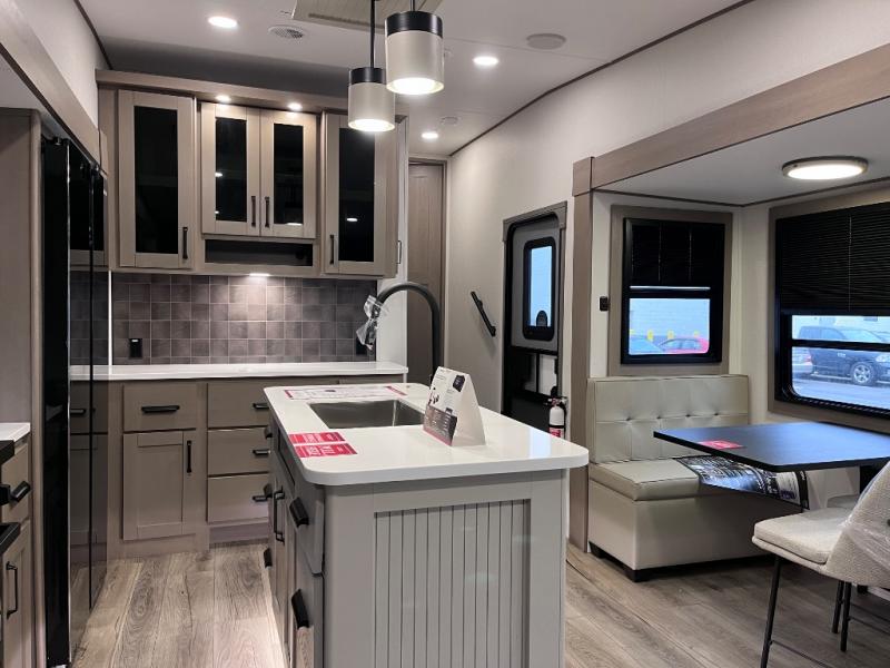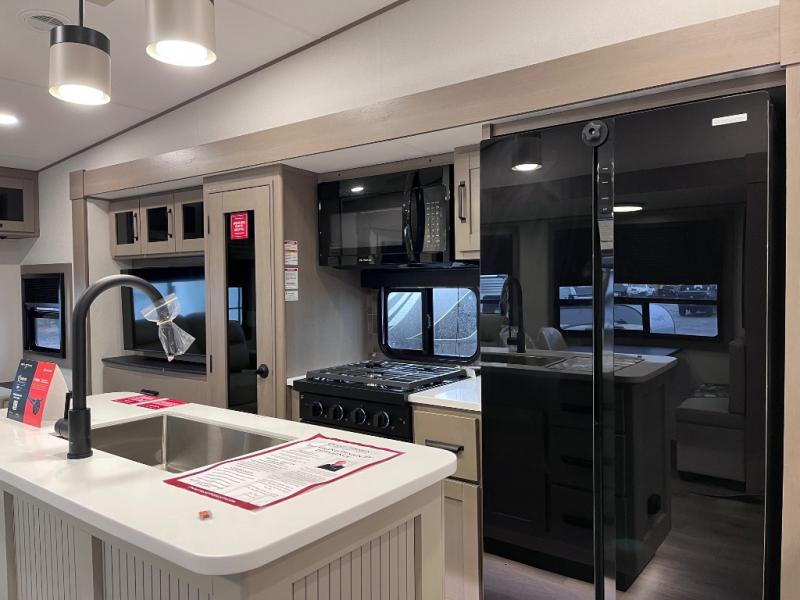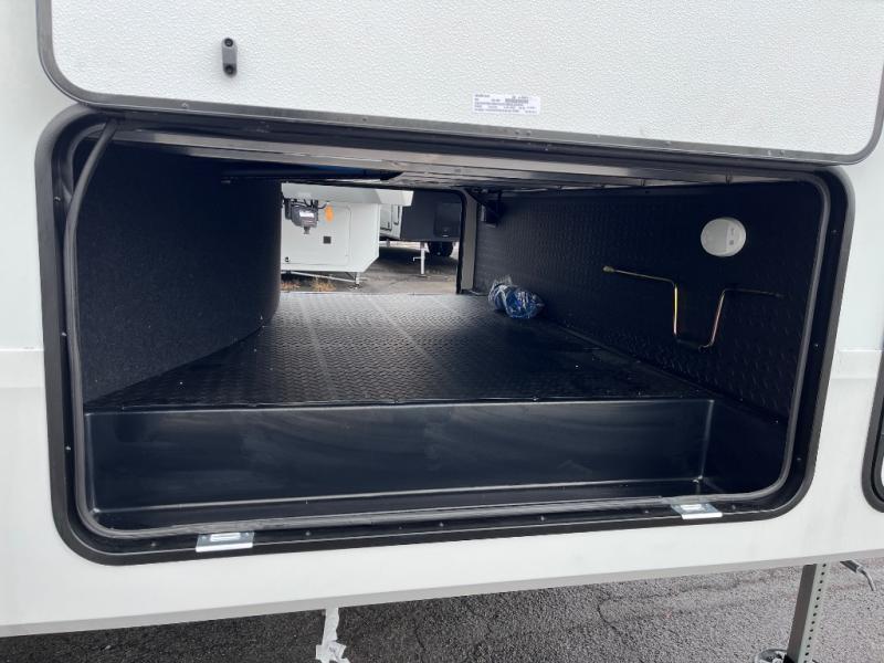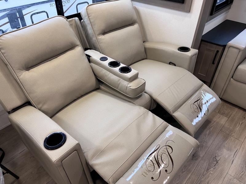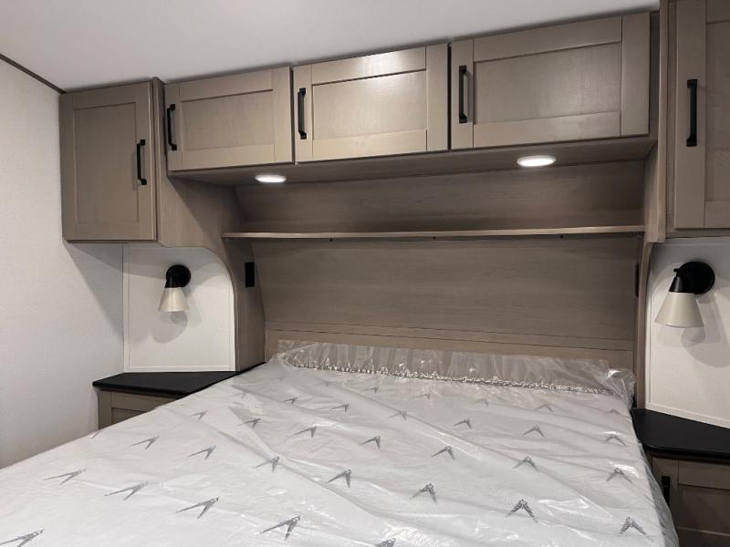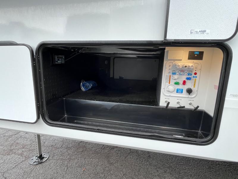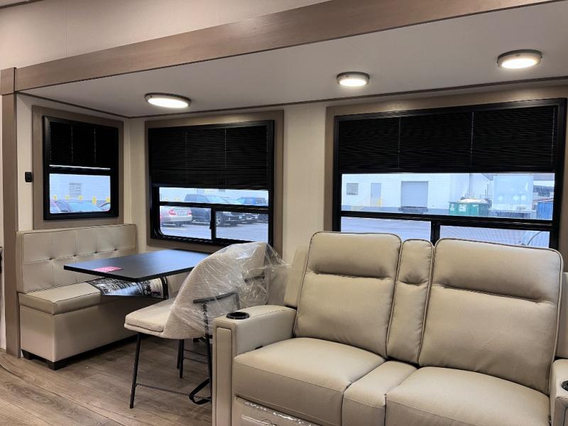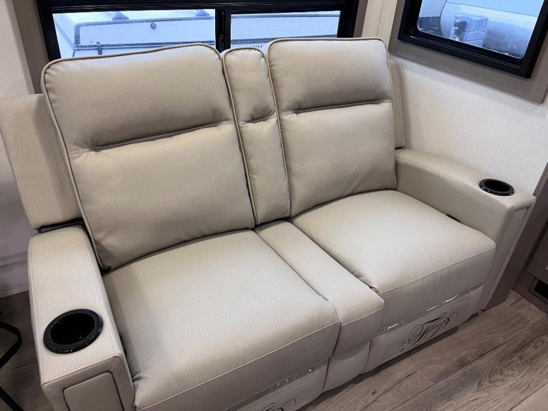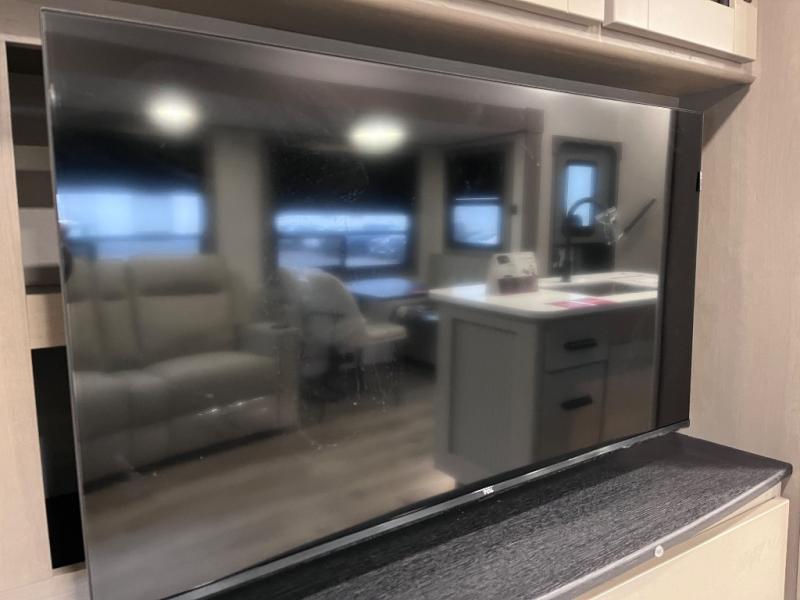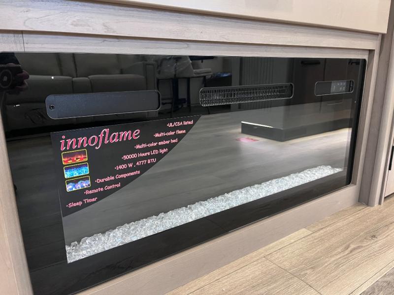 Whether you travel for pleasure or work, you will love the spacious main living and kitchen area with a rear tri-fold sofa that doubles as extra sleeping space, and the theater seating directly across from the entertainment center with a 40" LED HDTV and a fireplace below. The kitchen island will make meal prepping and drying the dishes easier and the hutch is the perfect place to place your picture frames, nice dishes, and extra cooking items. There is even a pantry that is big enough to store all of your favorite snacks, dry ingredients and such. Outside you can enjoy two electric awnings that provide protection from the elements as you relax and visit with other RVers, and your camping chairs can easily be stored in the pass-through compartment. The double entry bathroom is convenient especially at night when you can slide the door to enter from the front master bedroom. You will find plenty of storage for your clothing and gear, plus the bedroom slide out gives you drawers and linen storage that stretches into the full bathroom.
