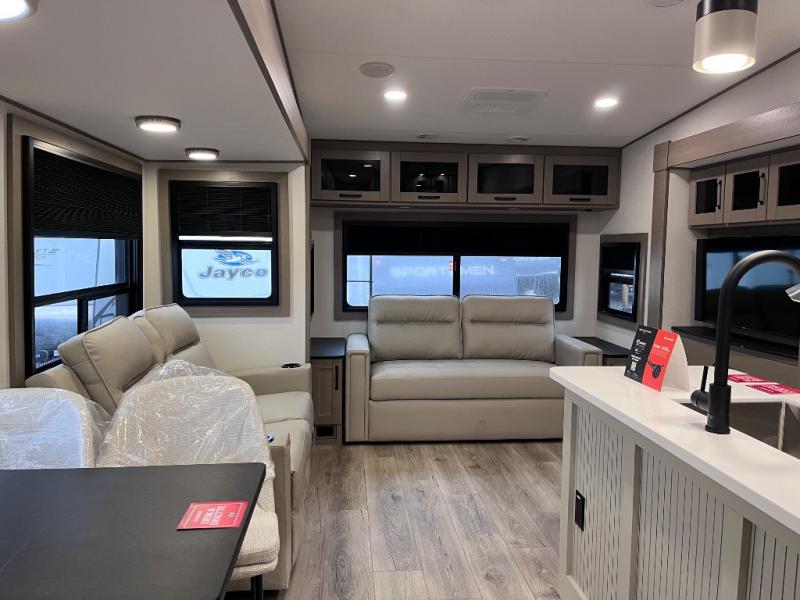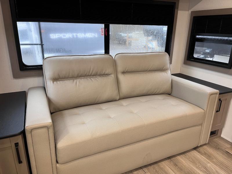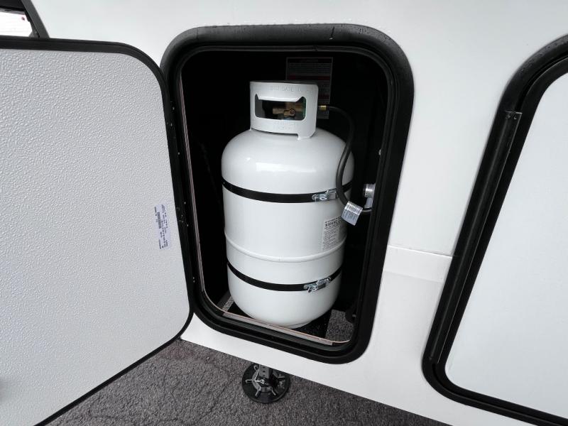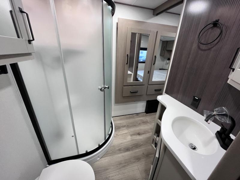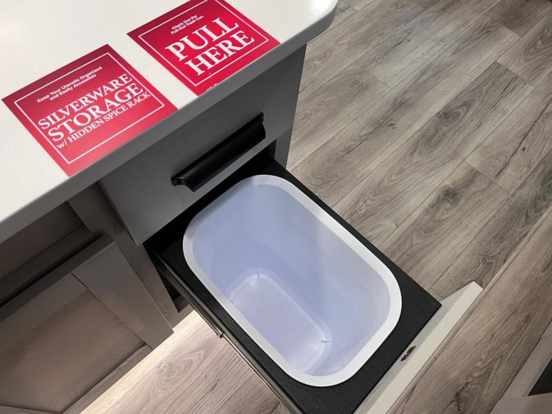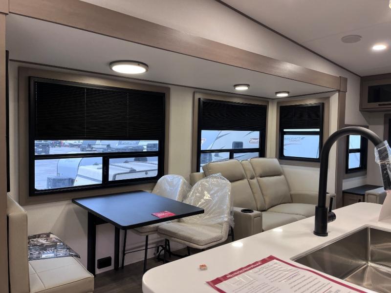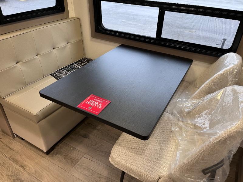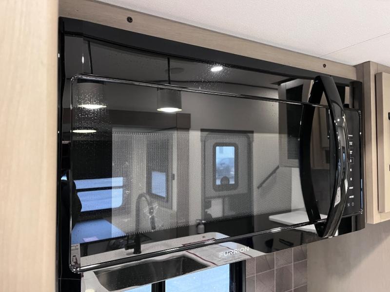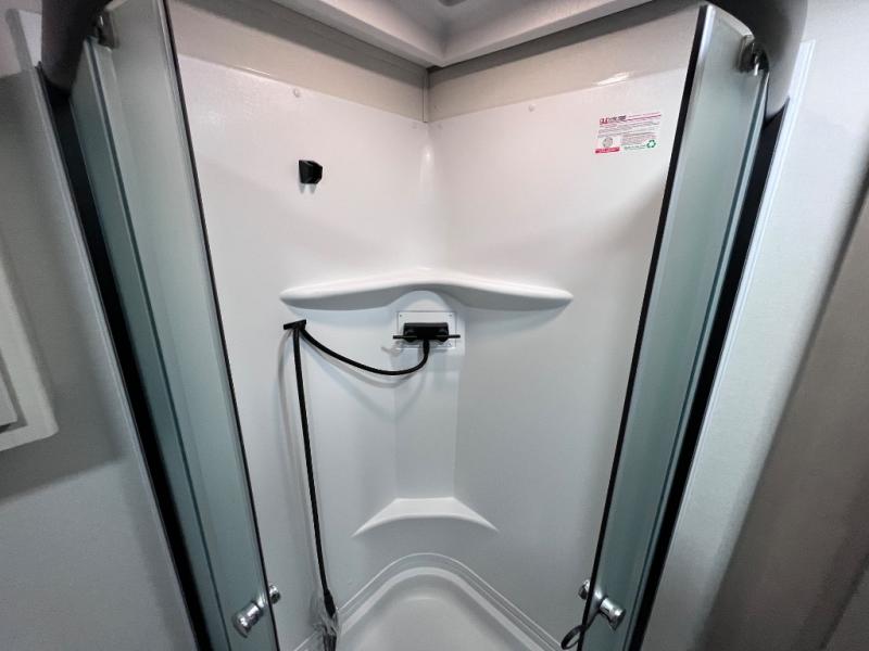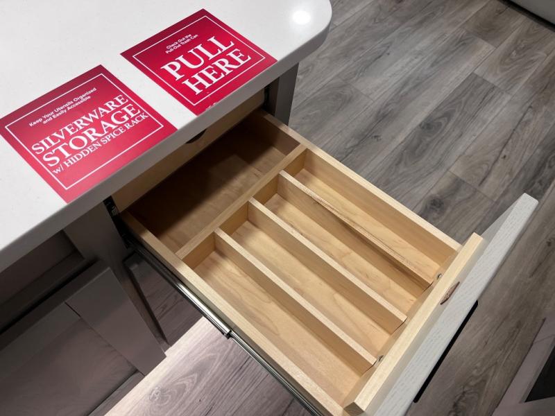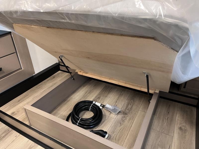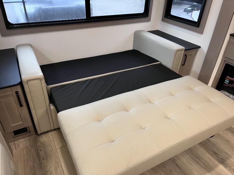 Whether you travel for pleasure or work, you will love the spacious main living and kitchen area with a rear tri-fold sofa that doubles as extra sleeping space, and the theater seating directly across from the entertainment center with a 40" LED HDTV and a fireplace below. The kitchen island will make meal prepping and drying the dishes easier and the hutch is the perfect place to place your picture frames, nice dishes, and extra cooking items. There is even a pantry that is big enough to store all of your favorite snacks, dry ingredients and such. Outside you can enjoy two electric awnings that provide protection from the elements as you relax and visit with other RVers, and your camping chairs can easily be stored in the pass-through compartment. The double entry bathroom is convenient especially at night when you can slide the door to enter from the front master bedroom. You will find plenty of storage for your clothing and gear, plus the bedroom slide out gives you drawers and linen storage that stretches into the full bathroom.