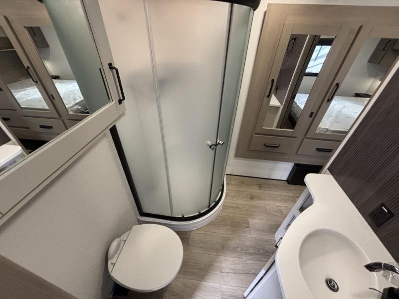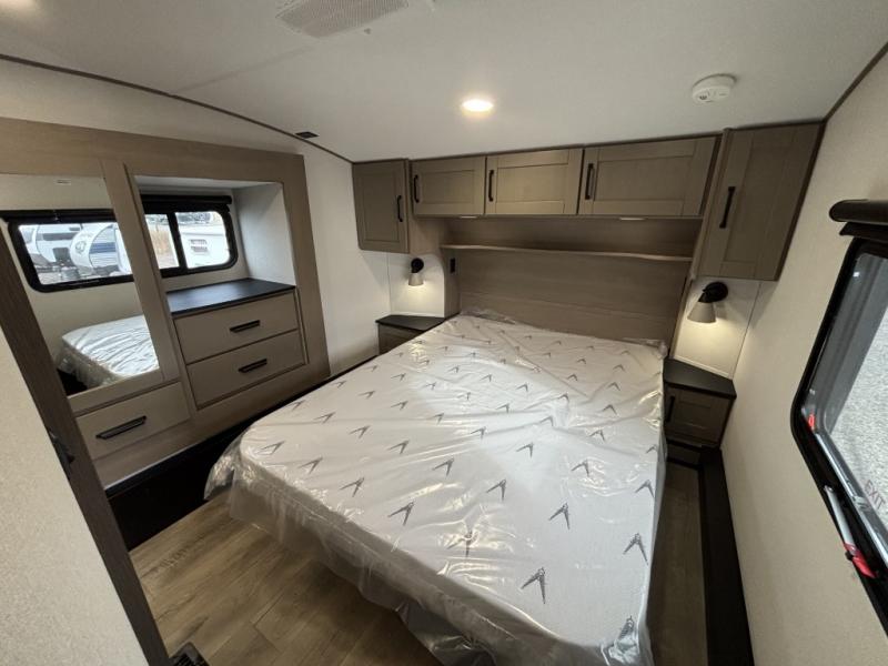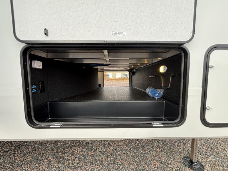 Whether you travel for pleasure or work, you will love the spacious main living and kitchen area with a rear tri-fold sofa that doubles as extra sleeping space, and the theater seating directly across from the entertainment center with a 40" LED HDTV and a fireplace below. The kitchen island will make meal prepping and drying the dishes easier and the hutch is the perfect place to place your picture frames, nice dishes, and extra cooking items. There is even a pantry that is big enough to store all of your favorite snacks, dry ingredients and such. Outside you can enjoy two electric awnings that provide protection from the elements as you relax and visit with other RVers, and your camping chairs can easily be stored in the pass-through compartment. The double entry bathroom is convenient especially at night when you can slide the door to enter from the front master bedroom. You will find plenty of storage for your clothing and gear, plus the bedroom slide out gives you drawers and linen storage that stretches into the full bathroom.