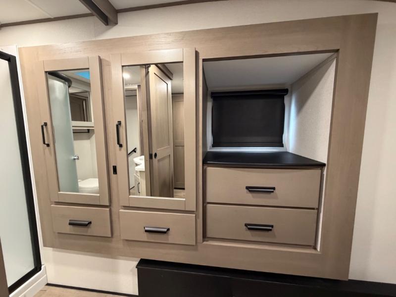 Whether you travel for pleasure or work, you will love the spacious main living and kitchen area with a rear tri-fold sofa that doubles as extra sleeping space, and the theater seating directly across from the entertainment center with a 40" LED HDTV and a fireplace below. The kitchen island will make meal prepping and drying the dishes easier and the hutch is the perfect place to place your picture frames, nice dishes, and extra cooking items. There is even a pantry that is big enough to store all of your favorite snacks, dry ingredients and such. Outside you can enjoy two electric awnings that provide protection from the elements as you relax and visit with other RVers, and your camping chairs can easily be stored in the pass-through compartment. The double entry bathroom is convenient especially at night when you can slide the door to enter from the front master bedroom. You will find plenty of storage for your clothing and gear, plus the bedroom slide out gives you drawers and linen storage that stretches into the full bathroom.