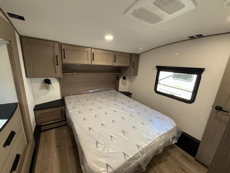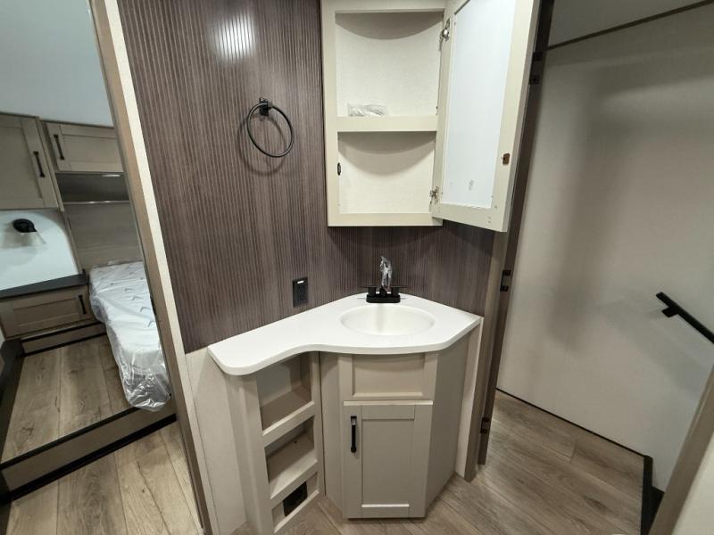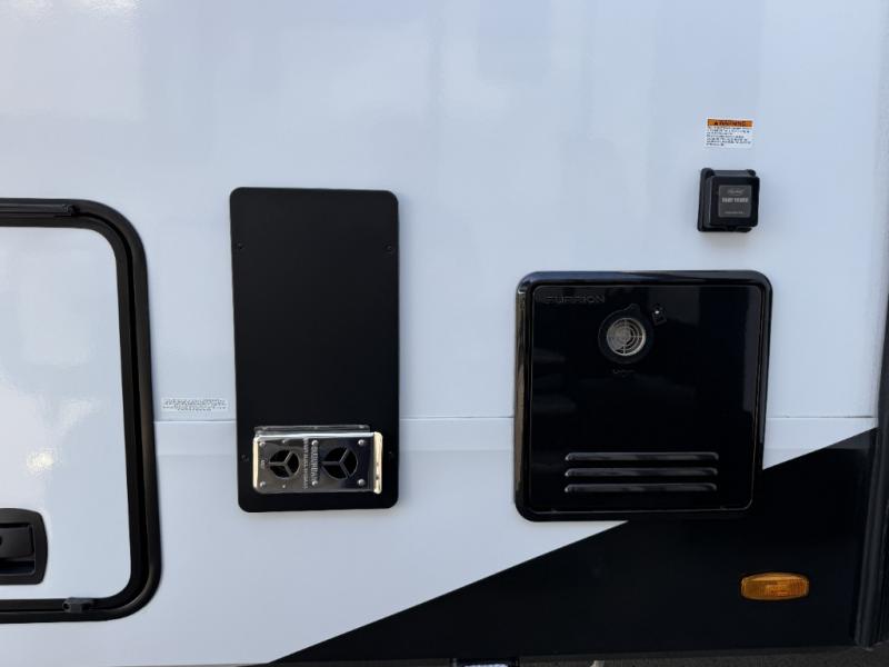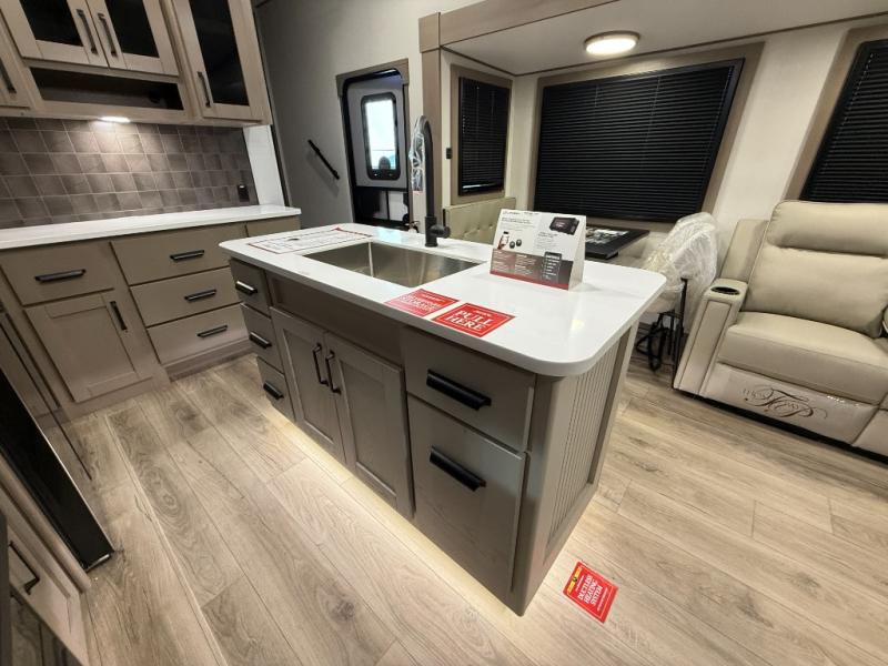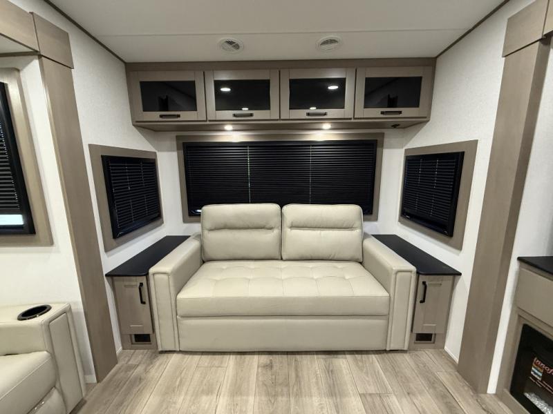Whether you travel for pleasure or work, you will love the spacious main living and kitchen area with a rear tri-fold sofa that doubles as extra sleeping space, and the theater seating directly across from the entertainment center with a 40" LED HDTV and a fireplace below. The kitchen island will make meal prepping and drying the dishes easier and the hutch is the perfect place to place your picture frames, nice dishes, and extra cooking items. There is even a pantry that is big enough to store all of your favorite snacks, dry ingredients and such. Outside you can enjoy two electric awnings that provide protection from the elements as you relax and visit with other RVers, and your camping chairs can easily be stored in the pass-through compartment. The double entry bathroom is convenient especially at night when you can slide the door to enter from the front master bedroom. You will find plenty of storage for your clothing and gear, plus the bedroom slide out gives you drawers and linen storage that stretches into the full bathroom.