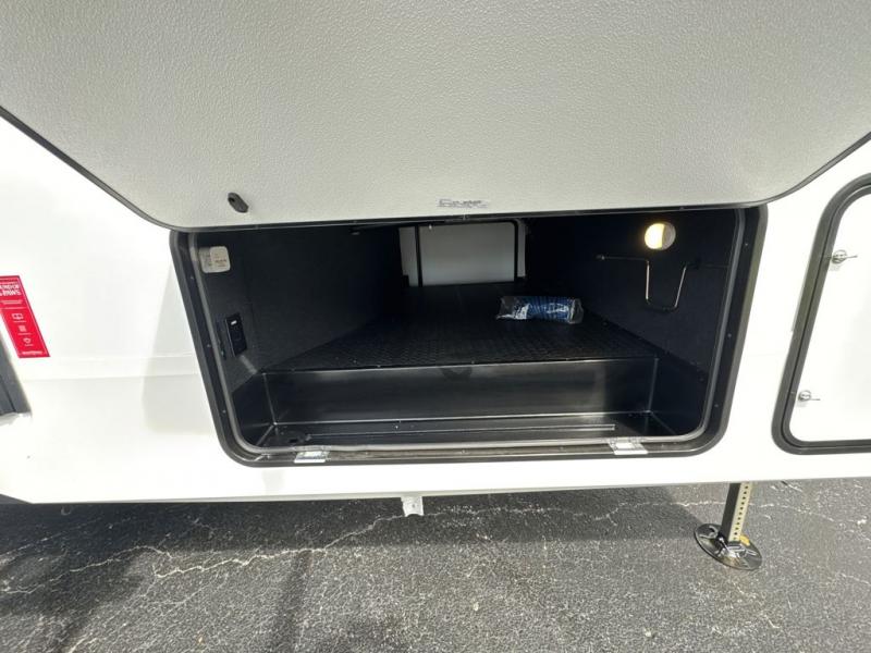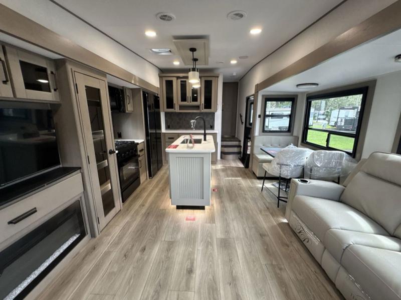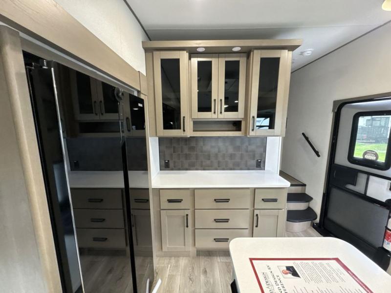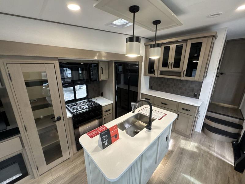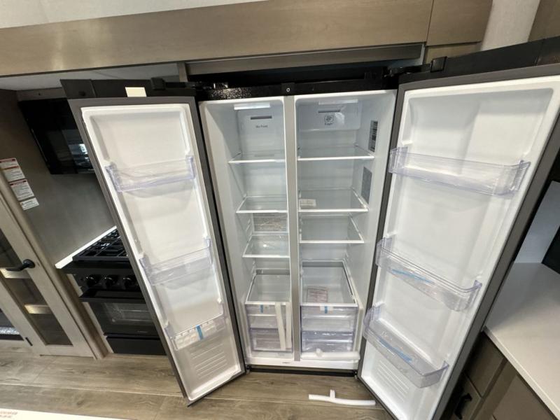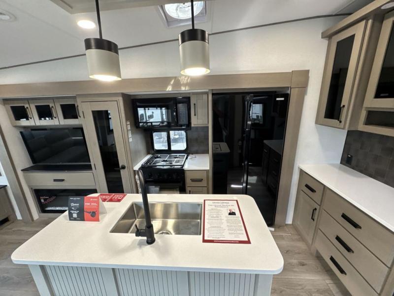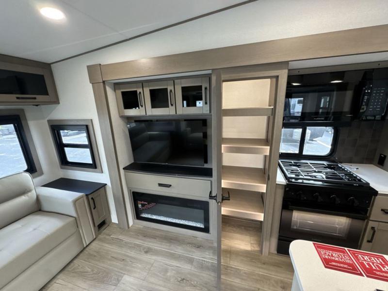 Whether you travel for pleasure or work, you will love the spacious main living and kitchen area with a rear tri-fold sofa that doubles as extra sleeping space, and the theater seating directly across from the entertainment center with a 40" LED HDTV and a fireplace below. The kitchen island will make meal prepping and drying the dishes easier and the hutch is the perfect place to place your picture frames, nice dishes, and extra cooking items. There is even a pantry that is big enough to store all of your favorite snacks, dry ingredients and such. Outside you can enjoy two electric awnings that provide protection from the elements as you relax and visit with other RVers, and your camping chairs can easily be stored in the pass-through compartment. The double entry bathroom is convenient especially at night when you can slide the door to enter from the front master bedroom. You will find plenty of storage for your clothing and gear, plus the bedroom slide out gives you drawers and linen storage that stretches into the full bathroom.