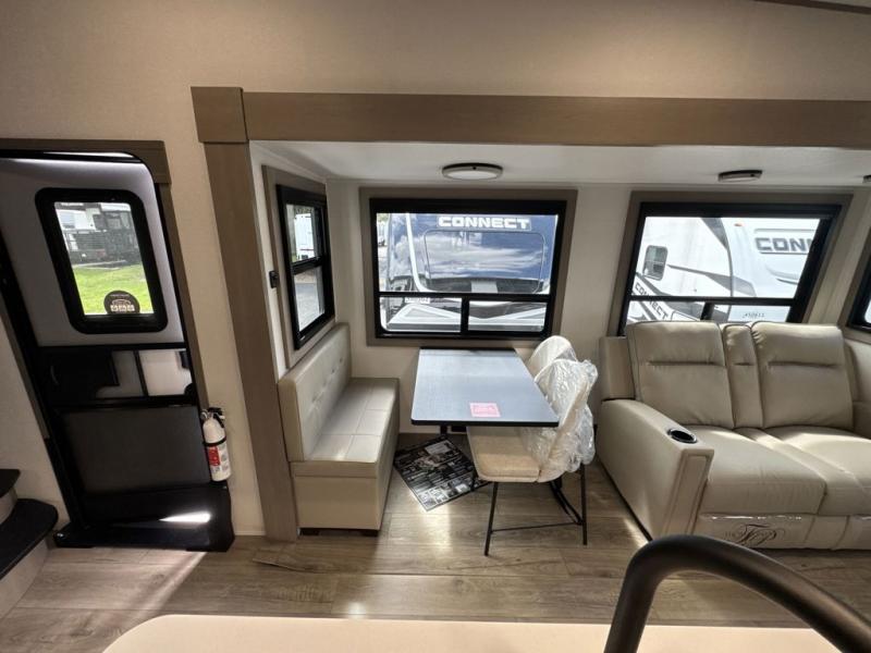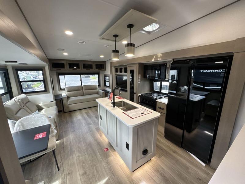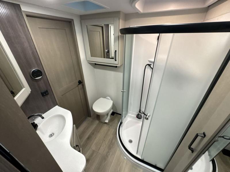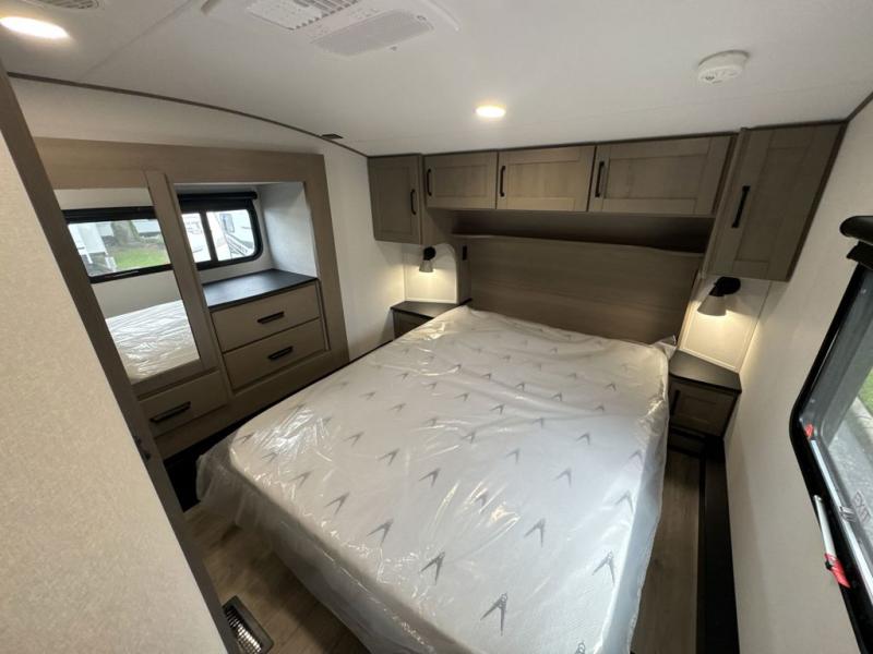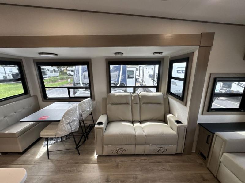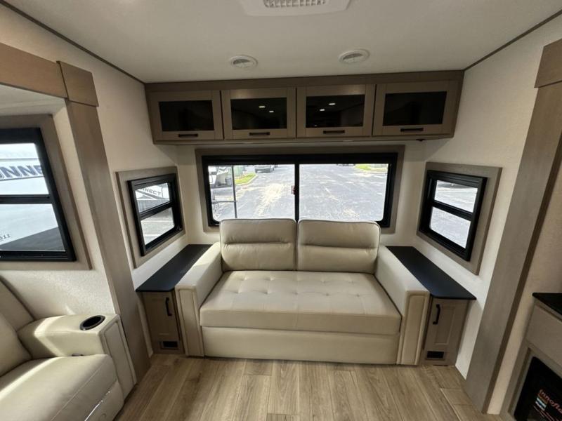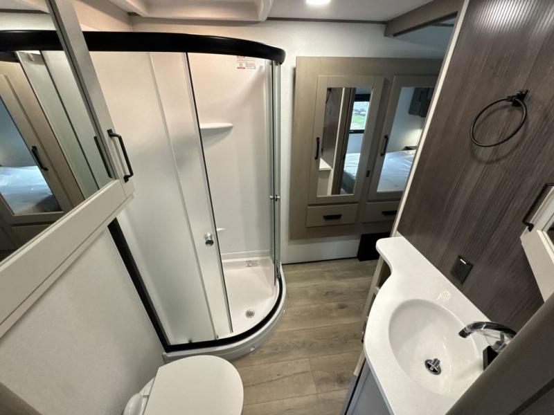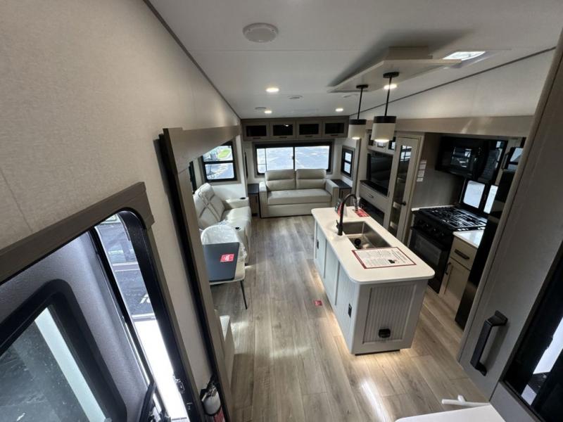 Whether you travel for pleasure or work, you will love the spacious main living and kitchen area with a rear tri-fold sofa that doubles as extra sleeping space, and the theater seating directly across from the entertainment center with a 40" LED HDTV and a fireplace below. The kitchen island will make meal prepping and drying the dishes easier and the hutch is the perfect place to place your picture frames, nice dishes, and extra cooking items. There is even a pantry that is big enough to store all of your favorite snacks, dry ingredients and such. Outside you can enjoy two electric awnings that provide protection from the elements as you relax and visit with other RVers, and your camping chairs can easily be stored in the pass-through compartment. The double entry bathroom is convenient especially at night when you can slide the door to enter from the front master bedroom. You will find plenty of storage for your clothing and gear, plus the bedroom slide out gives you drawers and linen storage that stretches into the full bathroom.
