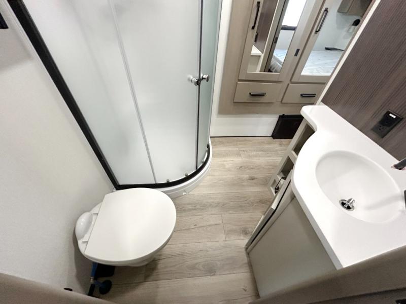 Whether you travel for pleasure or work, you will love the spacious main living and kitchen area with a rear tri-fold sofa that doubles as extra sleeping space, and the theater seating directly across from the entertainment center with a 40" LED HDTV and a fireplace below. The kitchen island will make meal prepping and drying the dishes easier and the hutch is the perfect place to place your picture frames, nice dishes, and extra cooking items. There is even a pantry that is big enough to store all of your favorite snacks, dry ingredients and such. Outside you can enjoy two electric awnings that provide protection from the elements as you relax and visit with other RVers, and your camping chairs can easily be stored in the pass-through compartment. The double entry bathroom is convenient especially at night when you can slide the door to enter from the front master bedroom. You will find plenty of storage for your clothing and gear, plus the bedroom slide out gives you drawers and linen storage that stretches into the full bathroom.