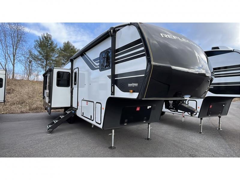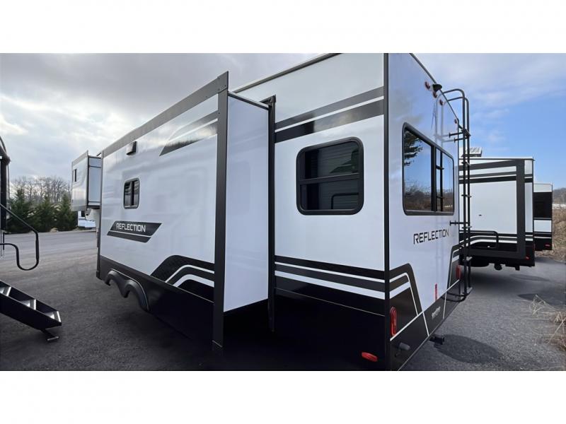 With any Reflection fifth wheel by Grand Design, you will have a solar panel for off-grid camping and a 60 amp charge controller and inverter prep, a Universal All-In-One docking station, unobstructed pass-through storage, and Goodyear Endurance tires. Each is constructed of gel coat exterior sidewalls, residential 5" truss rafters, walk-on roof decking, a fiberglass and radiant foil roof and front cap insulation plus laminated aluminum framed side walls, roof and end walls in slide rooms. Head inside to enjoy residential hardwood cabinet doors, premium Congoleum flooring, a spacious shower with a glass door, and many more comforts!