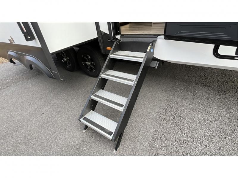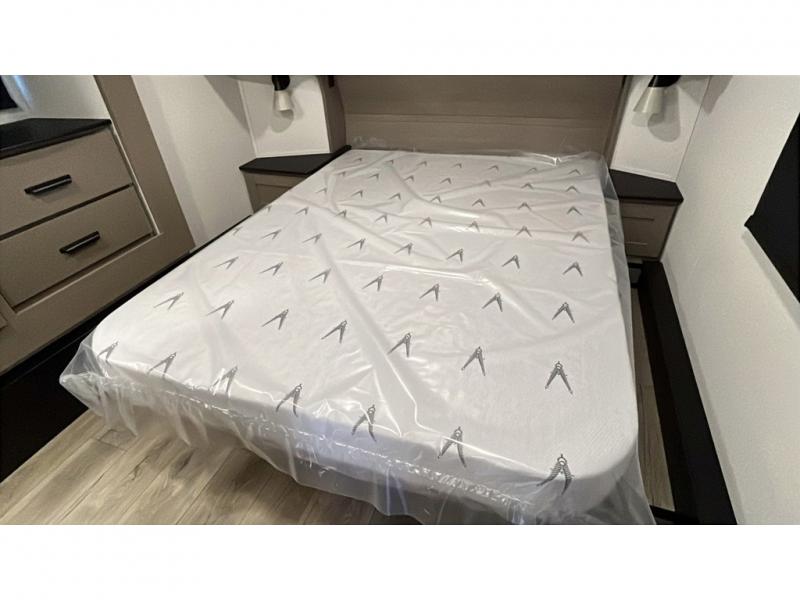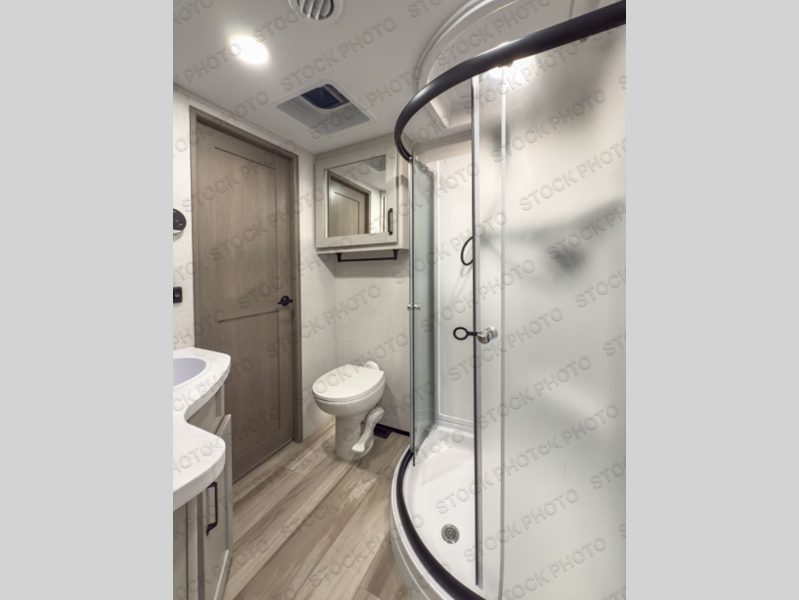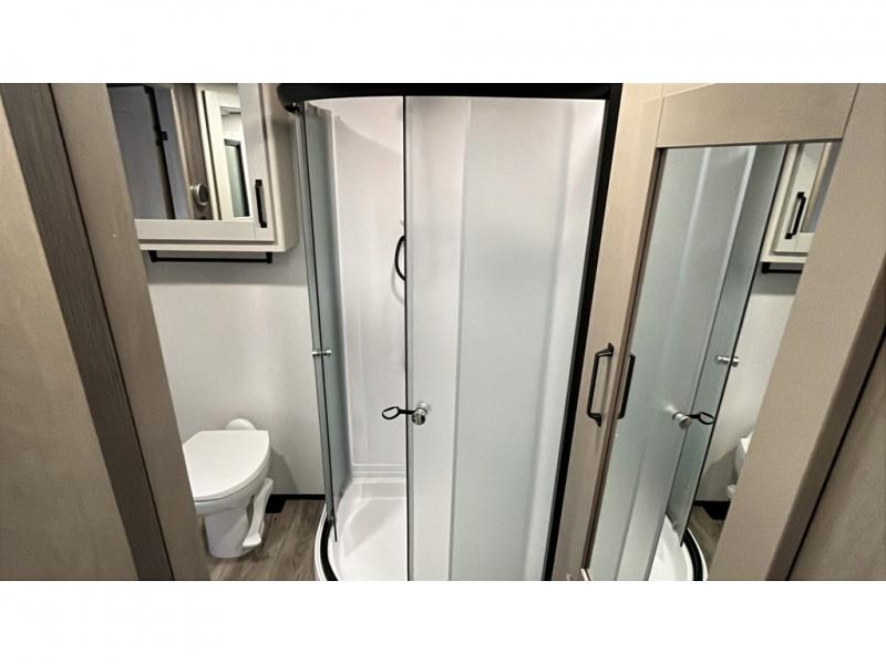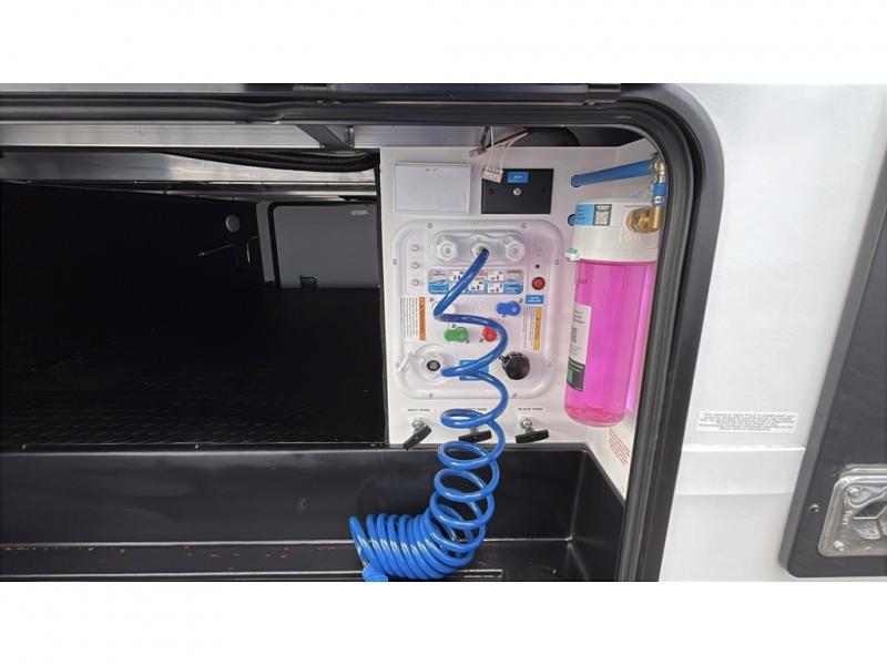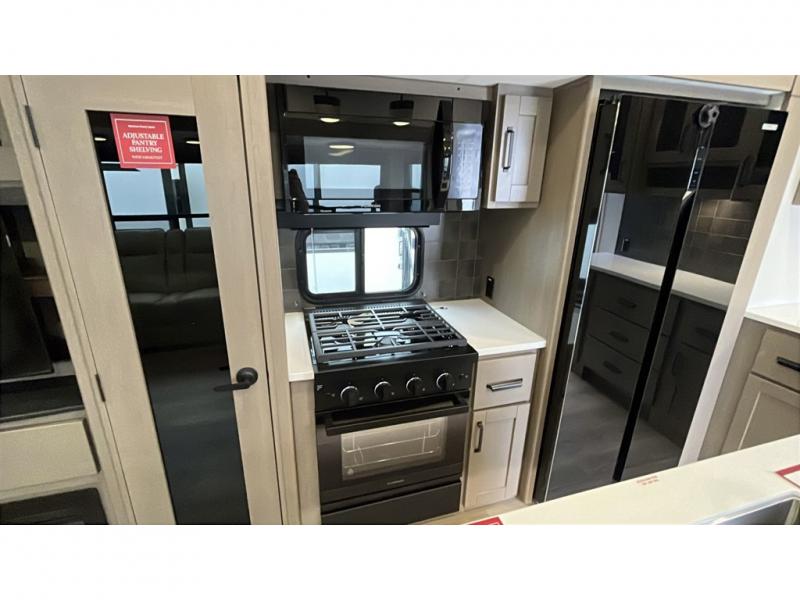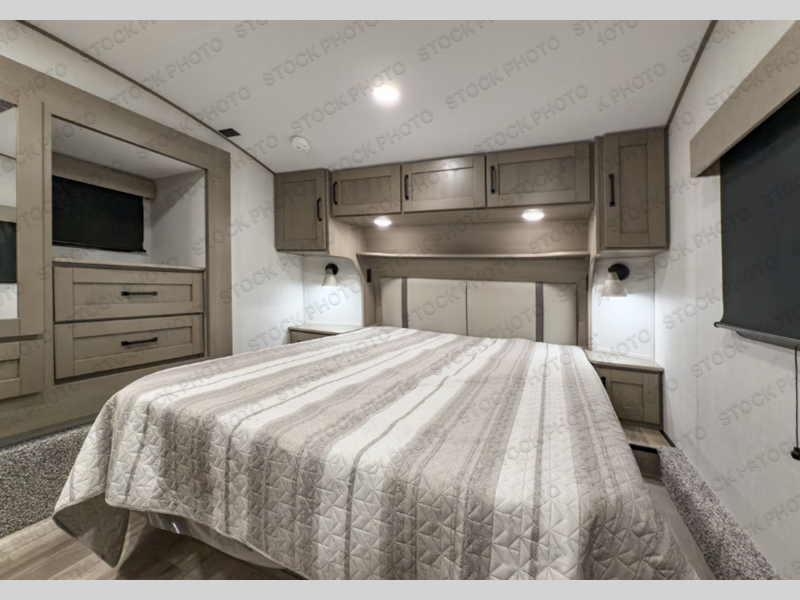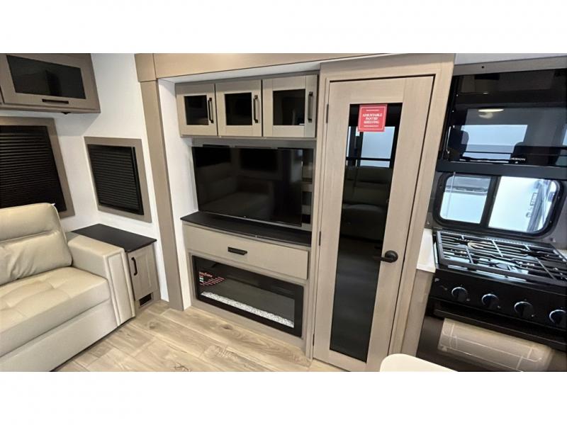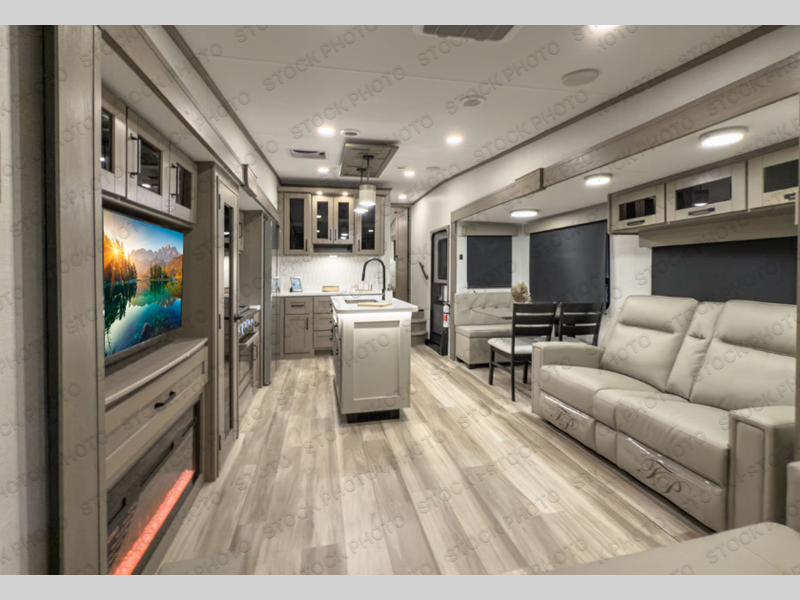 Whether you travel for pleasure or work, you will love the spacious main living and kitchen area with a rear tri-fold sofa that doubles as extra sleeping space, and the theater seating directly across from the entertainment center with a 40" LED HDTV and a fireplace below. The kitchen island will make meal prepping and drying the dishes easier and the hutch is the perfect place to place your picture frames, nice dishes, and extra cooking items. There is even a pantry that is big enough to store all of your favorite snacks, dry ingredients and such. Outside you can enjoy two electric awnings that provide protection from the elements as you relax and visit with other RVers, and your camping chairs can easily be stored in the pass-through compartment. The double entry bathroom is convenient especially at night when you can slide the door to enter from the front master bedroom. You will find plenty of storage for your clothing and gear, plus the bedroom slide out gives you drawers and linen storage that stretches into the full bathroom.