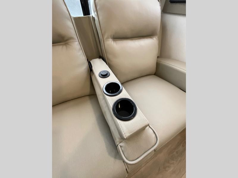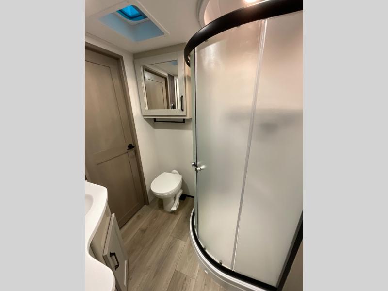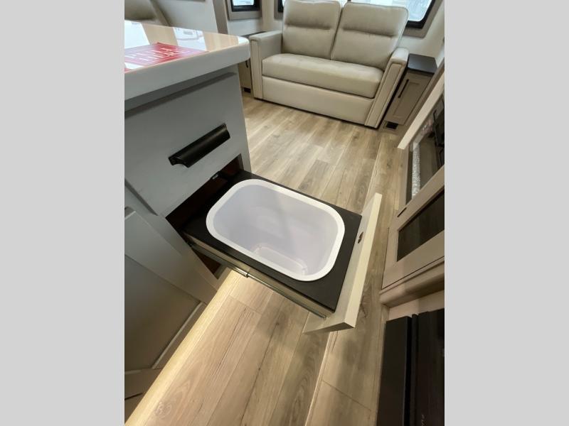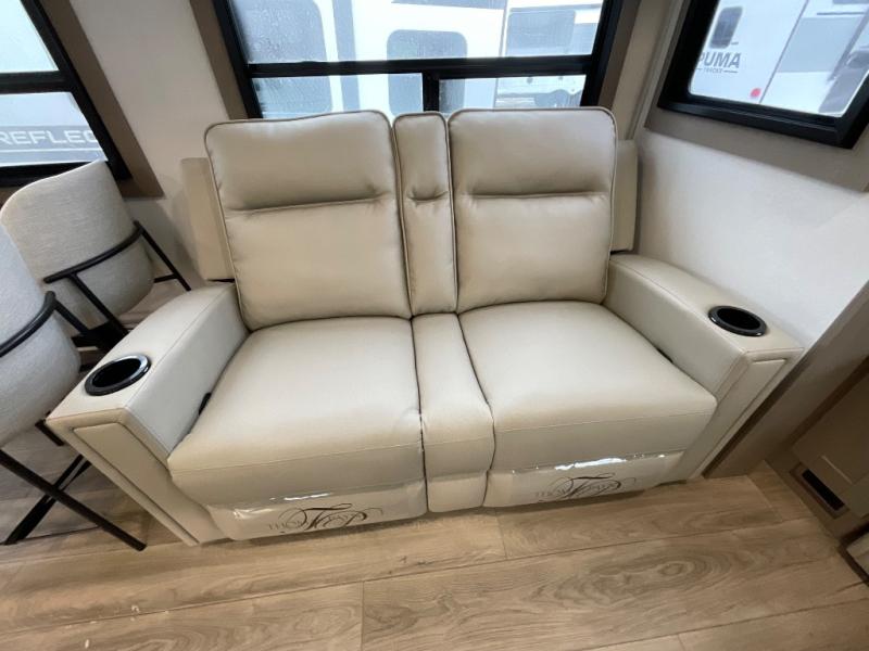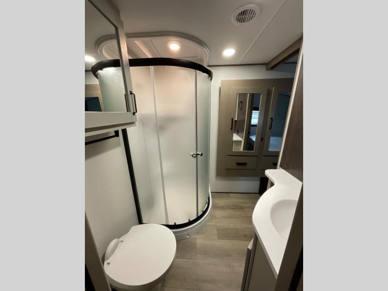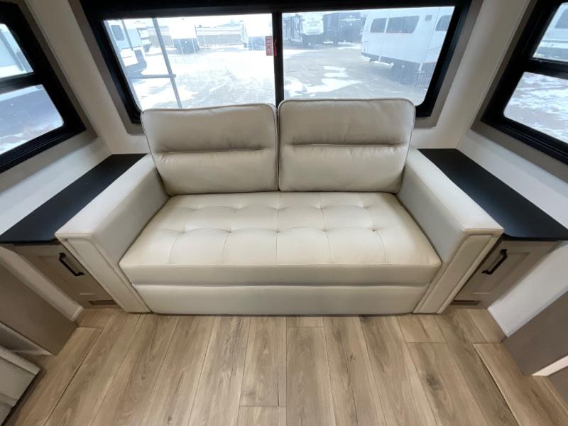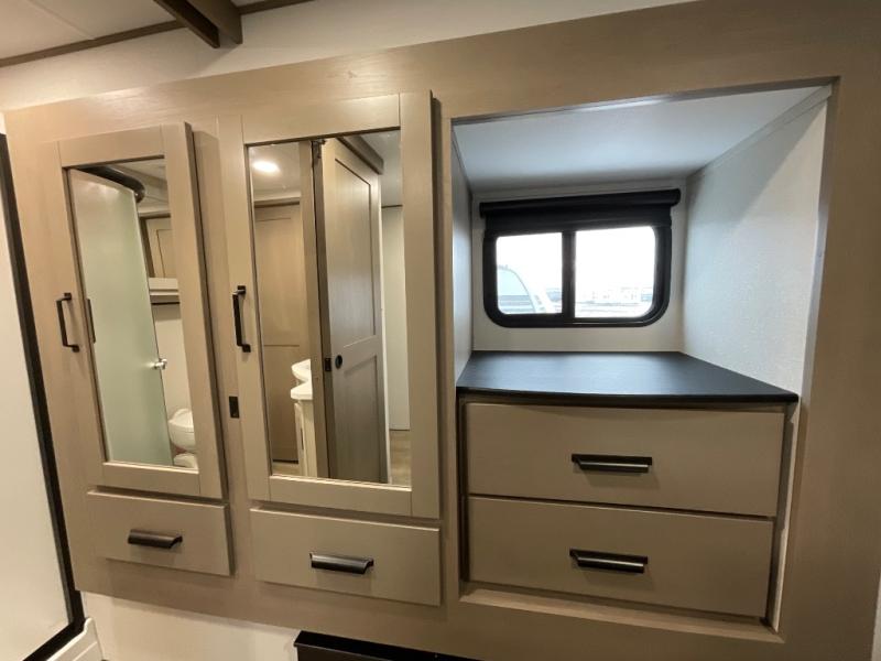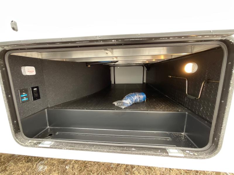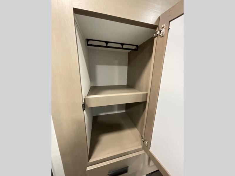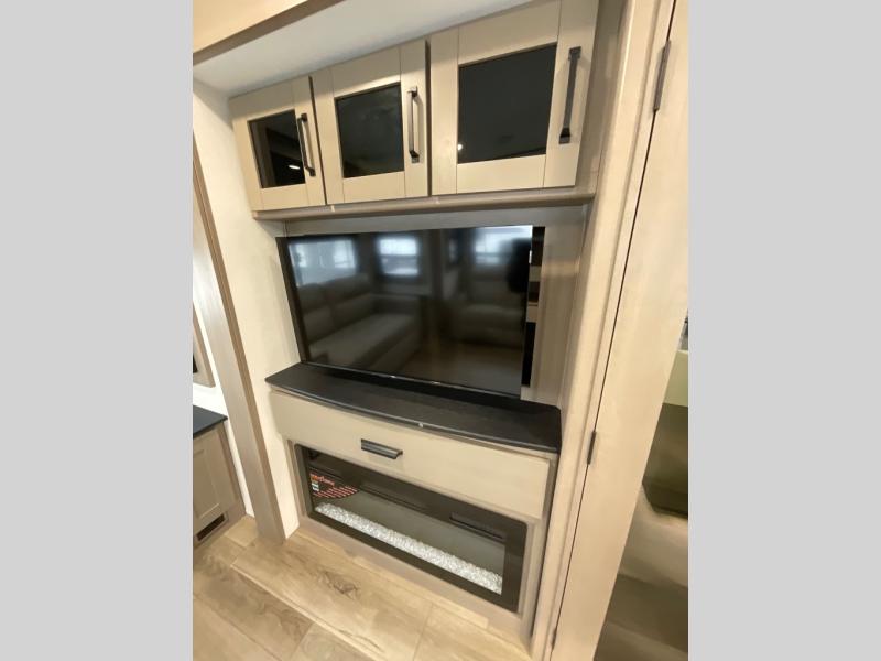 Whether you travel for pleasure or work, you will love the spacious main living and kitchen area with a rear tri-fold sofa that doubles as extra sleeping space, and the theater seating directly across from the entertainment center with a 40" LED HDTV and a fireplace below. The kitchen island will make meal prepping and drying the dishes easier and the hutch is the perfect place to place your picture frames, nice dishes, and extra cooking items. There is even a pantry that is big enough to store all of your favorite snacks, dry ingredients and such. Outside you can enjoy two electric awnings that provide protection from the elements as you relax and visit with other RVers, and your camping chairs can easily be stored in the pass-through compartment. The double entry bathroom is convenient especially at night when you can slide the door to enter from the front master bedroom. You will find plenty of storage for your clothing and gear, plus the bedroom slide out gives you drawers and linen storage that stretches into the full bathroom.