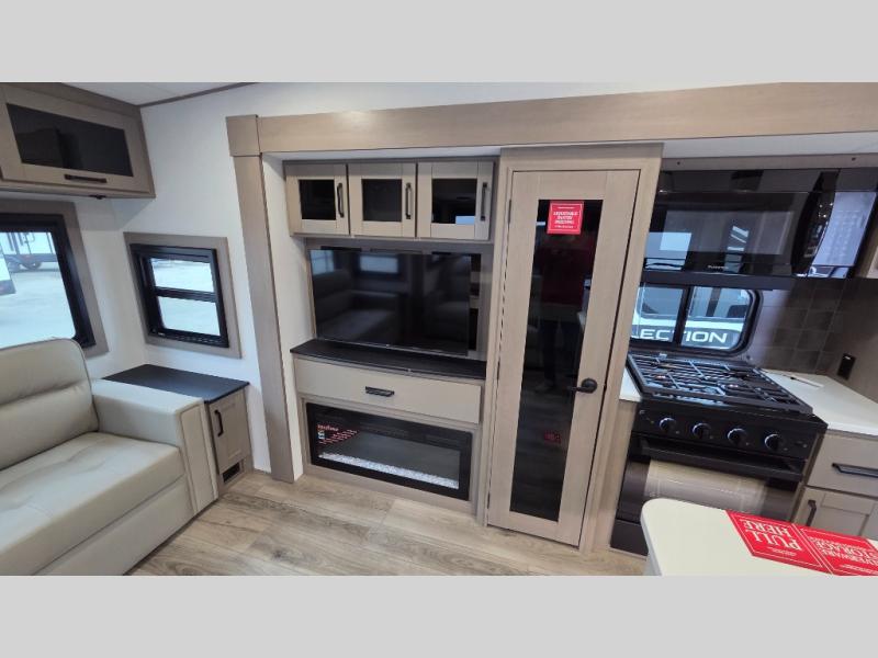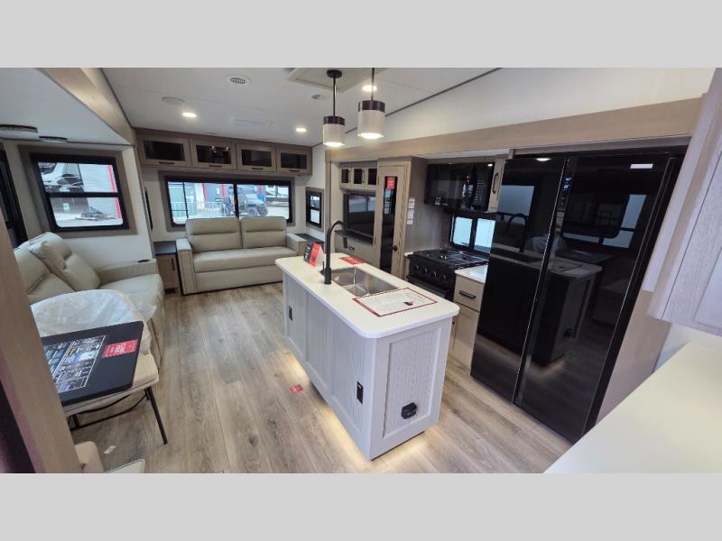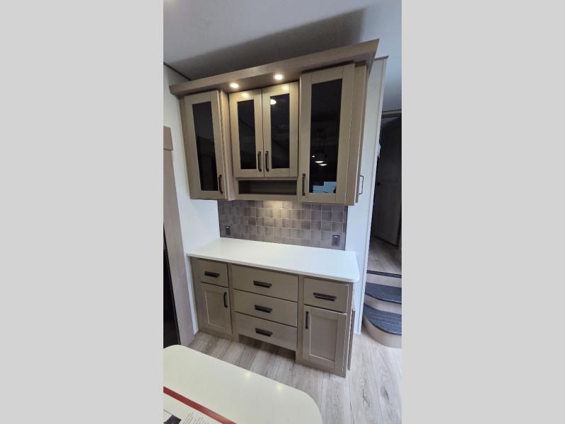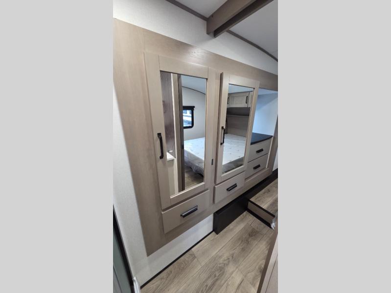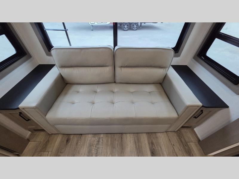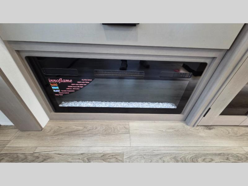 Whether you travel for pleasure or work, you will love the spacious main living and kitchen area with a rear tri-fold sofa that doubles as extra sleeping space, and the theater seating directly across from the entertainment center with a 40" LED HDTV and a fireplace below. The kitchen island will make meal prepping and drying the dishes easier and the hutch is the perfect place to place your picture frames, nice dishes, and extra cooking items. There is even a pantry that is big enough to store all of your favorite snacks, dry ingredients and such. Outside you can enjoy two electric awnings that provide protection from the elements as you relax and visit with other RVers, and your camping chairs can easily be stored in the pass-through compartment. The double entry bathroom is convenient especially at night when you can slide the door to enter from the front master bedroom. You will find plenty of storage for your clothing and gear, plus the bedroom slide out gives you drawers and linen storage that stretches into the full bathroom.