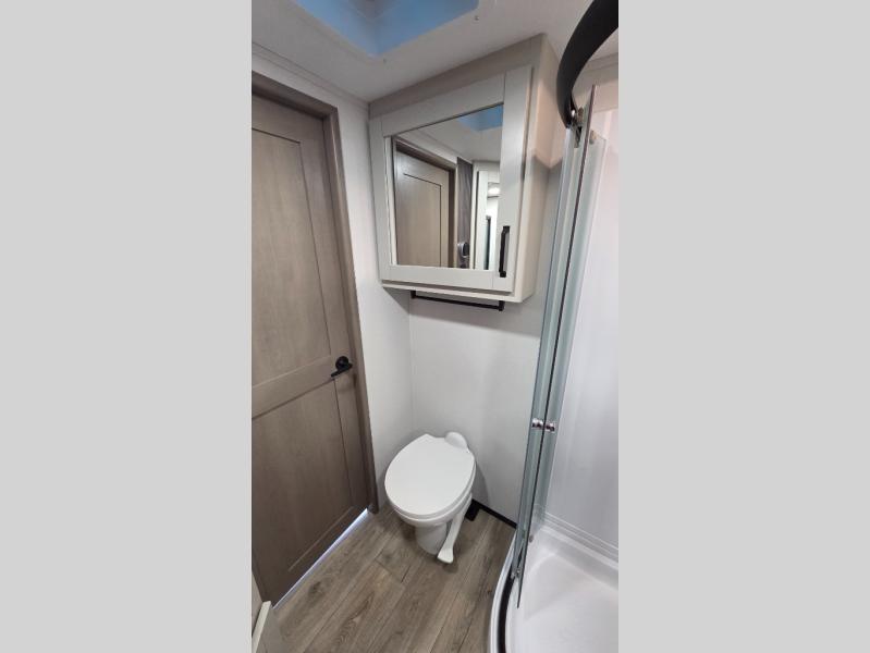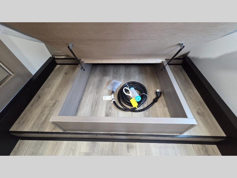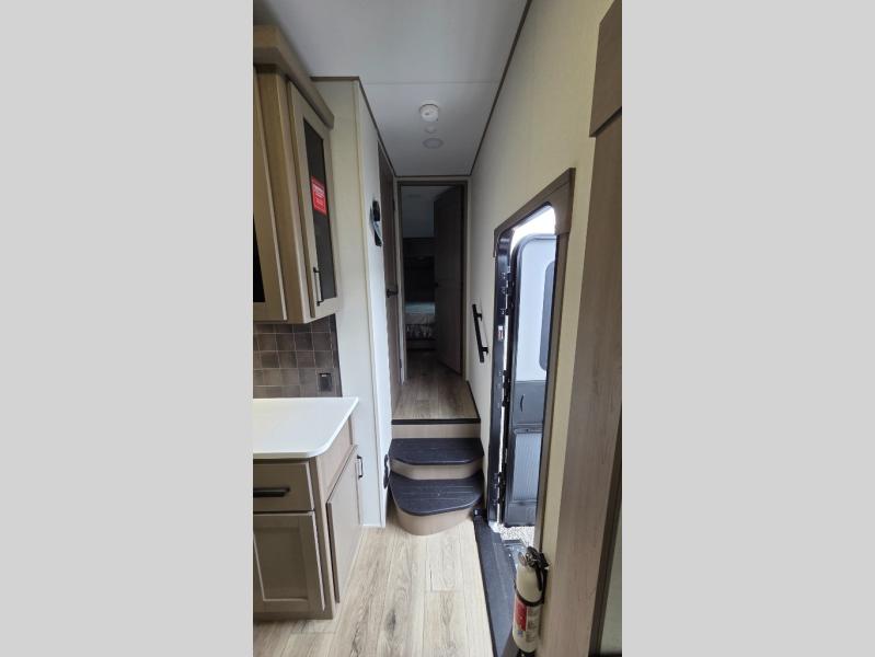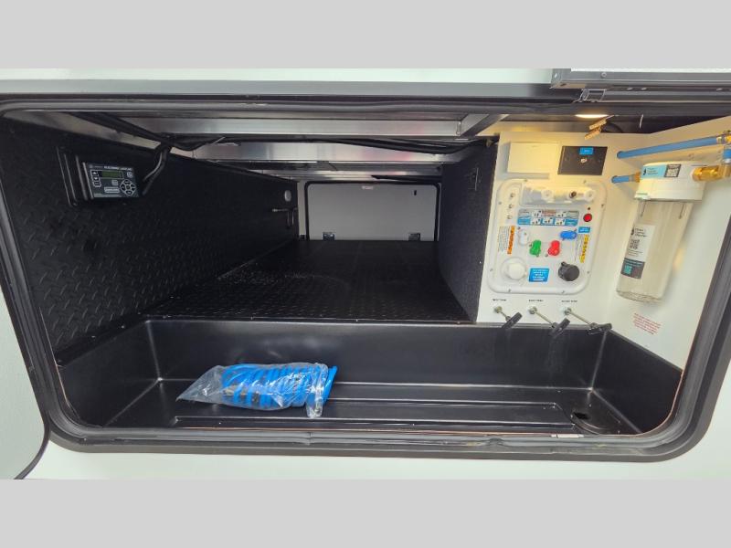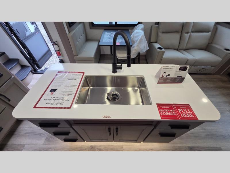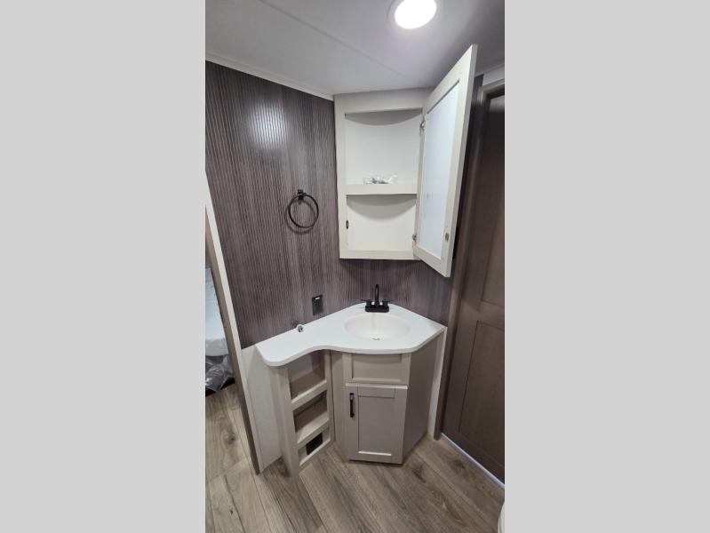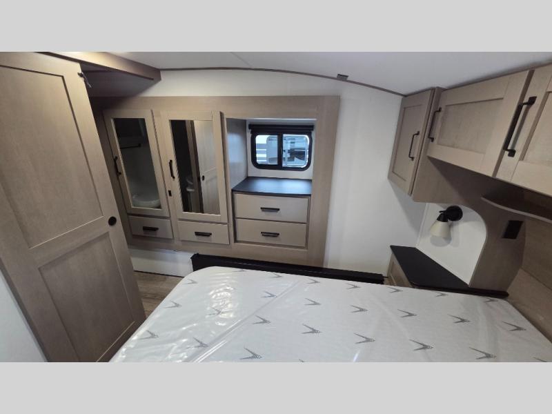 Whether you travel for pleasure or work, you will love the spacious main living and kitchen area with a rear tri-fold sofa that doubles as extra sleeping space, and the theater seating directly across from the entertainment center with a 40" LED HDTV and a fireplace below. The kitchen island will make meal prepping and drying the dishes easier and the hutch is the perfect place to place your picture frames, nice dishes, and extra cooking items. There is even a pantry that is big enough to store all of your favorite snacks, dry ingredients and such. Outside you can enjoy two electric awnings that provide protection from the elements as you relax and visit with other RVers, and your camping chairs can easily be stored in the pass-through compartment. The double entry bathroom is convenient especially at night when you can slide the door to enter from the front master bedroom. You will find plenty of storage for your clothing and gear, plus the bedroom slide out gives you drawers and linen storage that stretches into the full bathroom.