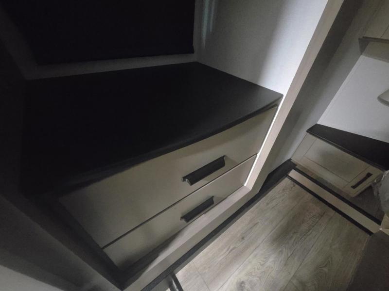 What I liked most: Sturdy aluminum steps feel reassuring and safe. The wood cabinets look great and provide lots of storage. The fireplace looks great right below the entertainment center. I really like the cabinet and nightstand on each side of the bed and the overhead shelf. Also, the leather rectangular piece on the headboard of the bed is a nice touch and makes this a more unique bedroom.