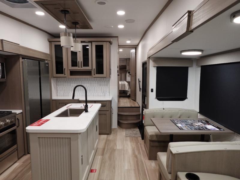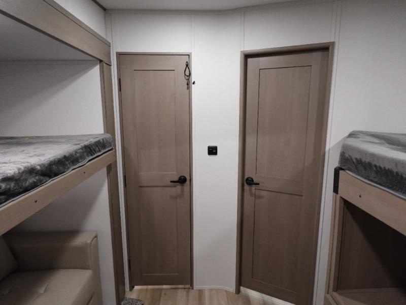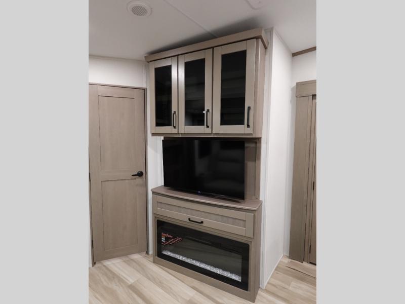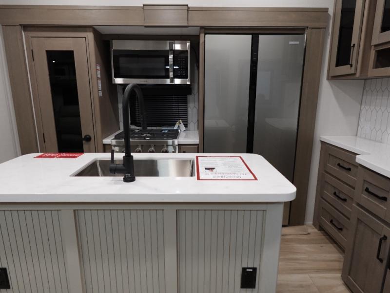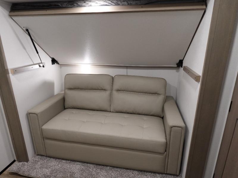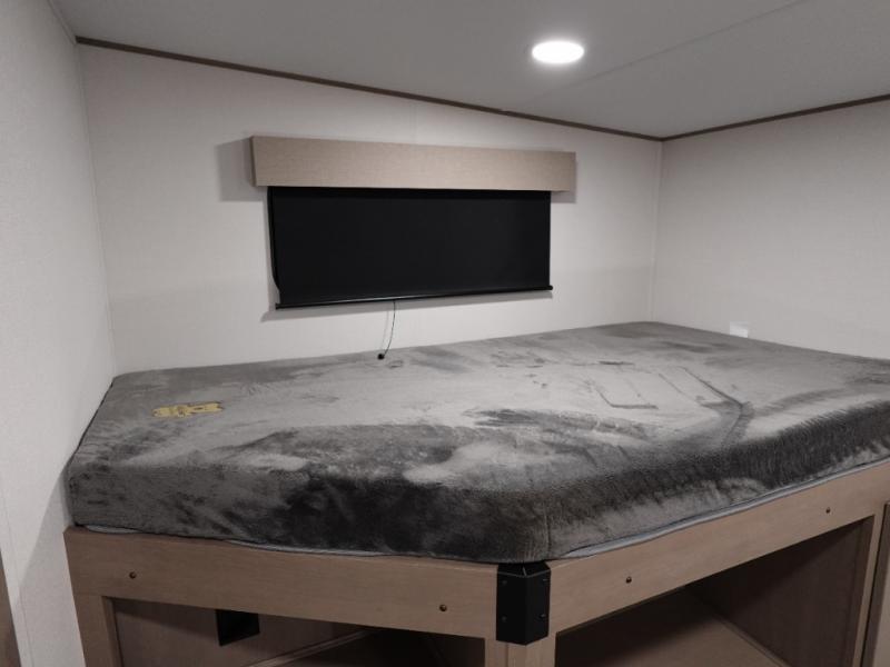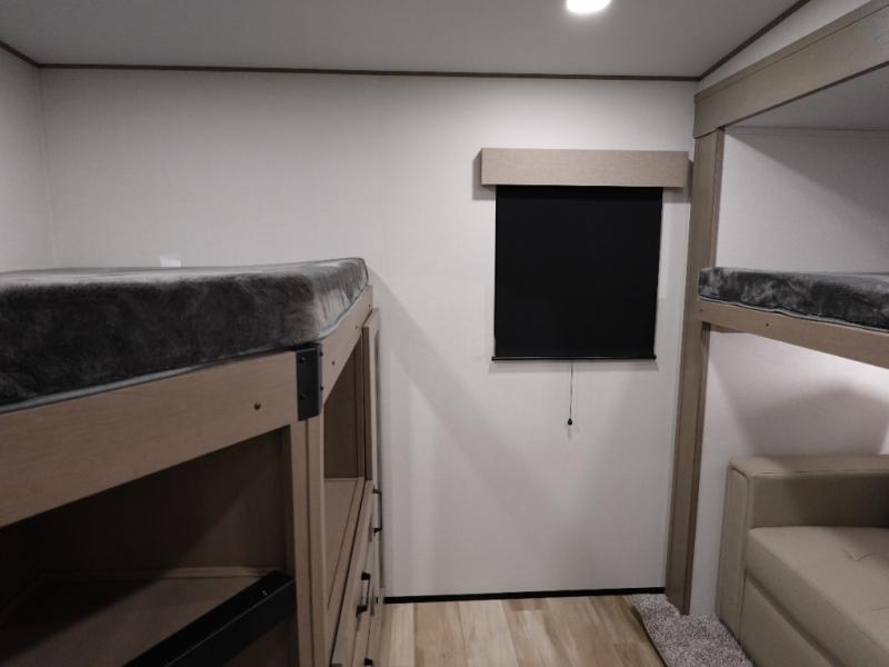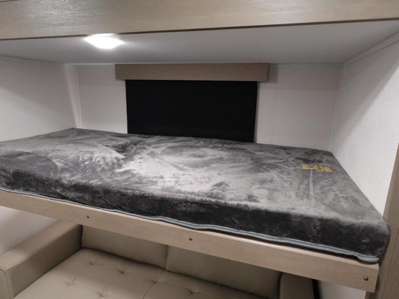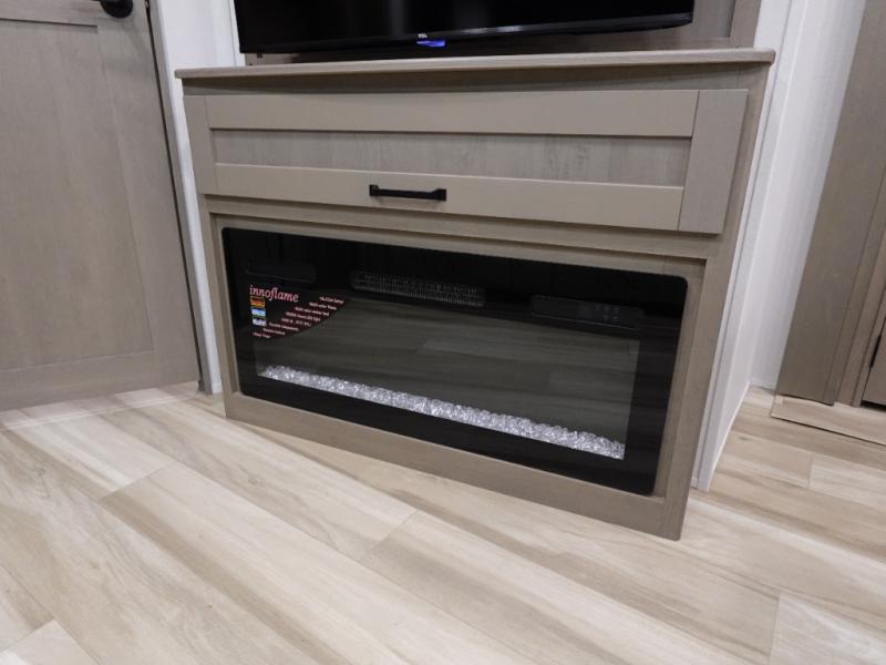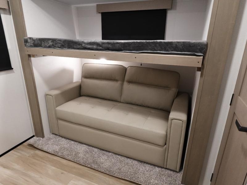 Are you looking to travel with your family and friends and want enough space for everyone to be comfortable? Step inside using the Step Above wit lift assist entry steps, to find a private bunkhouse in the rear of this fifth wheel which offers a slide out flip bunk above a tri-fold sofa, a 44" bunk bed with window and storage below, plus its very own private half bathroom. The theater seating is a great place to unwind at night in front of the entertainment center with a 40" LED HDTV and fireplace below it. There is a dinette , and the kitchen island will provide more counter space to prep meals. You will find full amenities including a 16 cu. ft. 12V refrigerator and a hutch. This fifth wheel also includes a double entry bathroom with a radius shower, and you can wake up refreshed each morning after sleeping on your own bed.