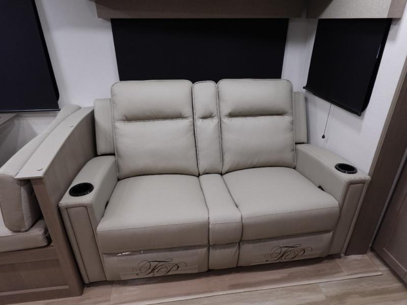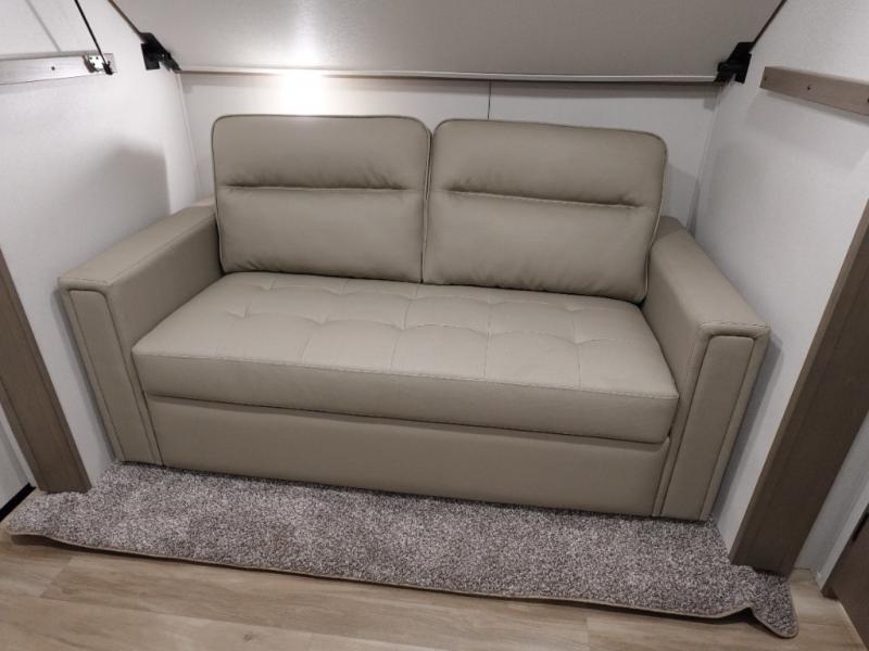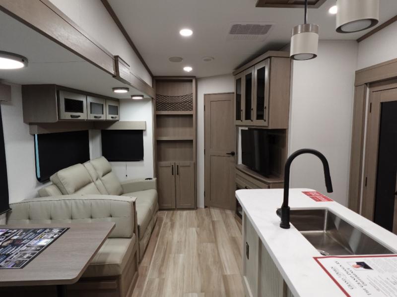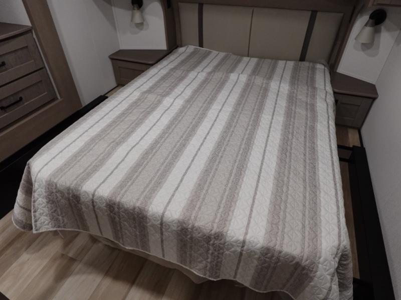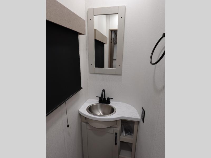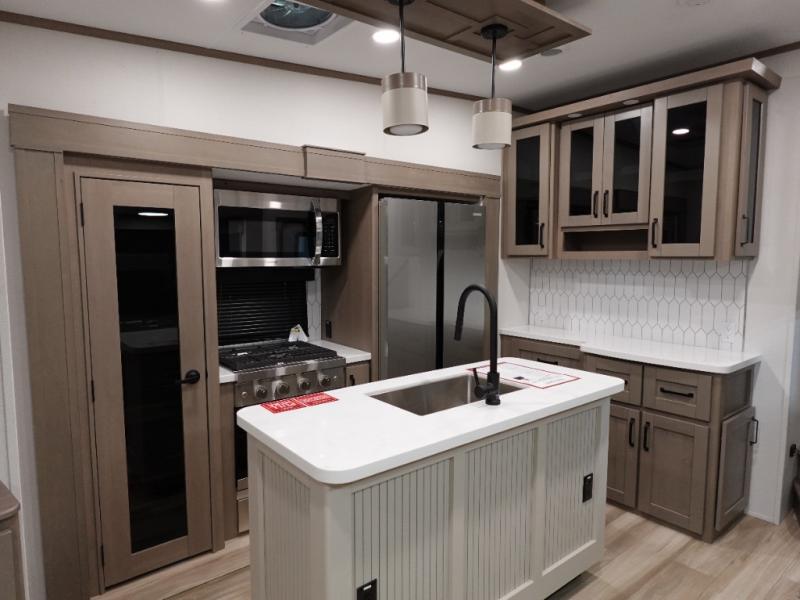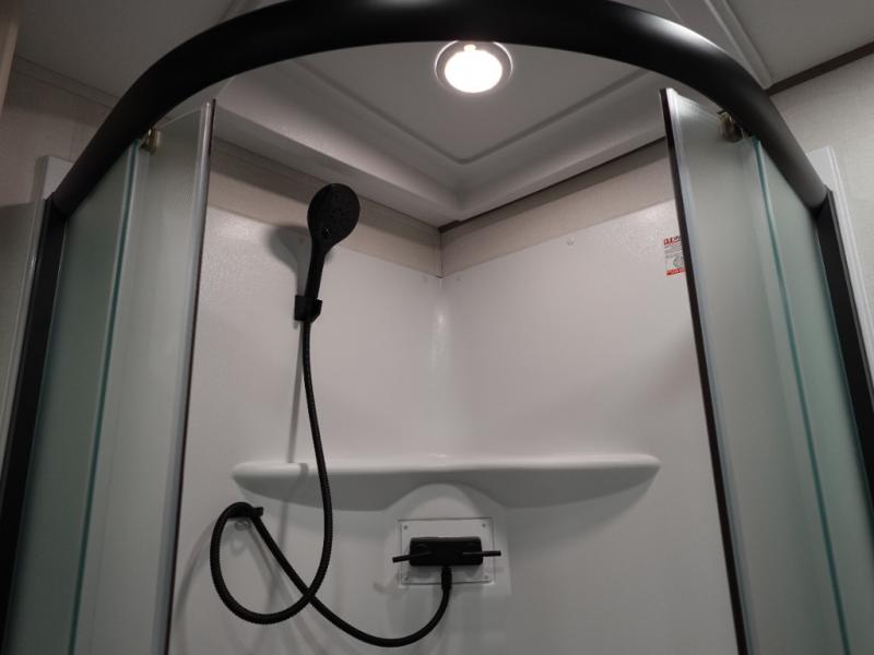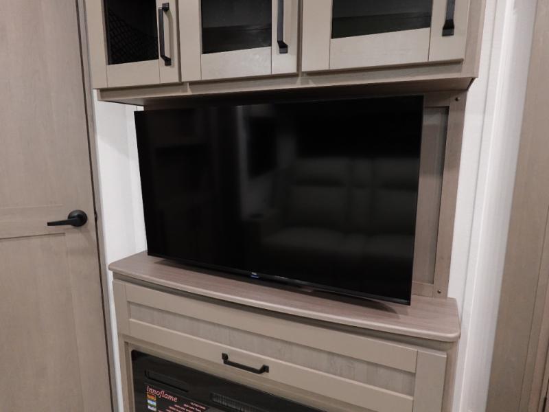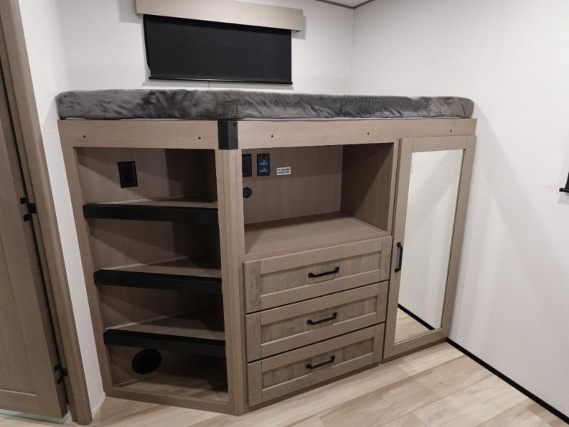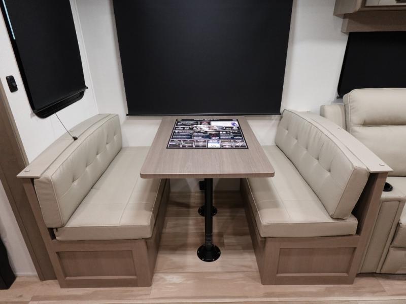 Are you looking to travel with your family and friends and want enough space for everyone to be comfortable? Step inside using the Step Above wit lift assist entry steps, to find a private bunkhouse in the rear of this fifth wheel which offers a slide out flip bunk above a tri-fold sofa, a 44" bunk bed with window and storage below, plus its very own private half bathroom. The theater seating is a great place to unwind at night in front of the entertainment center with a 40" LED HDTV and fireplace below it. There is a dinette , and the kitchen island will provide more counter space to prep meals. You will find full amenities including a 16 cu. ft. 12V refrigerator and a hutch. This fifth wheel also includes a double entry bathroom with a radius shower, and you can wake up refreshed each morning after sleeping on your own bed.