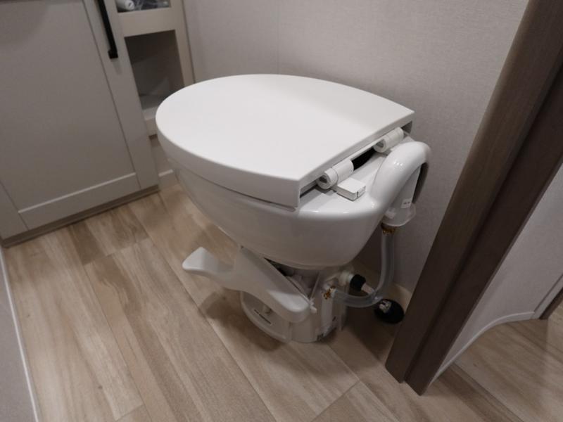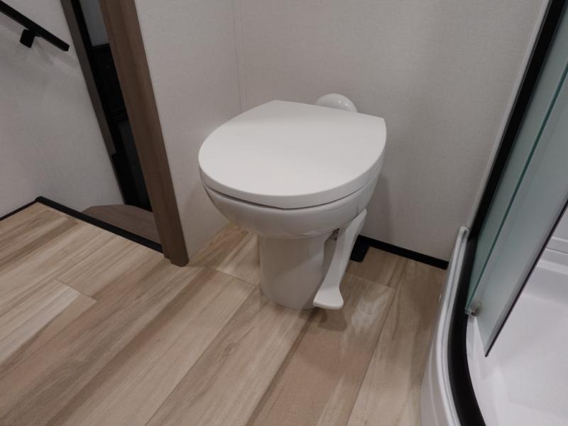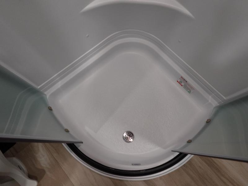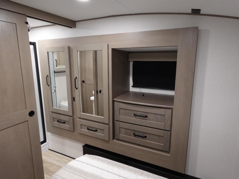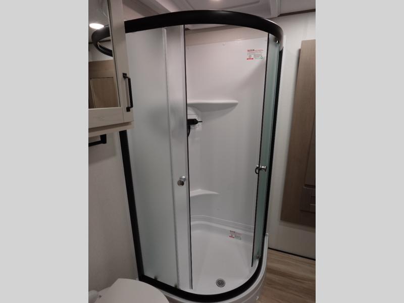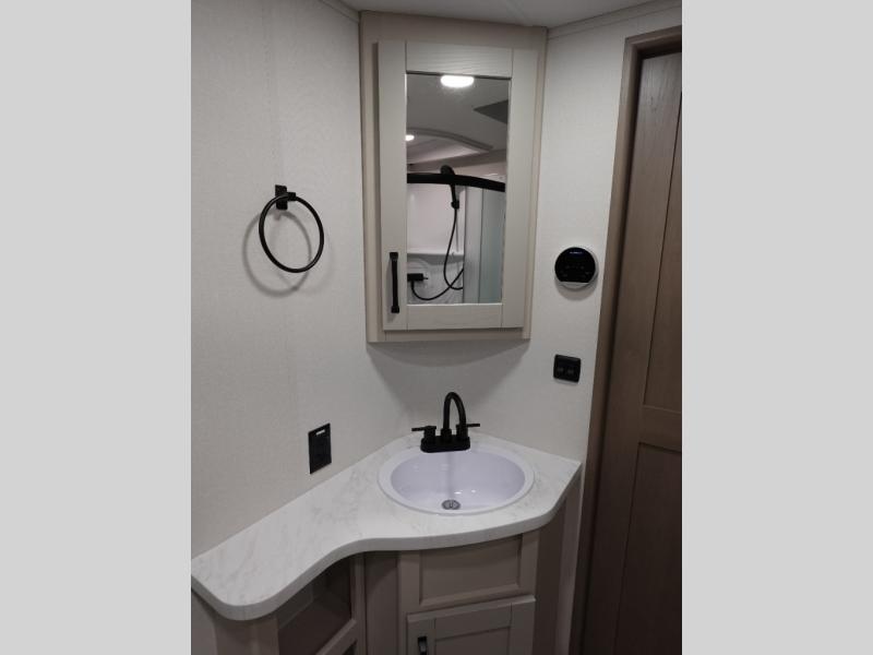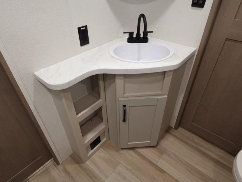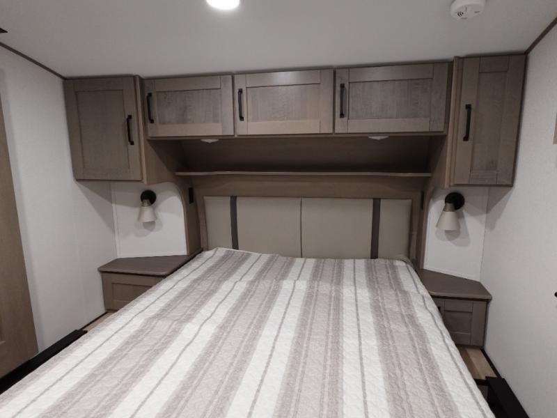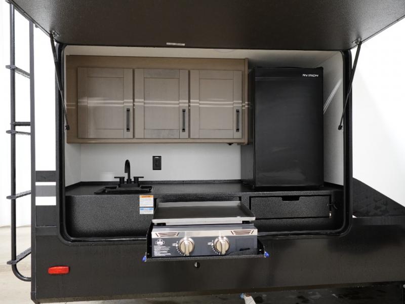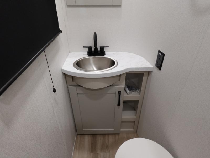 Are you looking to travel with your family and friends and want enough space for everyone to be comfortable? Step inside using the Step Above wit lift assist entry steps, to find a private bunkhouse in the rear of this fifth wheel which offers a slide out flip bunk above a tri-fold sofa, a 44" bunk bed with window and storage below, plus its very own private half bathroom. The theater seating is a great place to unwind at night in front of the entertainment center with a 40" LED HDTV and fireplace below it. There is a dinette , and the kitchen island will provide more counter space to prep meals. You will find full amenities including a 16 cu. ft. 12V refrigerator and a hutch. This fifth wheel also includes a double entry bathroom with a radius shower, and you can wake up refreshed each morning after sleeping on your own bed.