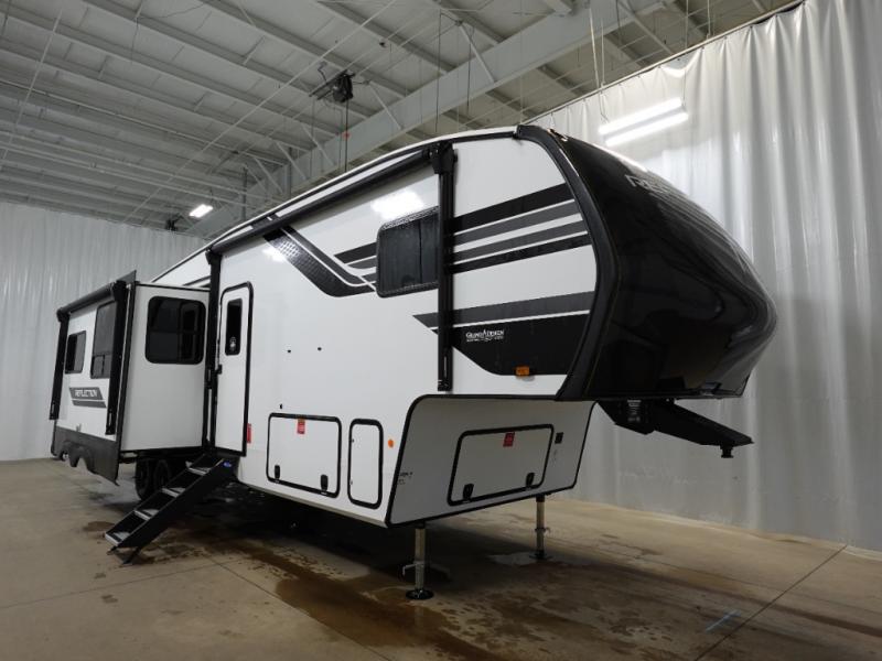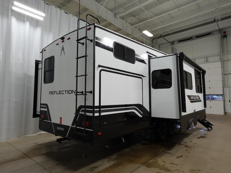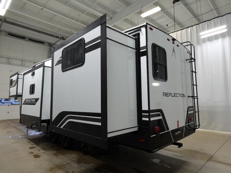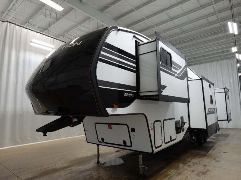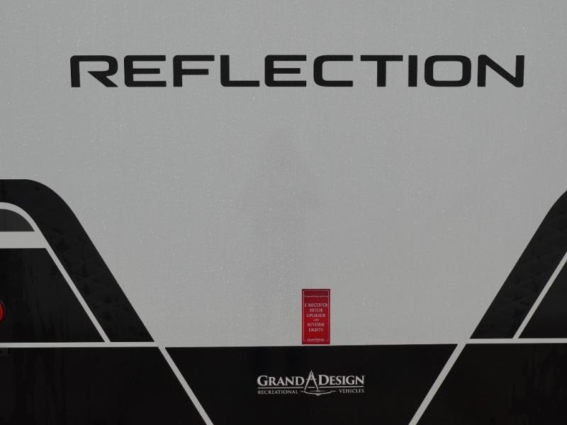 With any Reflection fifth wheel by Grand Design, you will have a solar panel for off-grid camping and a 60 amp charge controller and inverter prep, a Universal All-In-One docking station, unobstructed pass-through storage, and Goodyear Endurance tires. Each is constructed of gel coat exterior sidewalls, residential 5" truss rafters, walk-on roof decking, a fiberglass and radiant foil roof and front cap insulation plus laminated aluminum framed side walls, roof and end walls in slide rooms. Head inside to enjoy residential hardwood cabinet doors, premium Congoleum flooring, a spacious shower with a glass door, and many more comforts!