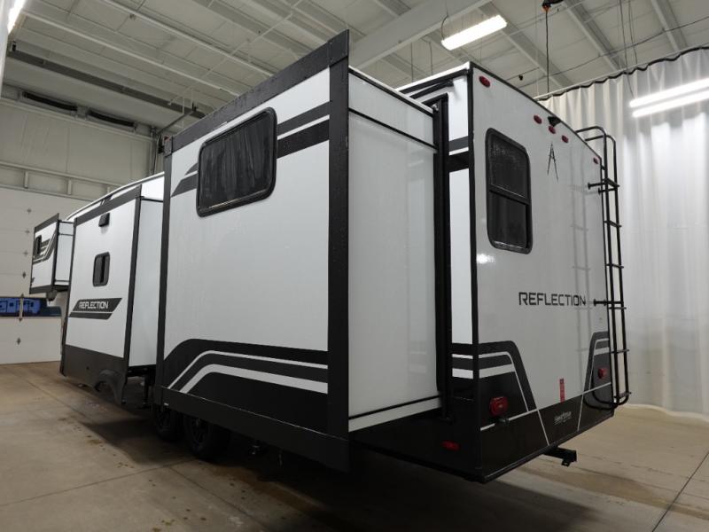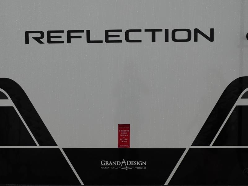 With any Reflection fifth wheel by Grand Design, you will have a solar panel for off-grid camping and a 60 amp charge controller and inverter prep, a Universal All-In-One docking station, unobstructed pass-through storage, and Goodyear Endurance tires. Each is constructed of gel coat exterior sidewalls, residential 5" truss rafters, walk-on roof decking, a fiberglass and radiant foil roof and front cap insulation plus laminated aluminum framed side walls, roof and end walls in slide rooms. Head inside to enjoy residential hardwood cabinet doors, premium Congoleum flooring, a spacious shower with a glass door, and many more comforts!