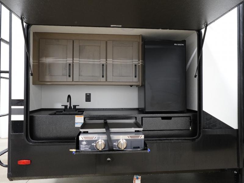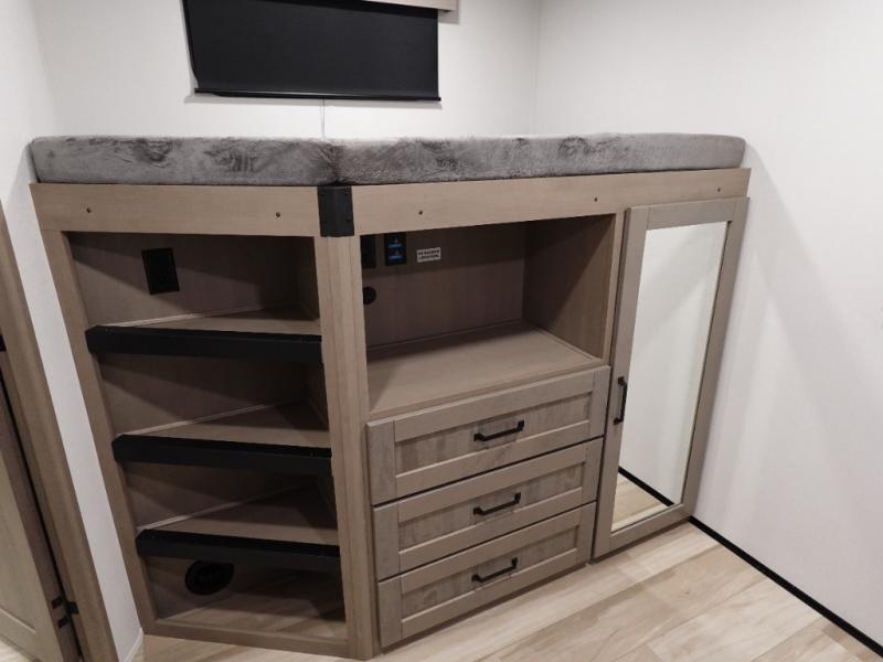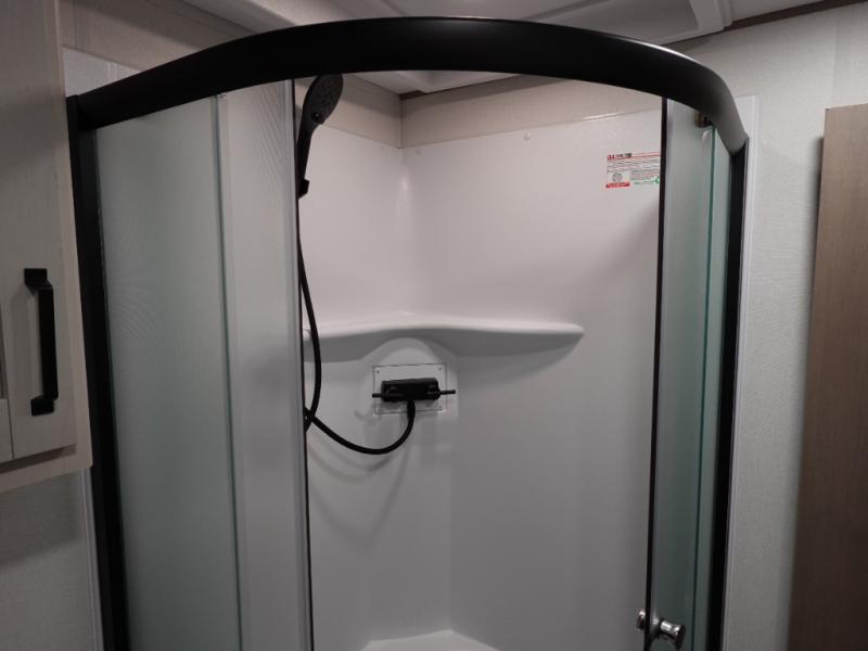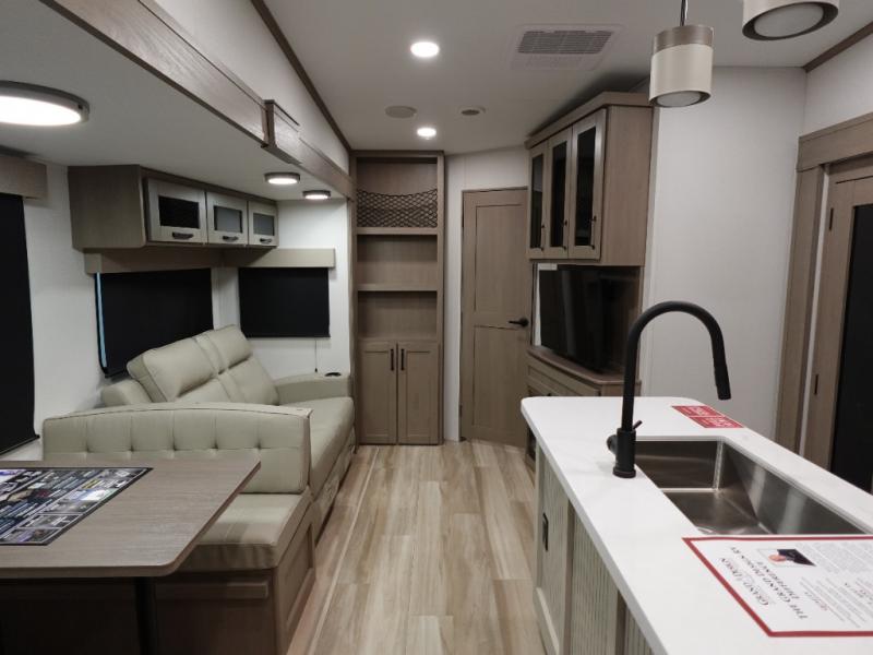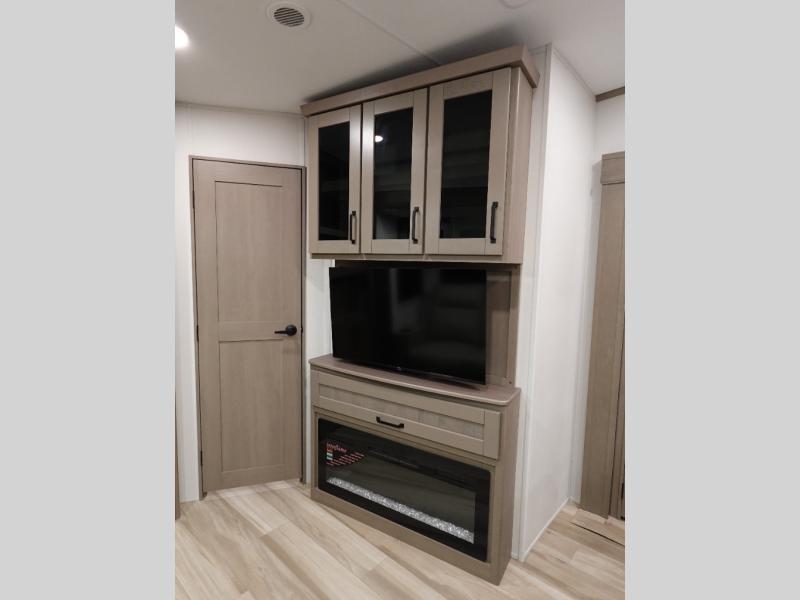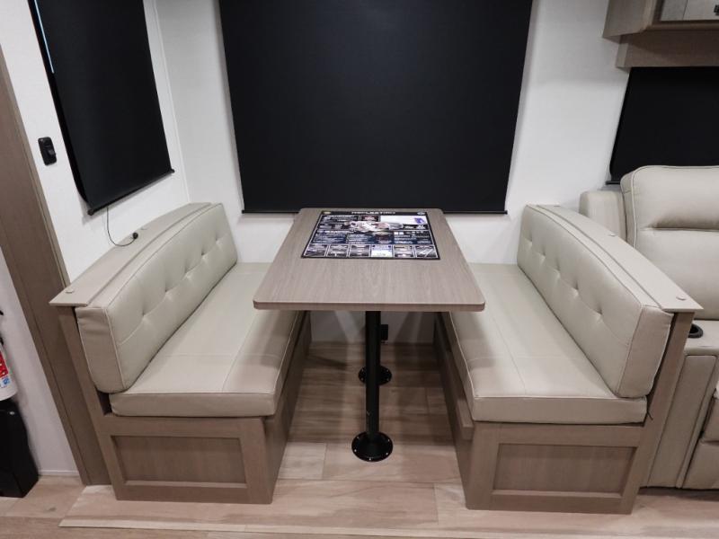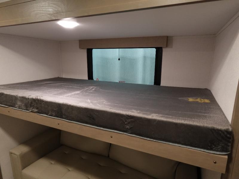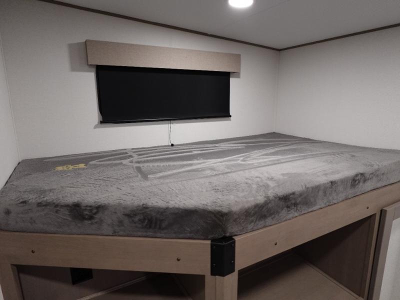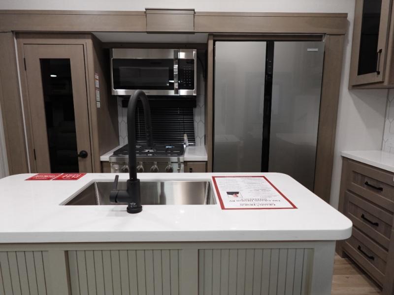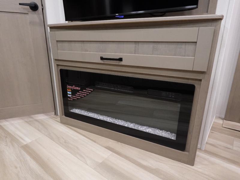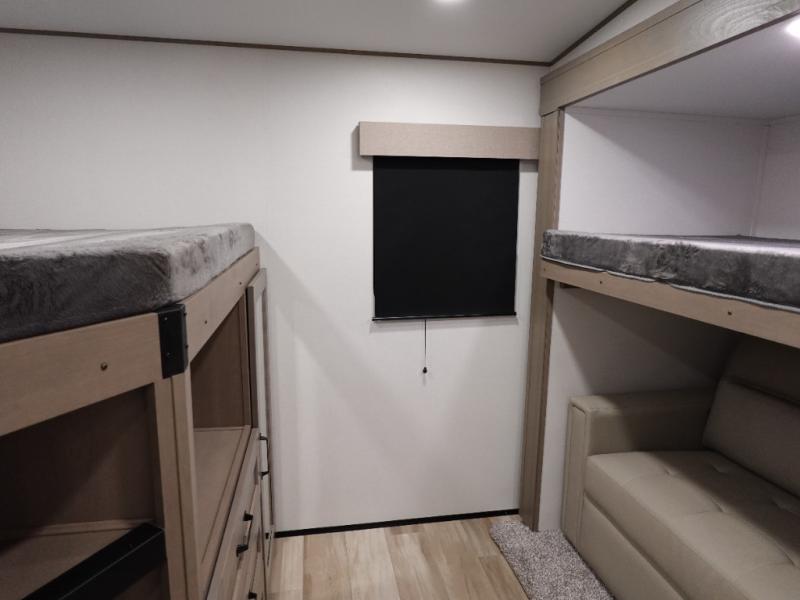 Are you looking to travel with your family and friends and want enough space for everyone to be comfortable? Step inside using the Step Above wit lift assist entry steps, to find a private bunkhouse in the rear of this fifth wheel which offers a slide out flip bunk above a tri-fold sofa, a 44" bunk bed with window and storage below, plus its very own private half bathroom. The theater seating or tri-fold sofa option is a great place to unwind at night in front of the entertainment center with a 40" LED HDTV and fireplace below it. There is a booth dinette or you can a swivel dinette option to dine at, and the kitchen island will provide more counter space to prep meals. You will find full amenities including a 16 cu. ft. 12V refrigerator and a hutch. This fifth wheel also includes a double entry bathroom with a radius shower, and you can wake up refreshed each morning after sleeping on your own queen bed.