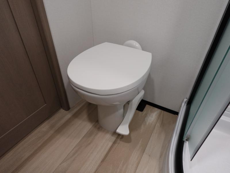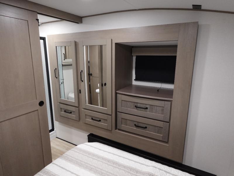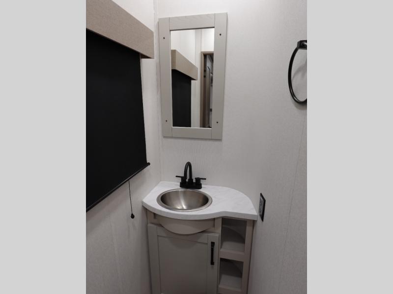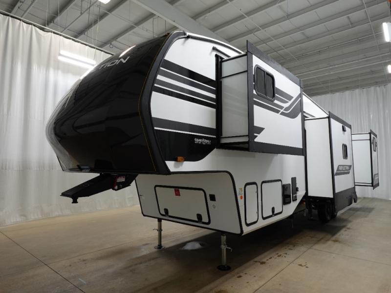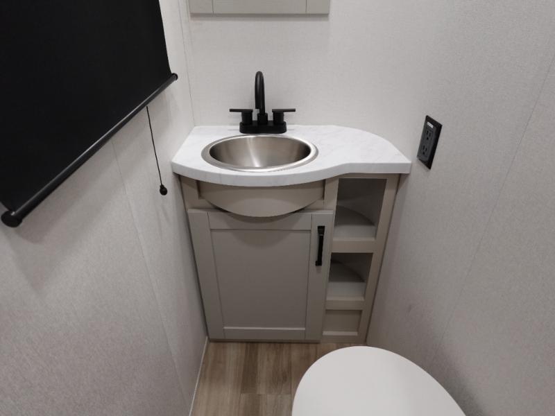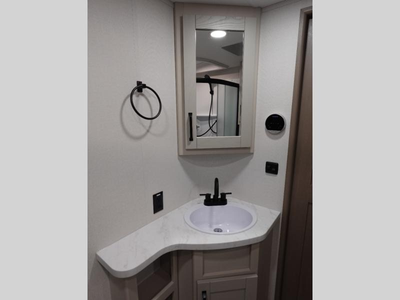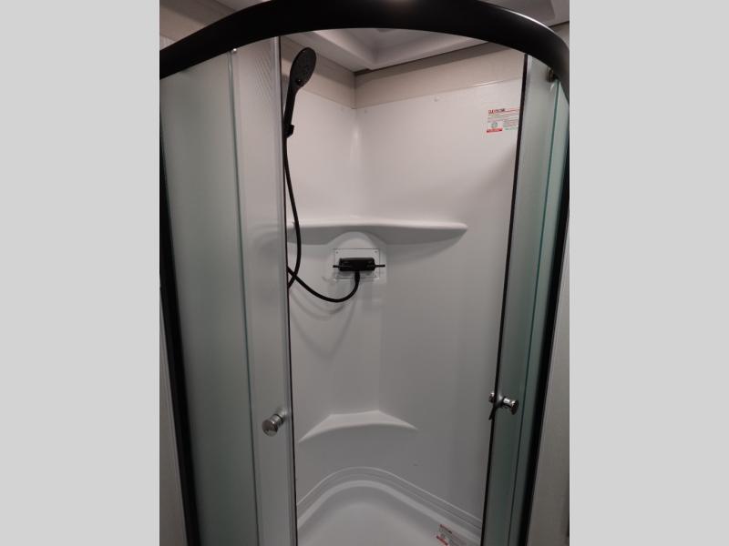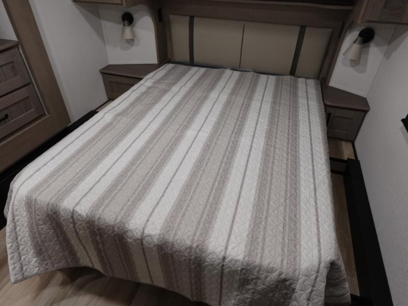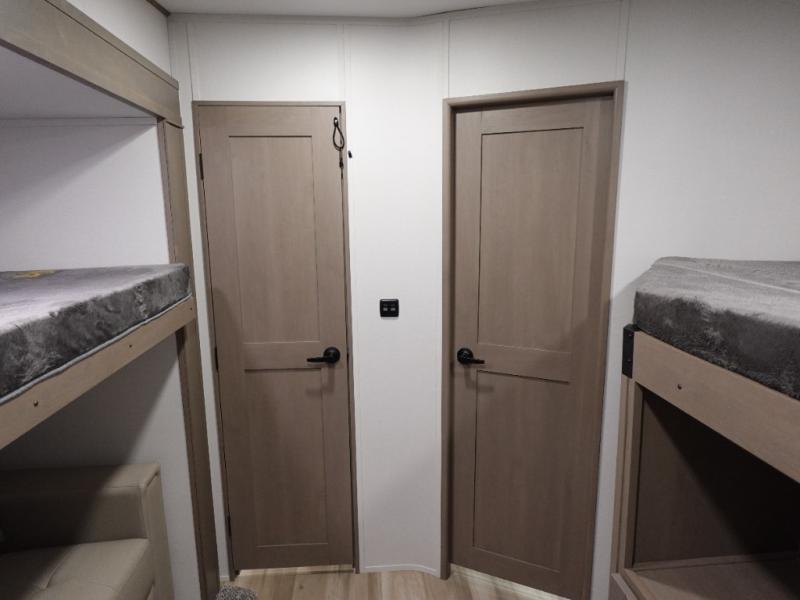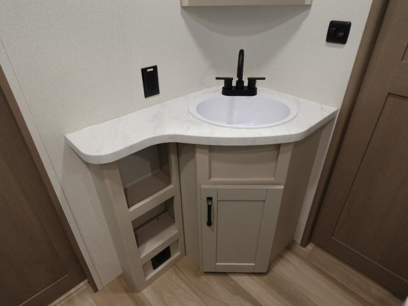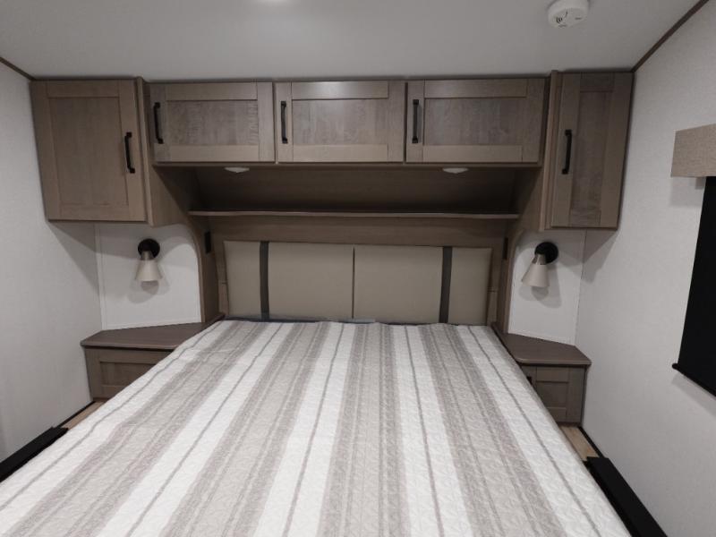 Are you looking to travel with your family and friends and want enough space for everyone to be comfortable? Step inside using the Step Above wit lift assist entry steps, to find a private bunkhouse in the rear of this fifth wheel which offers a slide out flip bunk above a tri-fold sofa, a 44" bunk bed with window and storage below, plus its very own private half bathroom. The theater seating or tri-fold sofa option is a great place to unwind at night in front of the entertainment center with a 40" LED HDTV and fireplace below it. There is a booth dinette or you can a swivel dinette option to dine at, and the kitchen island will provide more counter space to prep meals. You will find full amenities including a 16 cu. ft. 12V refrigerator and a hutch. This fifth wheel also includes a double entry bathroom with a radius shower, and you can wake up refreshed each morning after sleeping on your own queen bed.
