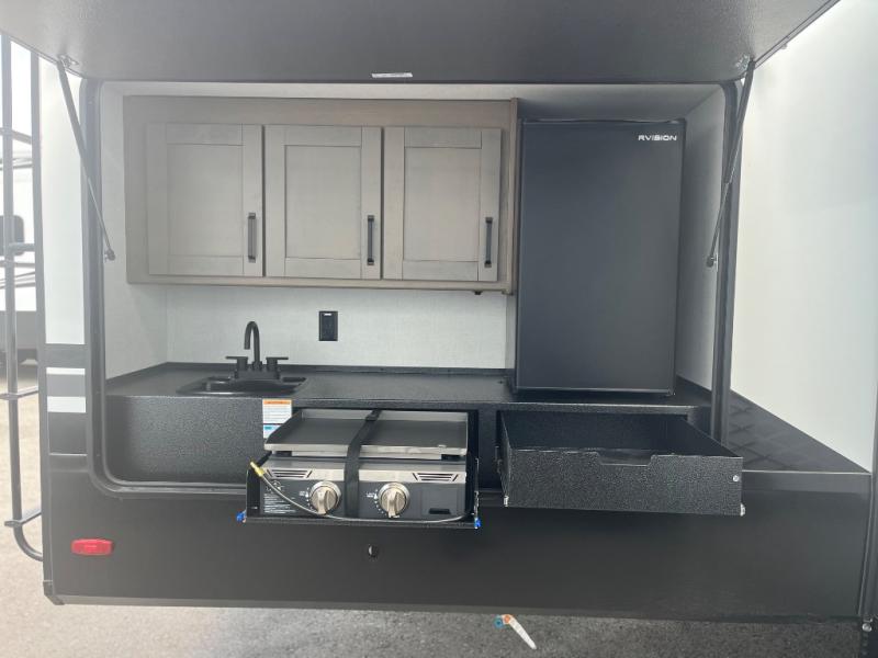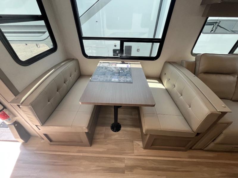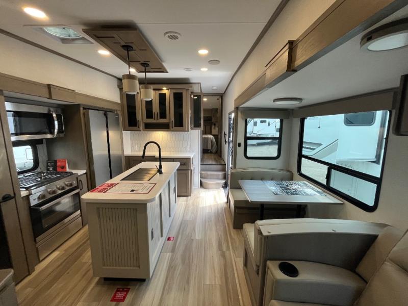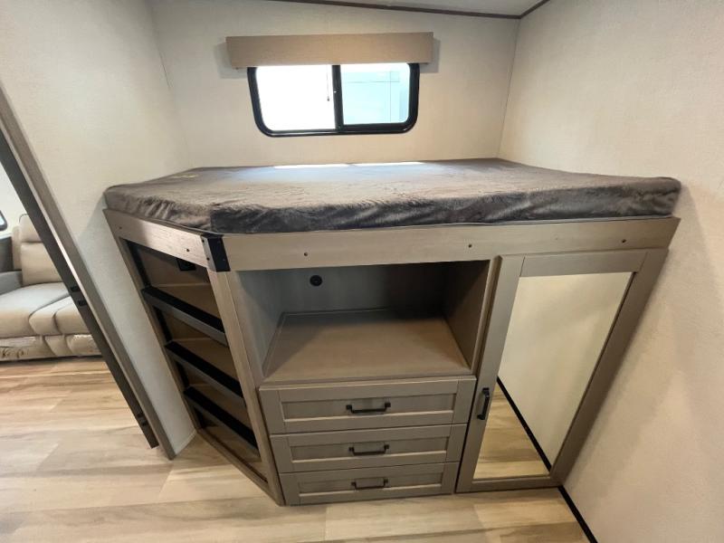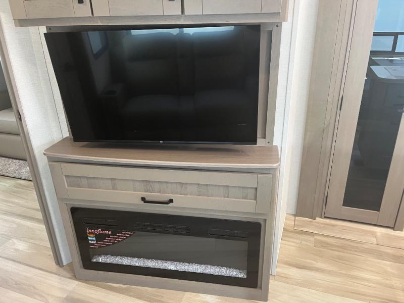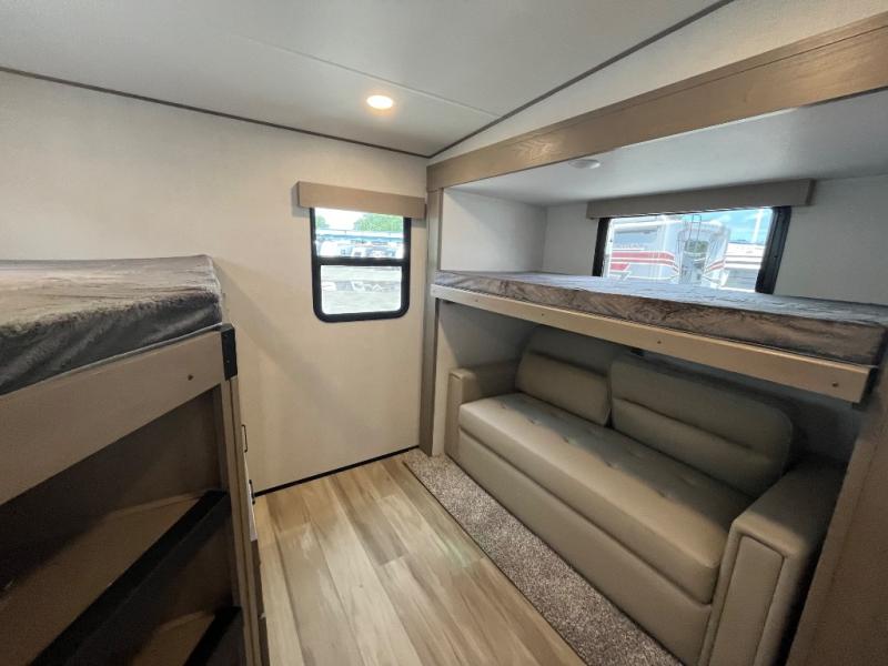 Are you looking to travel with your family and friends and want enough space for everyone to be comfortable? Step inside using the Step Above wit lift assist entry steps, to find a private bunkhouse in the rear of this fifth wheel which offers a slide out flip bunk above a tri-fold sofa, a 44" bunk bed with window and storage below, plus its very own private half bathroom. The theater seating or tri-fold sofa option is a great place to unwind at night in front of the entertainment center with a 40" LED HDTV and fireplace below it. There is a booth dinette or you can a swivel dinette option to dine at, and the kitchen island will provide more counter space to prep meals. You will find full amenities including a 16 cu. ft. 12V refrigerator and a hutch. This fifth wheel also includes a double entry bathroom with a radius shower, and you can wake up refreshed each morning after sleeping on your own queen bed.